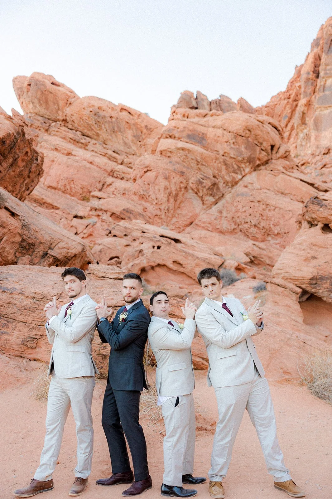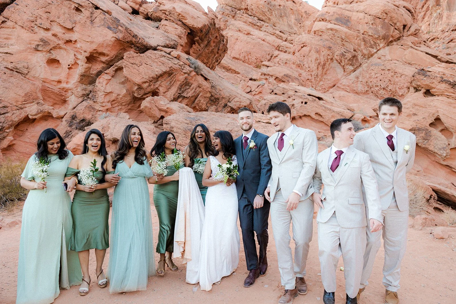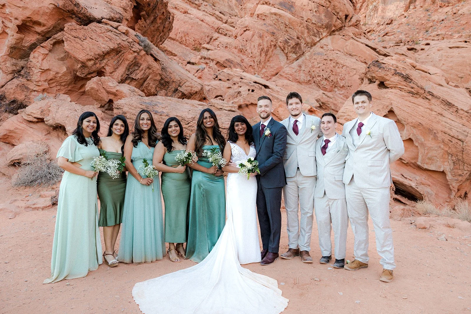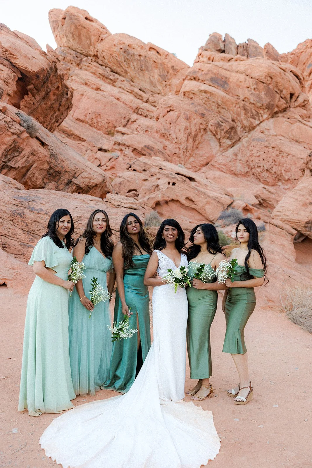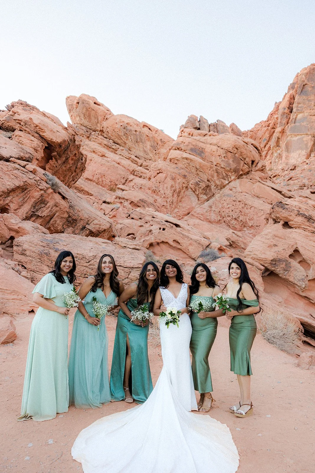 Picture this: warm golden sunlight, dramatic red rock formations, and a couple so in love they couldn’t stop smiling. That was Liya and David’s ceremony! Liya looked absolutely stunning in her lace gown, and her bridesmaids brought the vibes with mismatched green dresses that popped beautifully against the desert backdrop. Meanwhile, David and his groomsmen kept things classy but also made sure to sneak in a few hilarious poses. Because why not?