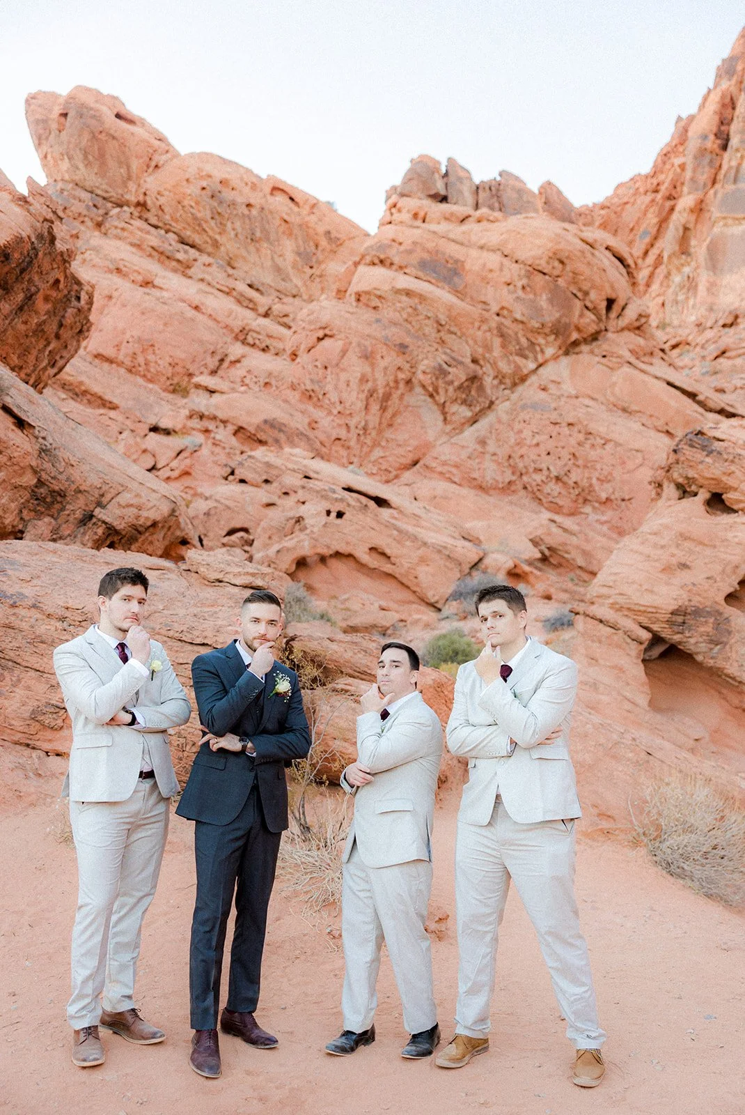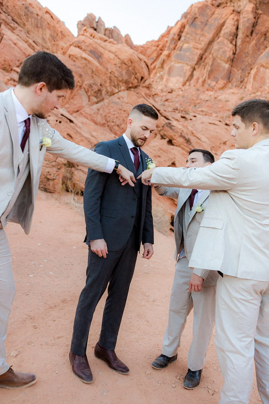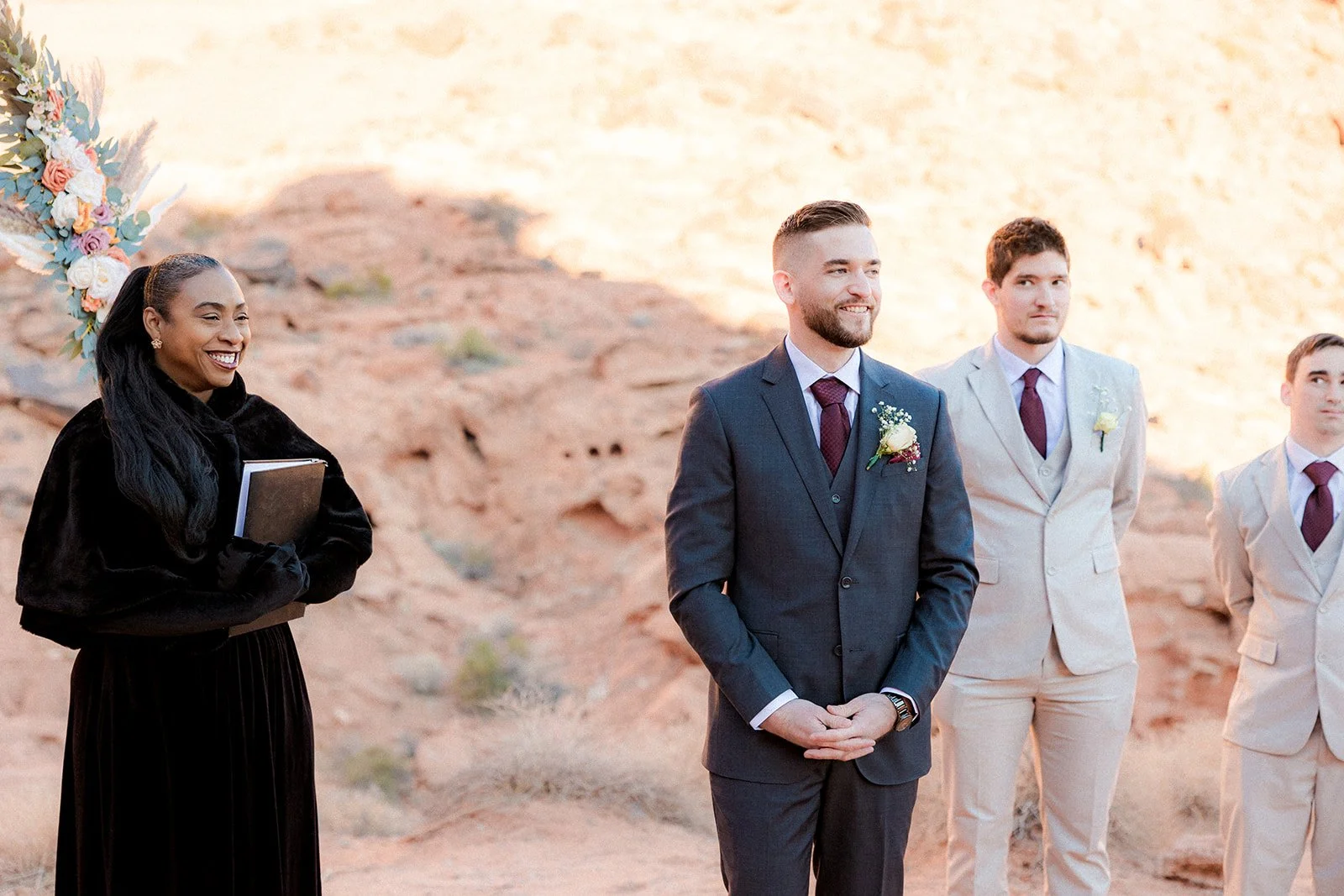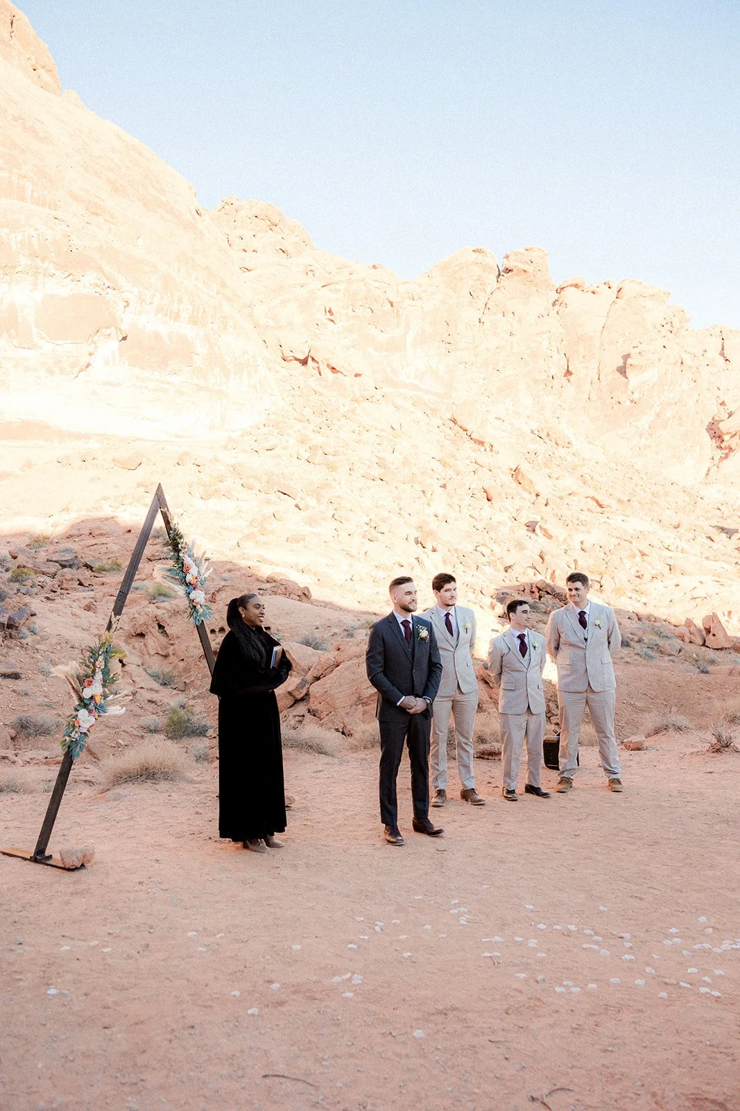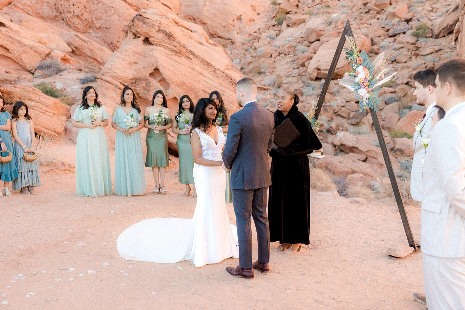 Picture this: warm golden sunlight, dramatic red rock formations, and a couple so in love they couldn’t stop smiling. That was Liya and David’s ceremony! Liya looked absolutely stunning in her lace gown, and her bridesmaids brought the vibes with mismatched green dresses that popped beautifully against the desert backdrop. Meanwhile, David and his groomsmen kept things classy but also made sure to sneak in a few hilarious poses. Because why not?