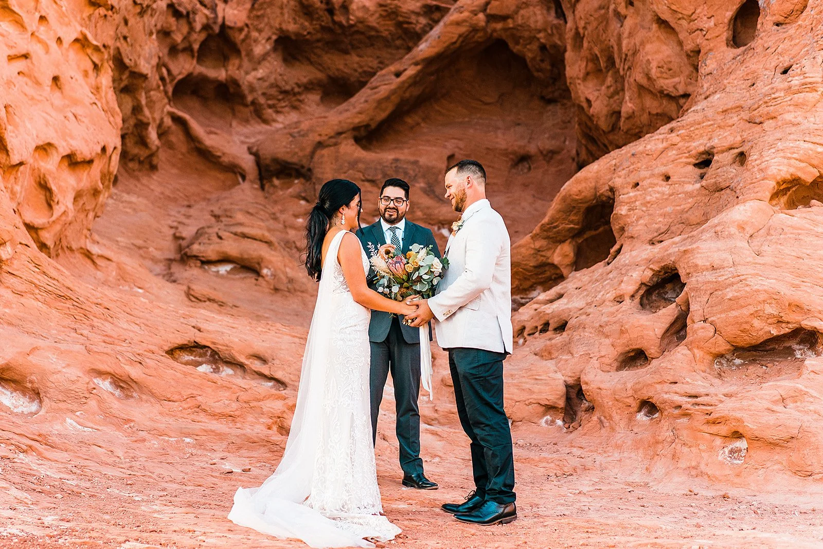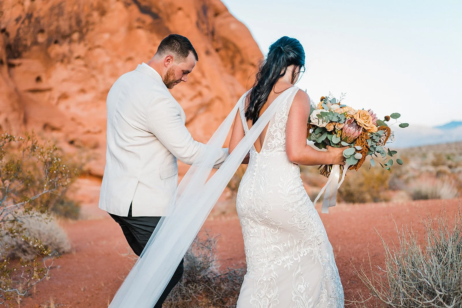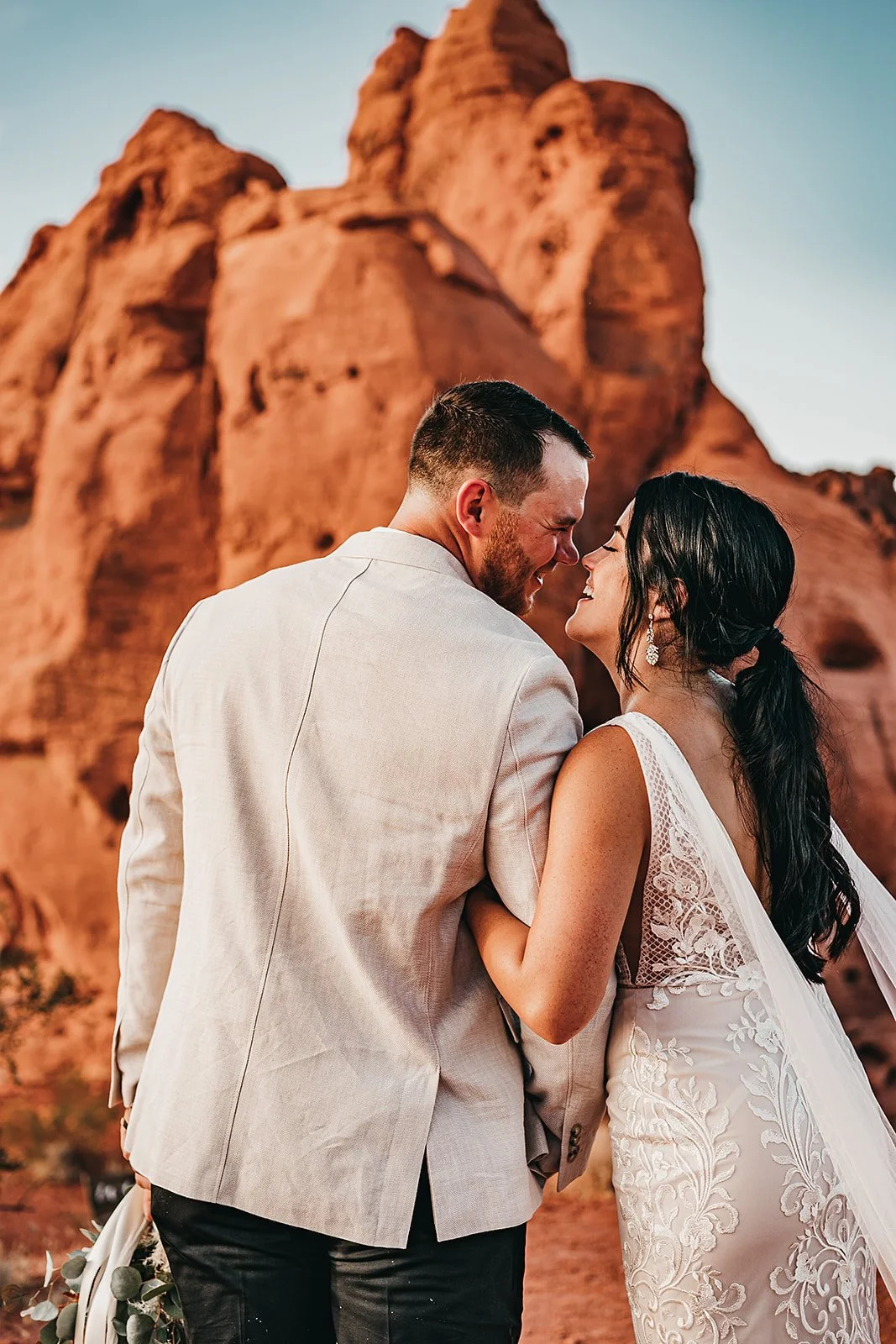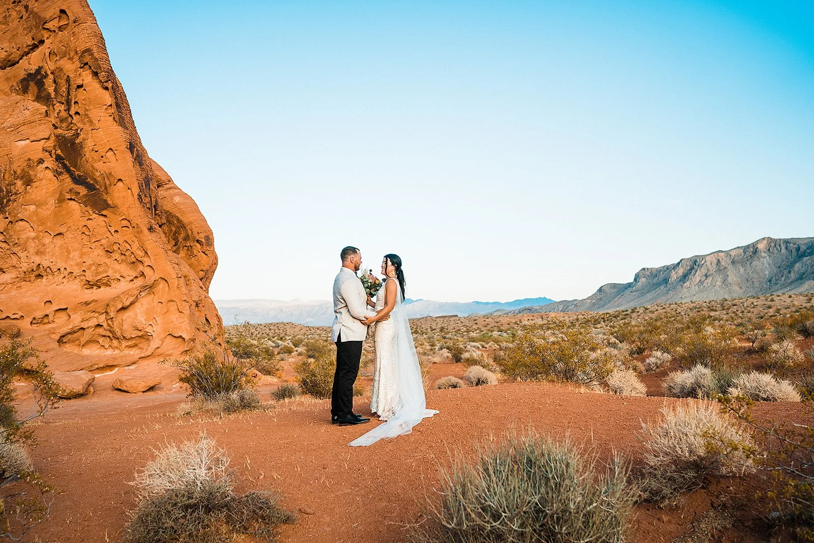 Their chosen venue? The breathtaking Seven Sisters at Valley of Fire, a stunning backdrop that perfectly complemented their vibrant love story. But pulling off an off-the-grid elopement in the blazing Nevada heat wasn’t easy – that’s where Elopement Las Vegas came in, swooping in to coordinate every detail, from securing permits to arranging transportation and vendors, ensuring an all-inclusive elopement experience that was nothing short of magical.
