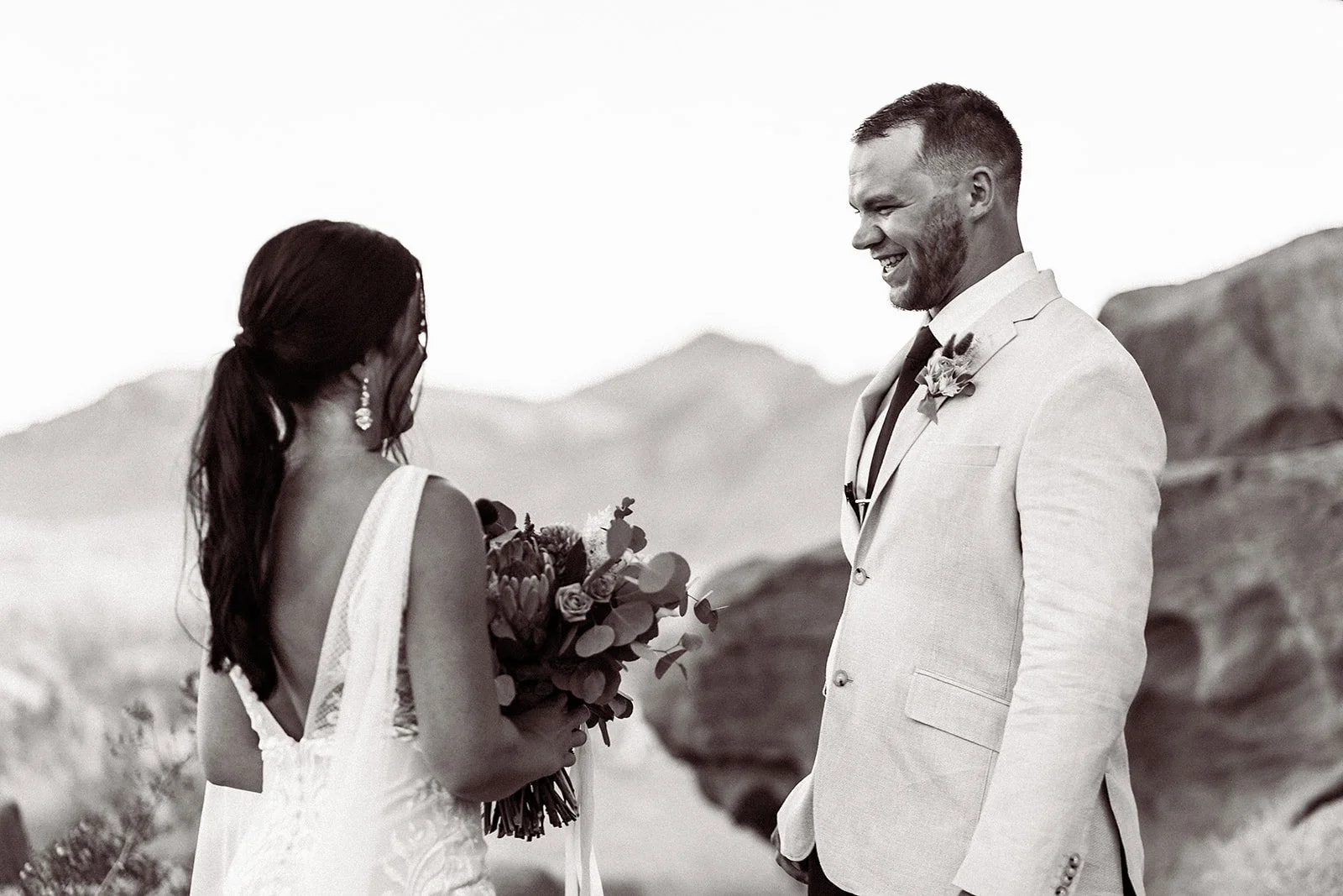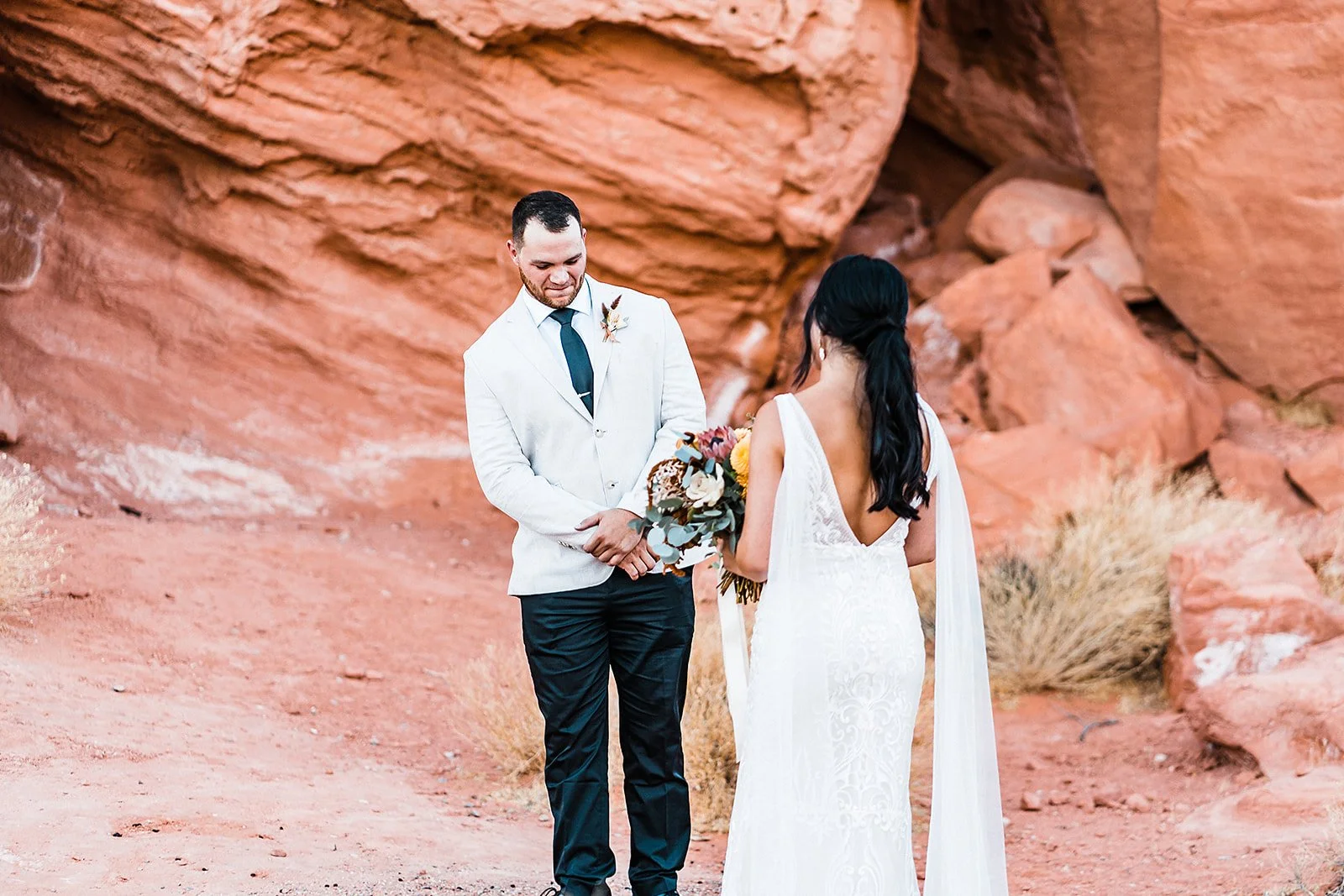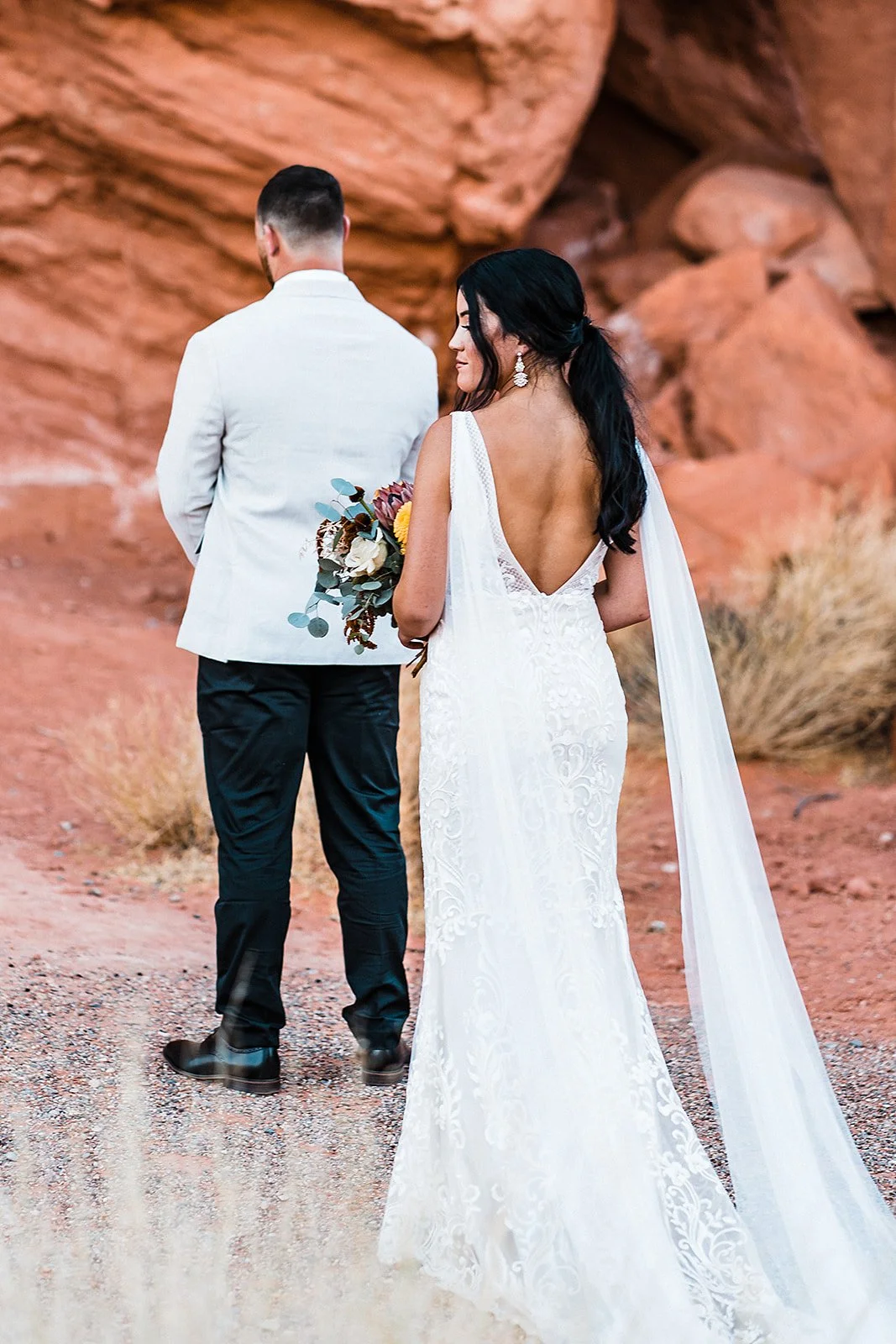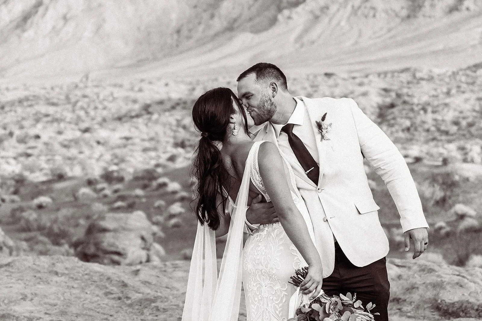With the desert sun beating down, Alli and Che kicked off their day with a heart-melting first look, followed by a quick and intimate ceremony that brought tears to everyone’s eyes. After exchanging vows, they stole away for a few precious moments alone, savoring the quiet beauty of the desert landscape before joining us for their romantic portraits.