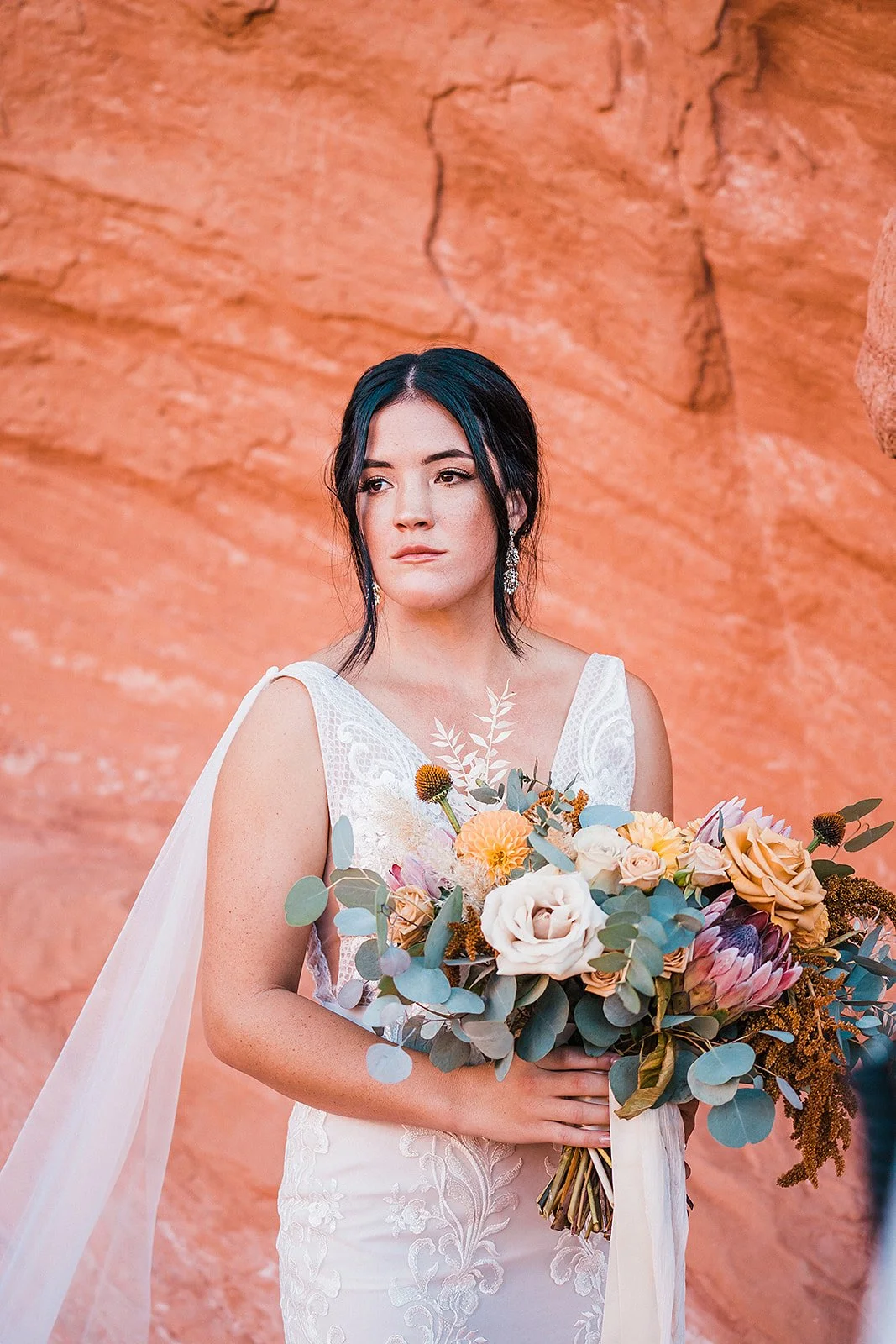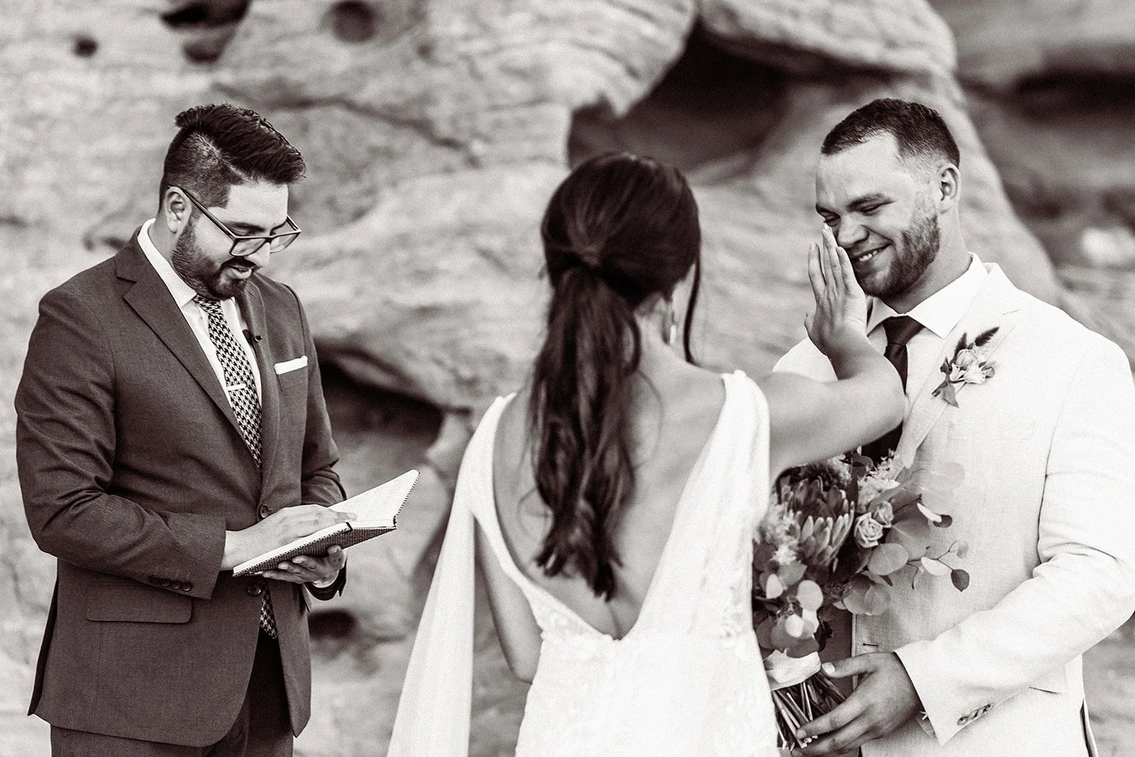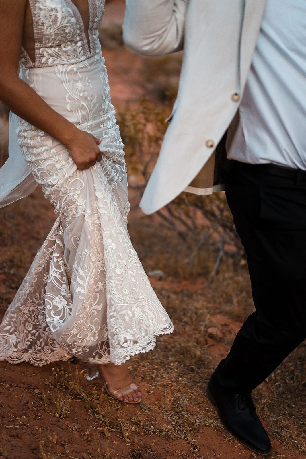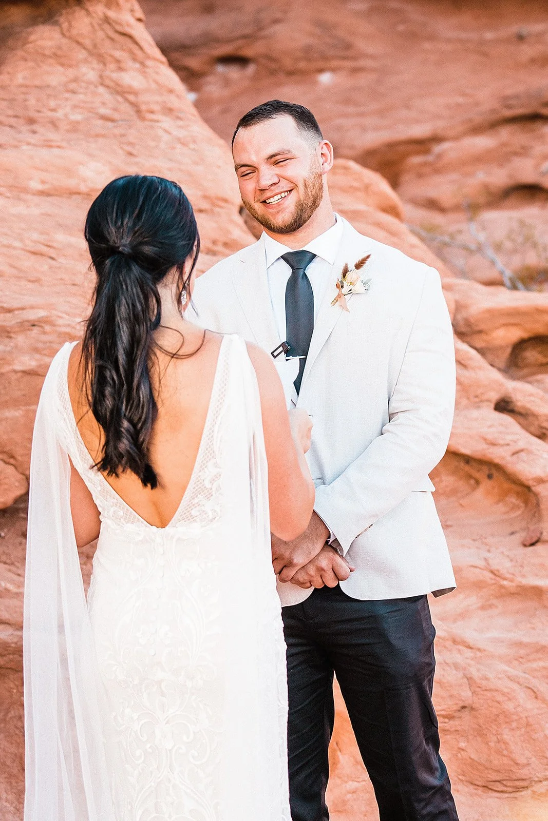 With the desert sun beating down, Alli and Che kicked off their day with a heart-melting first look, followed by a quick and intimate ceremony that brought tears to everyone’s eyes. After exchanging vows, they stole away for a few precious moments alone, savoring the quiet beauty of the desert landscape before joining us for their romantic portraits.