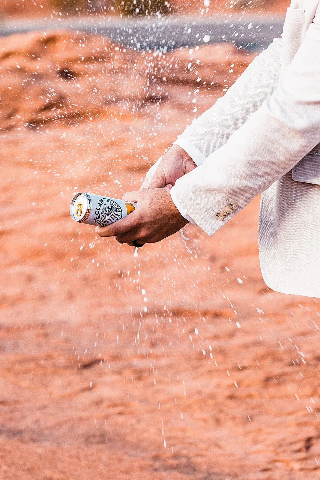 Against the backdrop of the fiery sunset, Alli and Che’s love radiated like a beacon, their joy and laughter lighting up the desert sky. We captured them in moments of quiet tenderness and wild abandon, from posed editorial shots to playful antics like shotgunning white claws with their nearest and dearest.