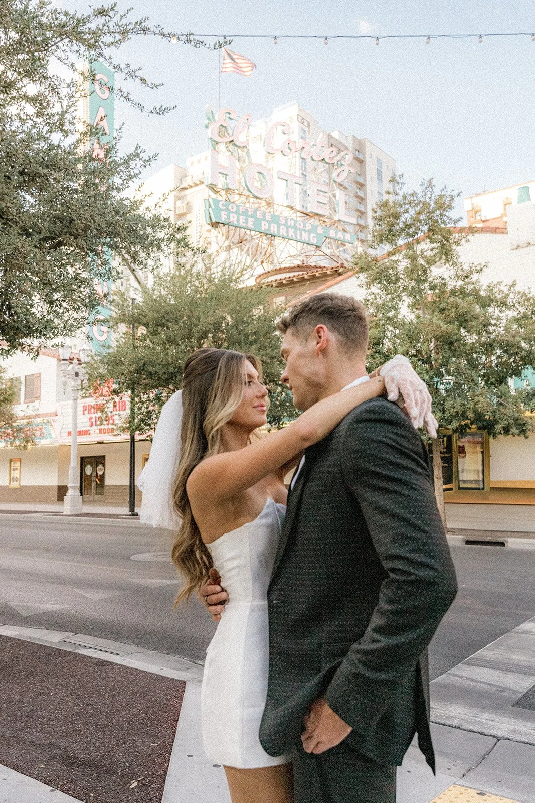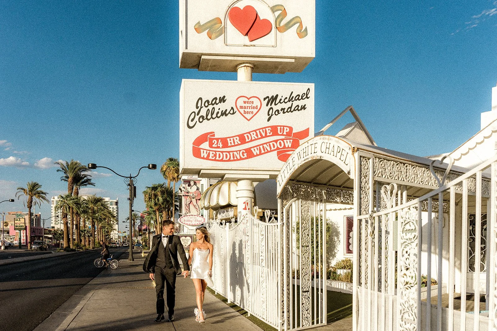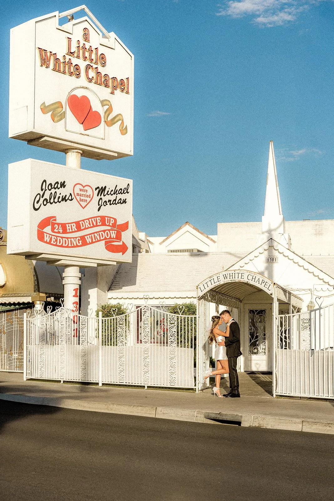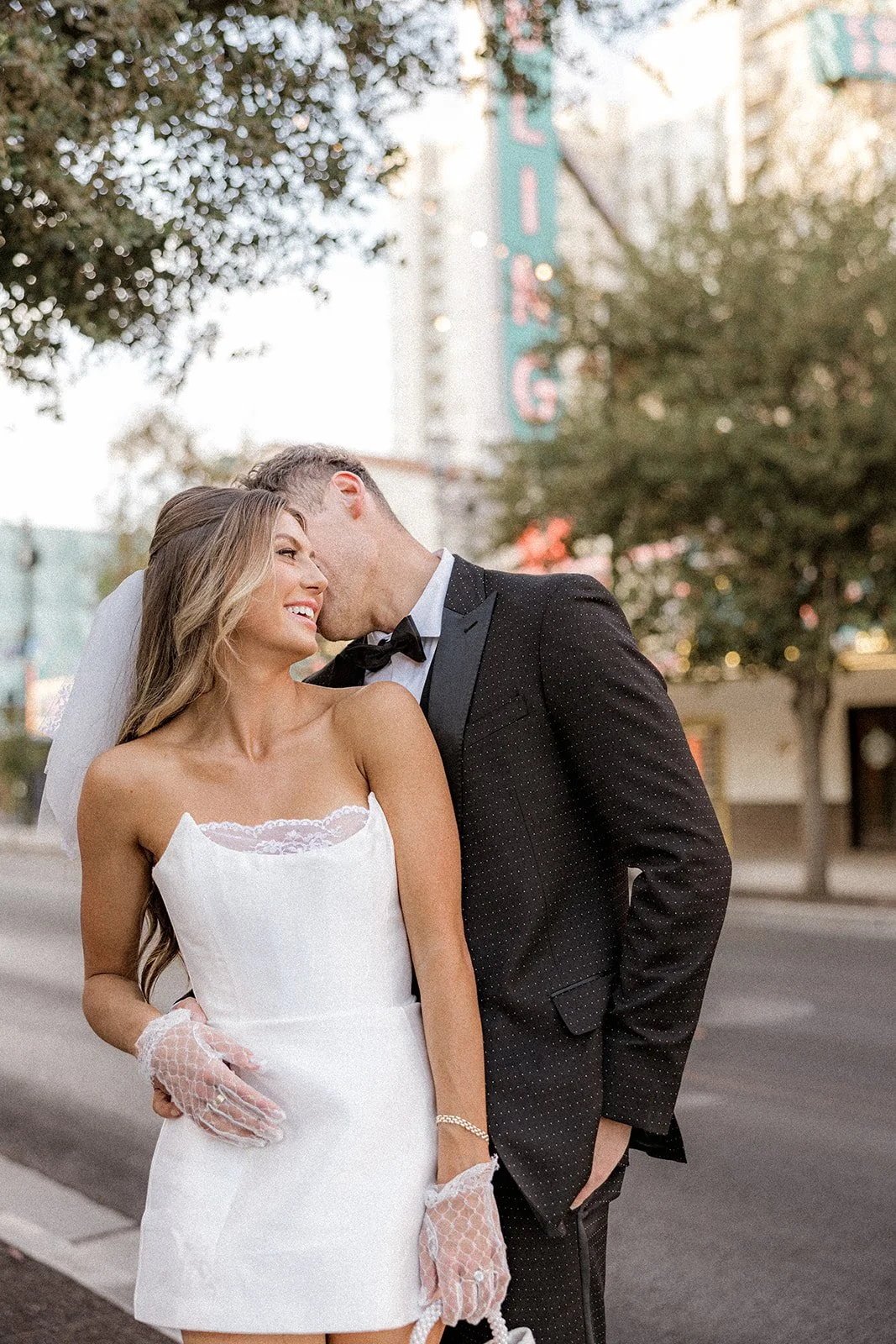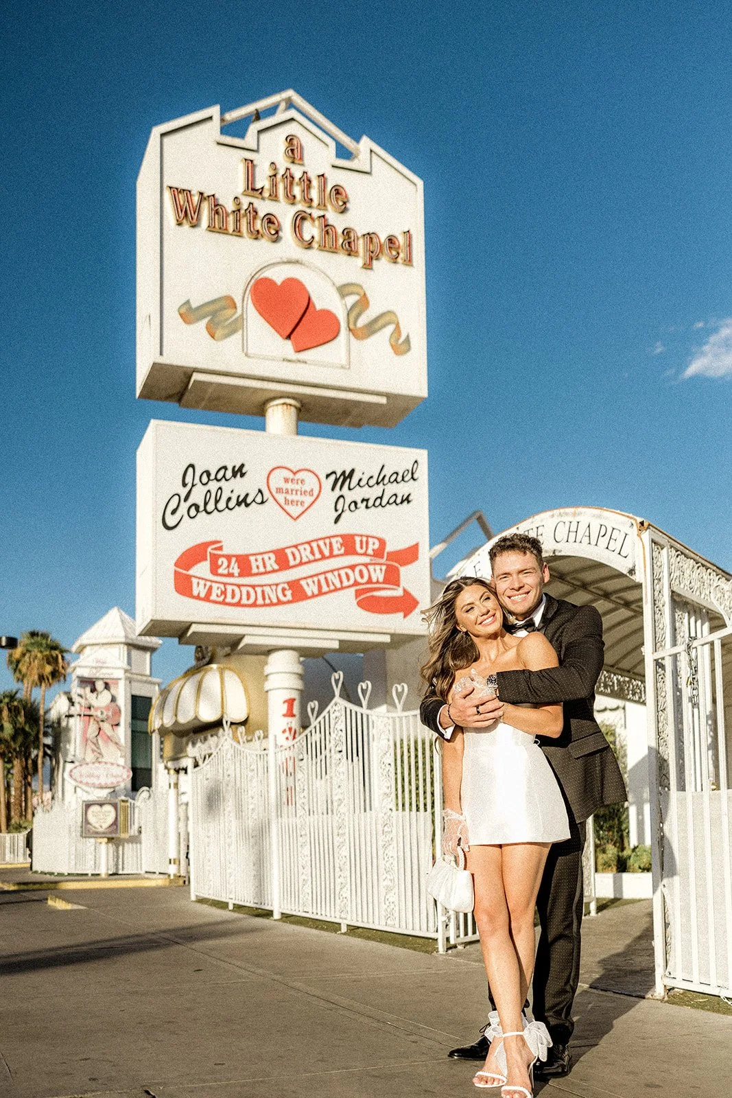 We kicked things off outside The Little White Chapel, an absolute Vegas classic and the backdrop for countless whirlwind “I do”s. The big red heart sign and 24-hour drive-thru wedding window gave the perfect mix of old-Hollywood glam meets rebellious romance. Bailey’s sleek white mini dress (complete with the cutest veil and gloves!) popped against the retro white gate and sun-soaked sidewalk, while Glen looked effortlessly cool in his textured black tux. Together, they strolled the pavement like it was their own personal runway, and it kind of was. Every glance, every spin, every “just married (almost!)” vibe? Amazing!