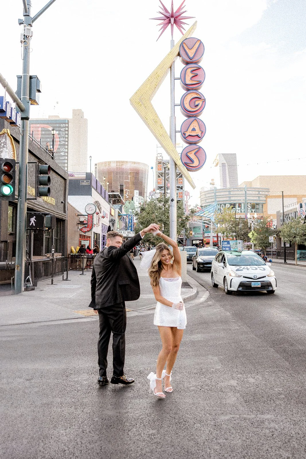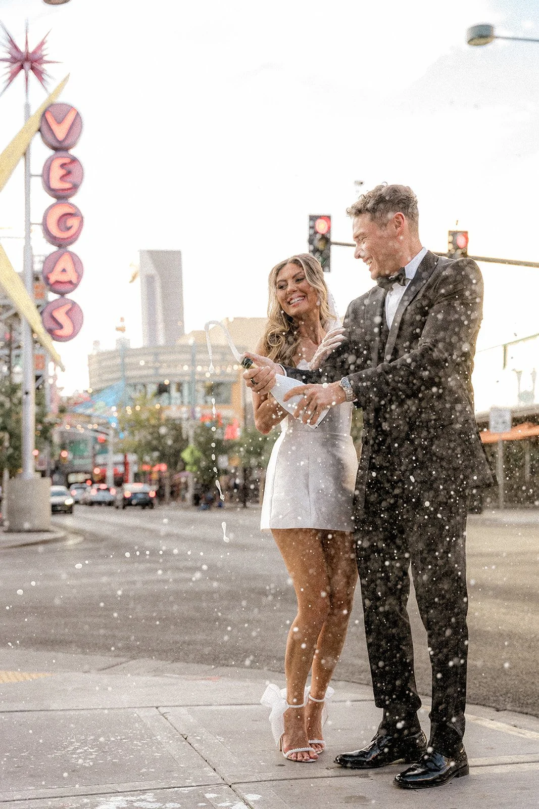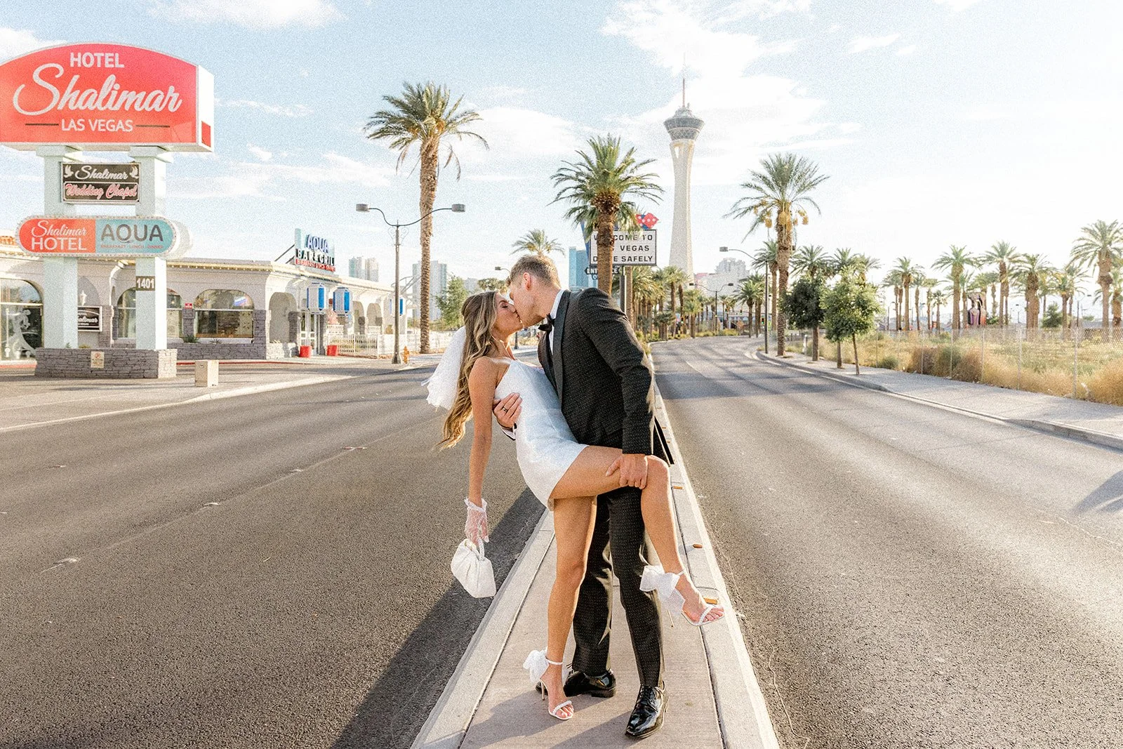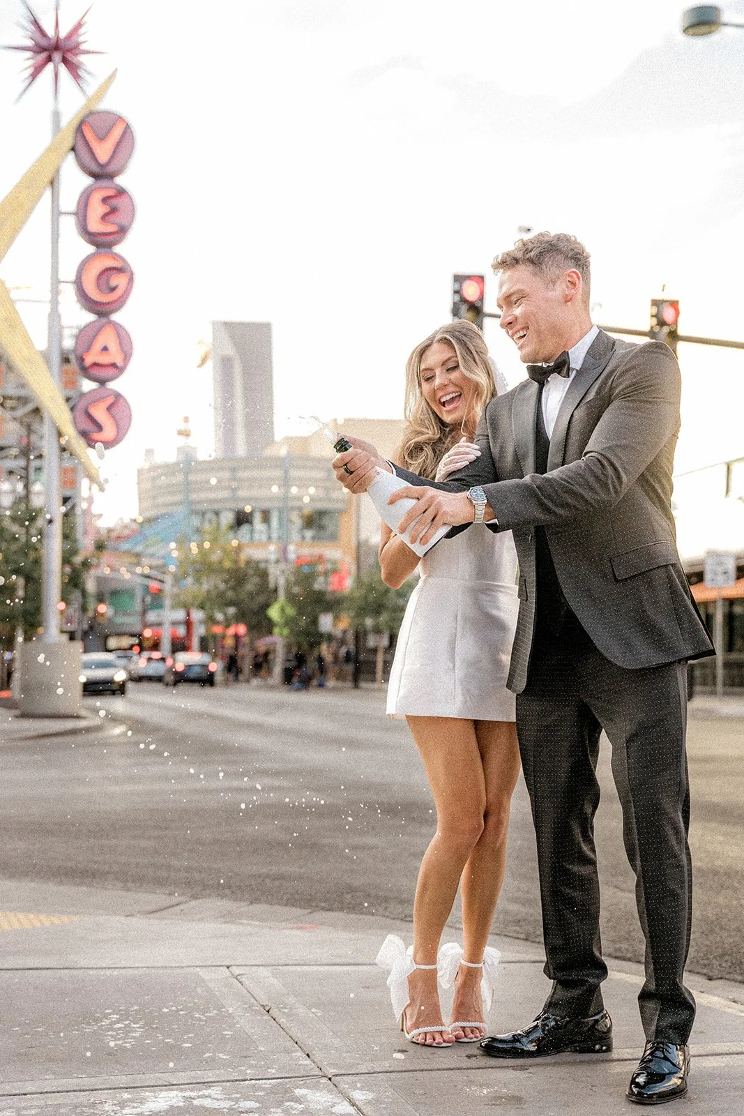 We kicked things off outside The Little White Chapel, an absolute Vegas classic and the backdrop for countless whirlwind “I do”s. The big red heart sign and 24-hour drive-thru wedding window gave the perfect mix of old-Hollywood glam meets rebellious romance. Bailey’s sleek white mini dress (complete with the cutest veil and gloves!) popped against the retro white gate and sun-soaked sidewalk, while Glen looked effortlessly cool in his textured black tux. Together, they strolled the pavement like it was their own personal runway, and it kind of was. Every glance, every spin, every “just married (almost!)” vibe? Amazing!