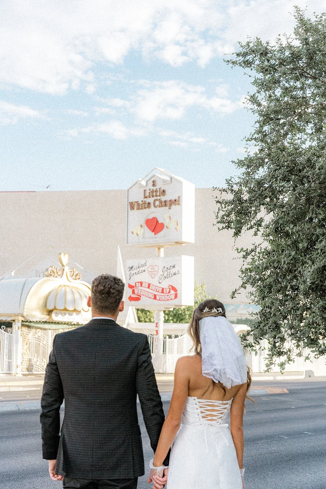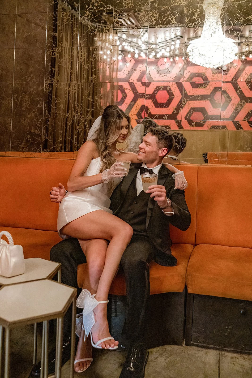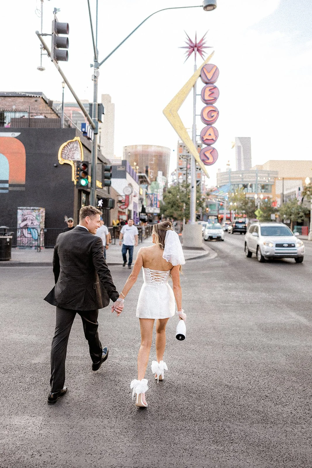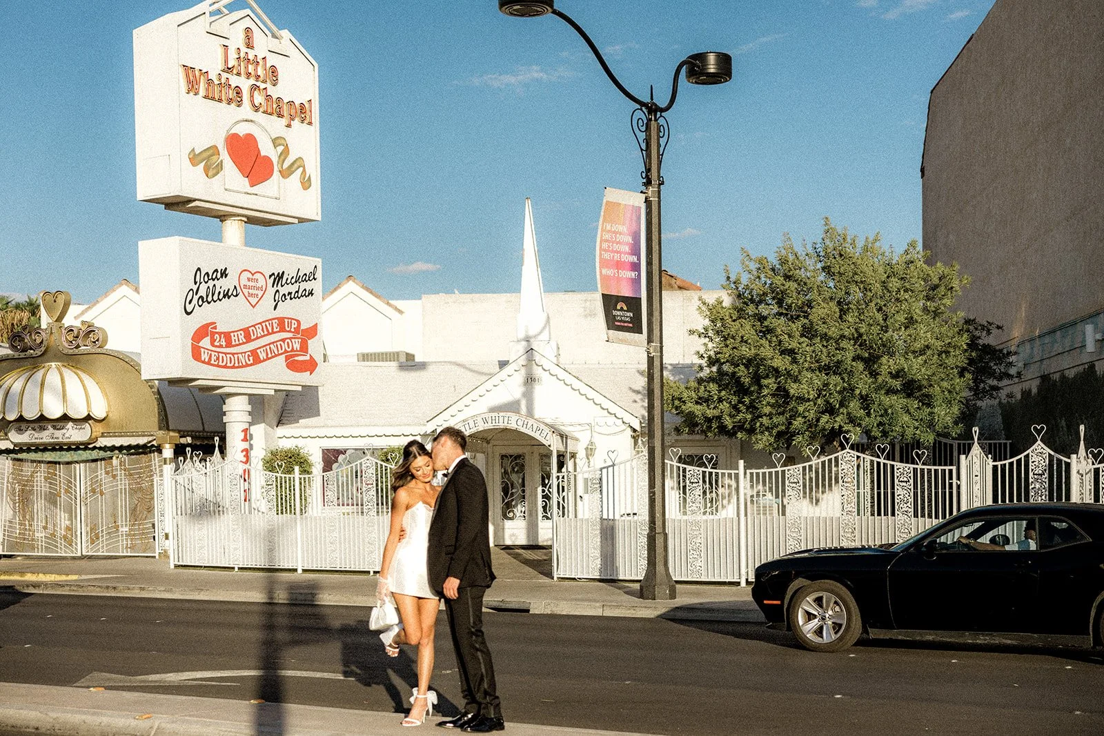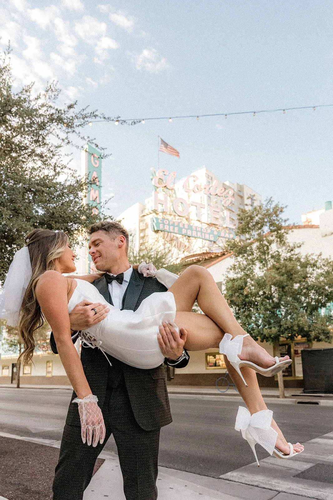 We kicked things off outside The Little White Chapel, an absolute Vegas classic and the backdrop for countless whirlwind “I do”s. The big red heart sign and 24-hour drive-thru wedding window gave the perfect mix of old-Hollywood glam meets rebellious romance. Bailey’s sleek white mini dress (complete with the cutest veil and gloves!) popped against the retro white gate and sun-soaked sidewalk, while Glen looked effortlessly cool in his textured black tux. Together, they strolled the pavement like it was their own personal runway, and it kind of was. Every glance, every spin, every “just married (almost!)” vibe? Amazing!
