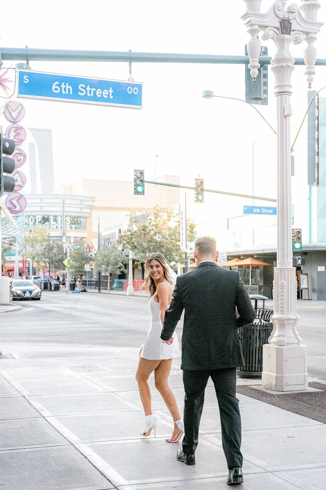 From there, they wandered through downtown Las Vegas, past neon signs, palm trees, and all the cheeky city beauty that makes this place feel so alive. Bailey and Glen didn’t just take portraits, they played. He lifted her off her feet, she twirled in heels like it was second nature, and the two of them laughed with that kind of contagious joy that makes you forget about everything else. There’s something so intimate about pausing before the official vows, just soaking each other in without pressure, without timelines, just the feeling of us. These two nailed it.