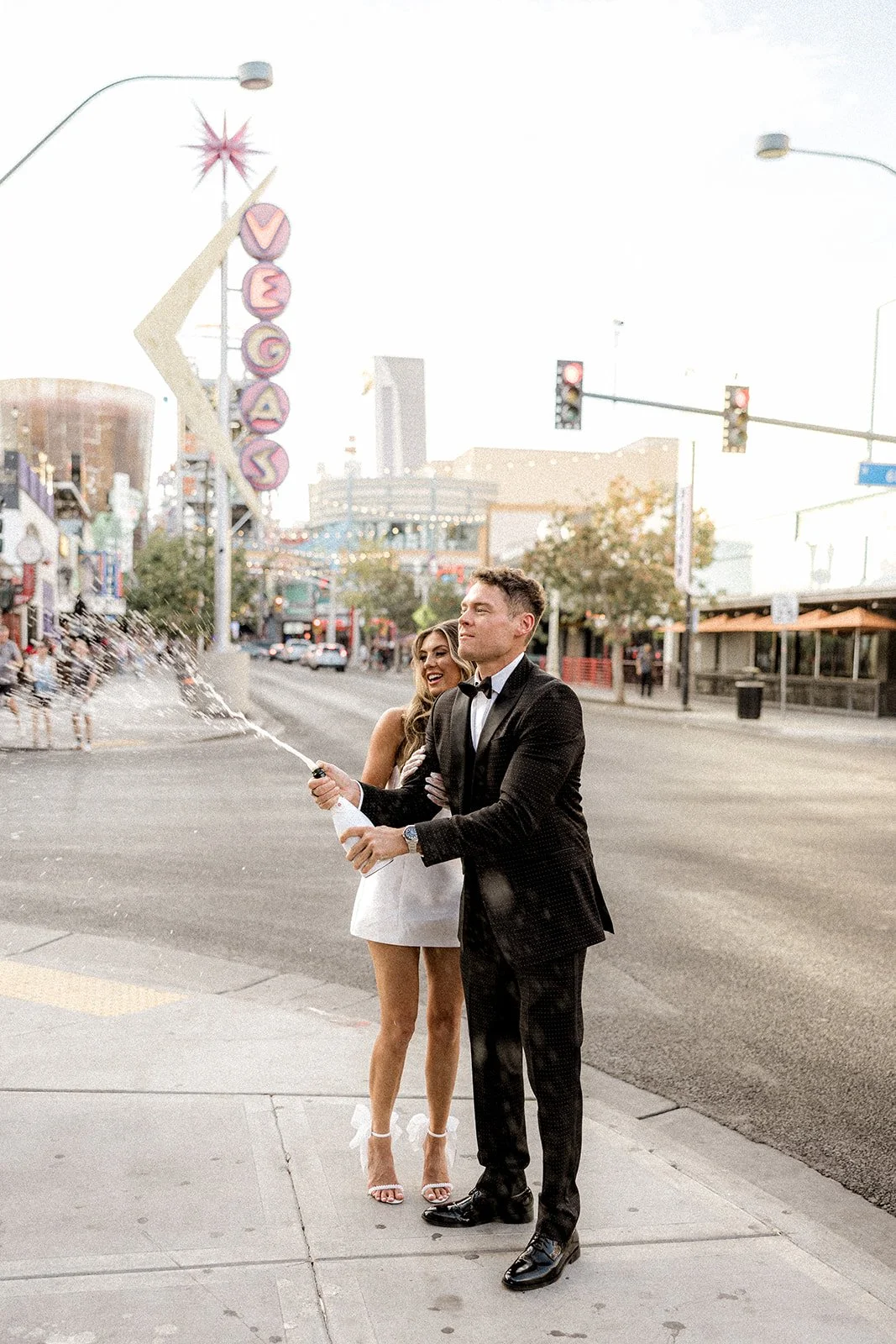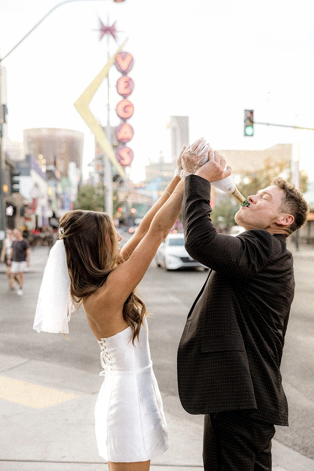 What’s a celebration without a little bubbly? Under the glowing VEGAS sign on Fremont Street, Bailey and Glen popped a bottle and let it spray wild. That champagne shower was the exclamation point on the love-soaked sentence of their day, messy, playful, and absolutely iconic. We loved seeing them let loose in such a public place, owning their moment like the main characters they are. And yes, we’re still not over Bailey chugging straight from the bottle in those dramatic heels and tulle gloves. A queen!