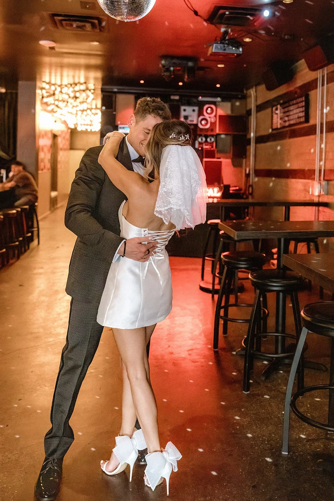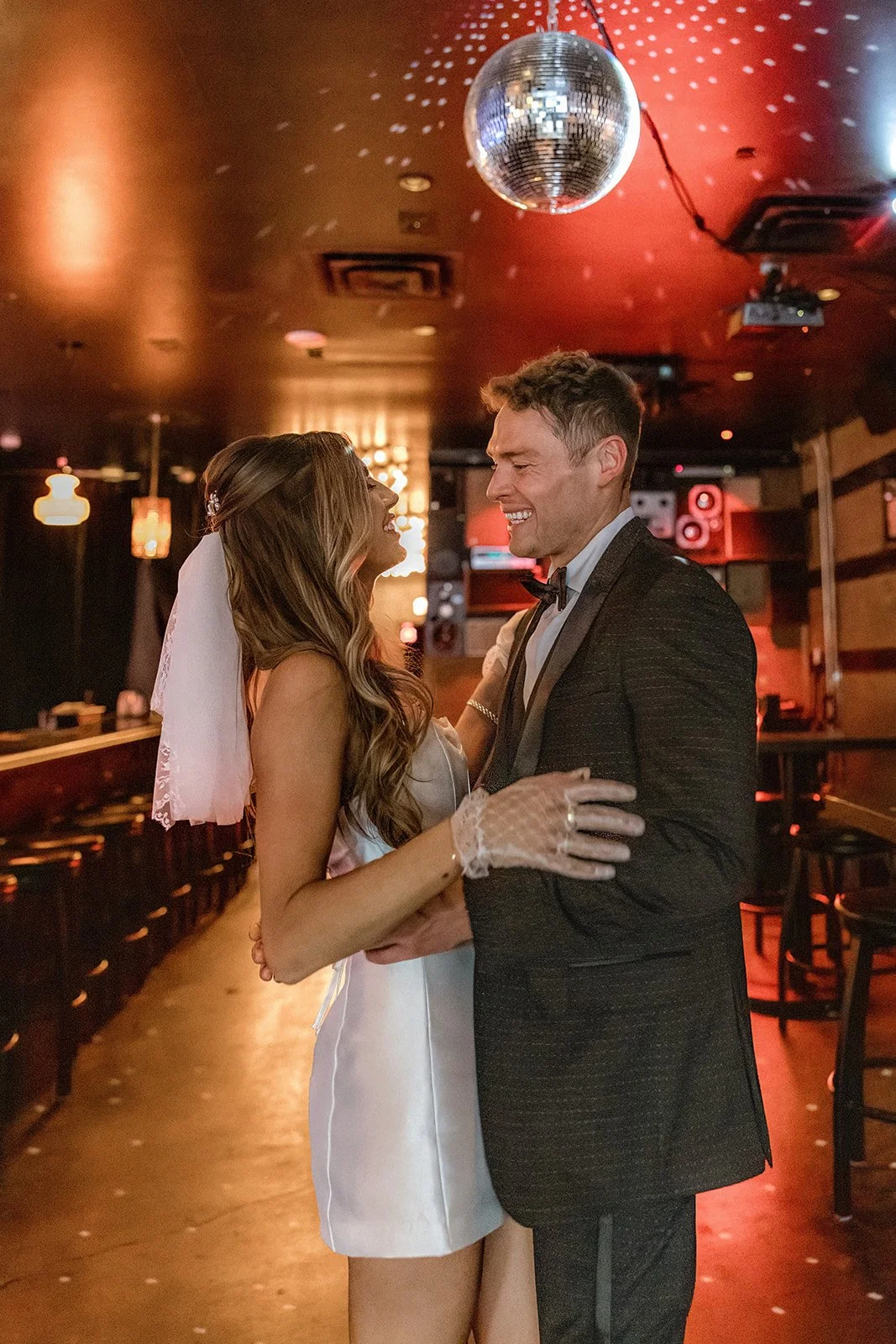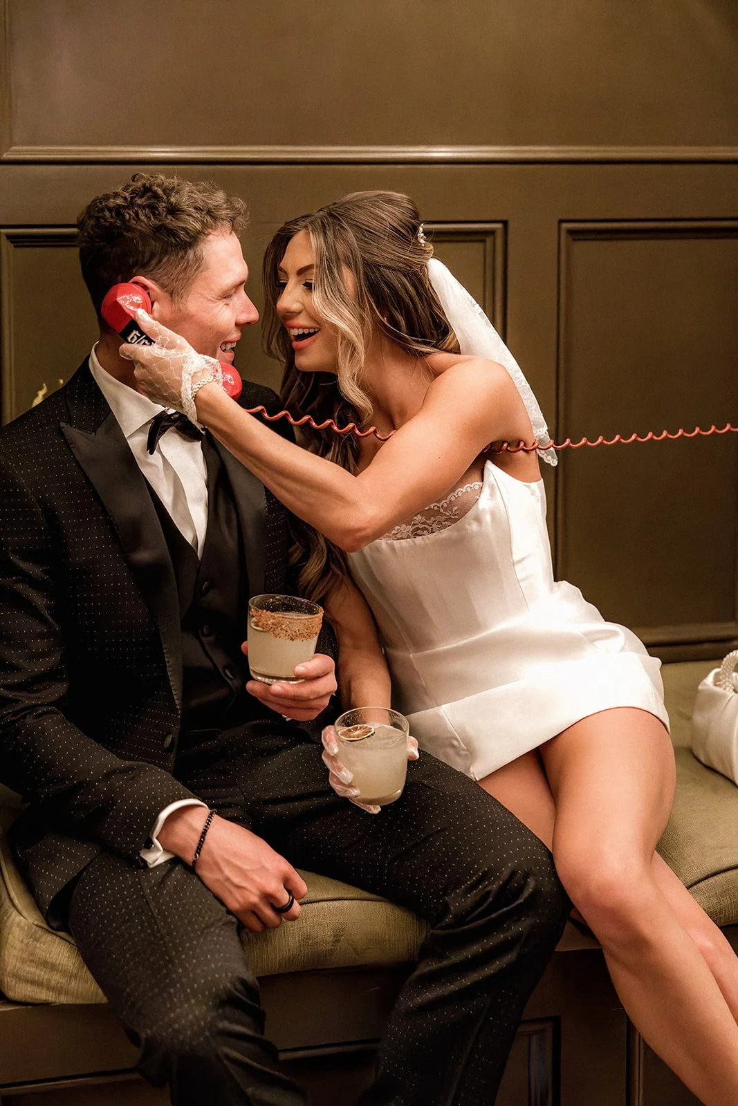 To wrap up their portrait adventure, Bailey and Glen slipped into Corduroy Bar for a cocktail and a cozy little dance under a sparkling disco ball. The vibe? Pure vintage cool. Dark wood, glowing neon, moody corners, it was the perfect mix of gritty and glamorous. They laughed on barstools, whispered across booths, and shared those soft, forehead-to-forehead moments that feel like home. And the telephone booth shots? Just wait until you see them. Flirty, fun, and a little bit mischievous, like their whole day in one perfect frame!