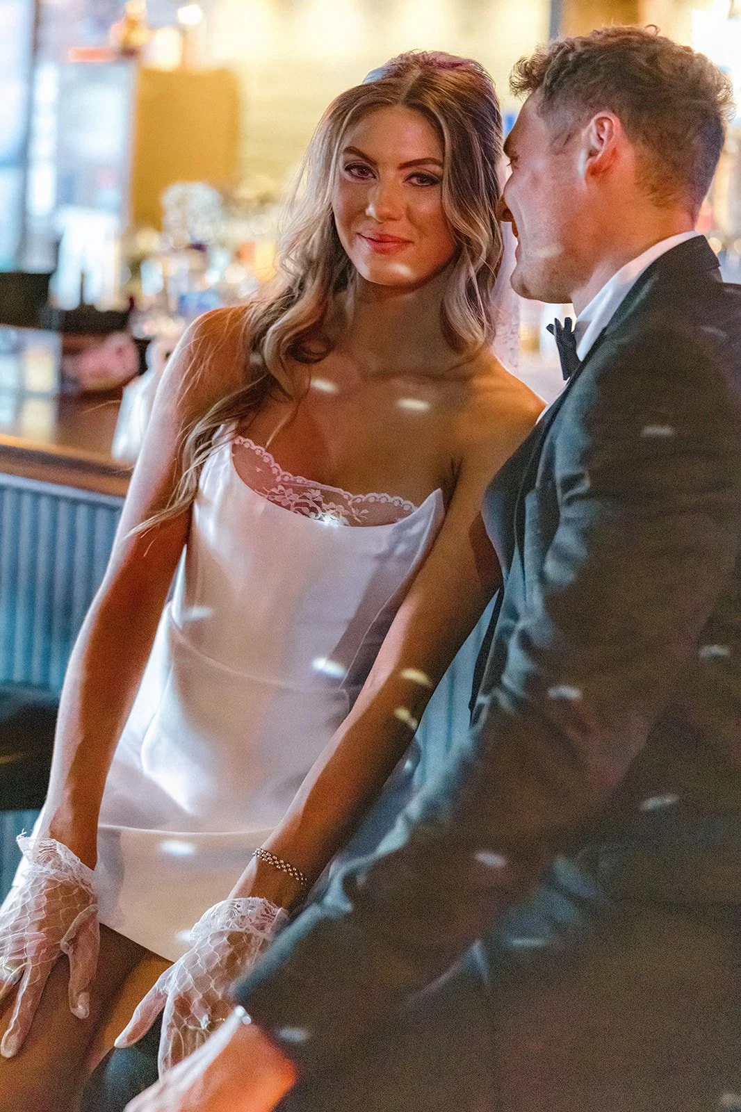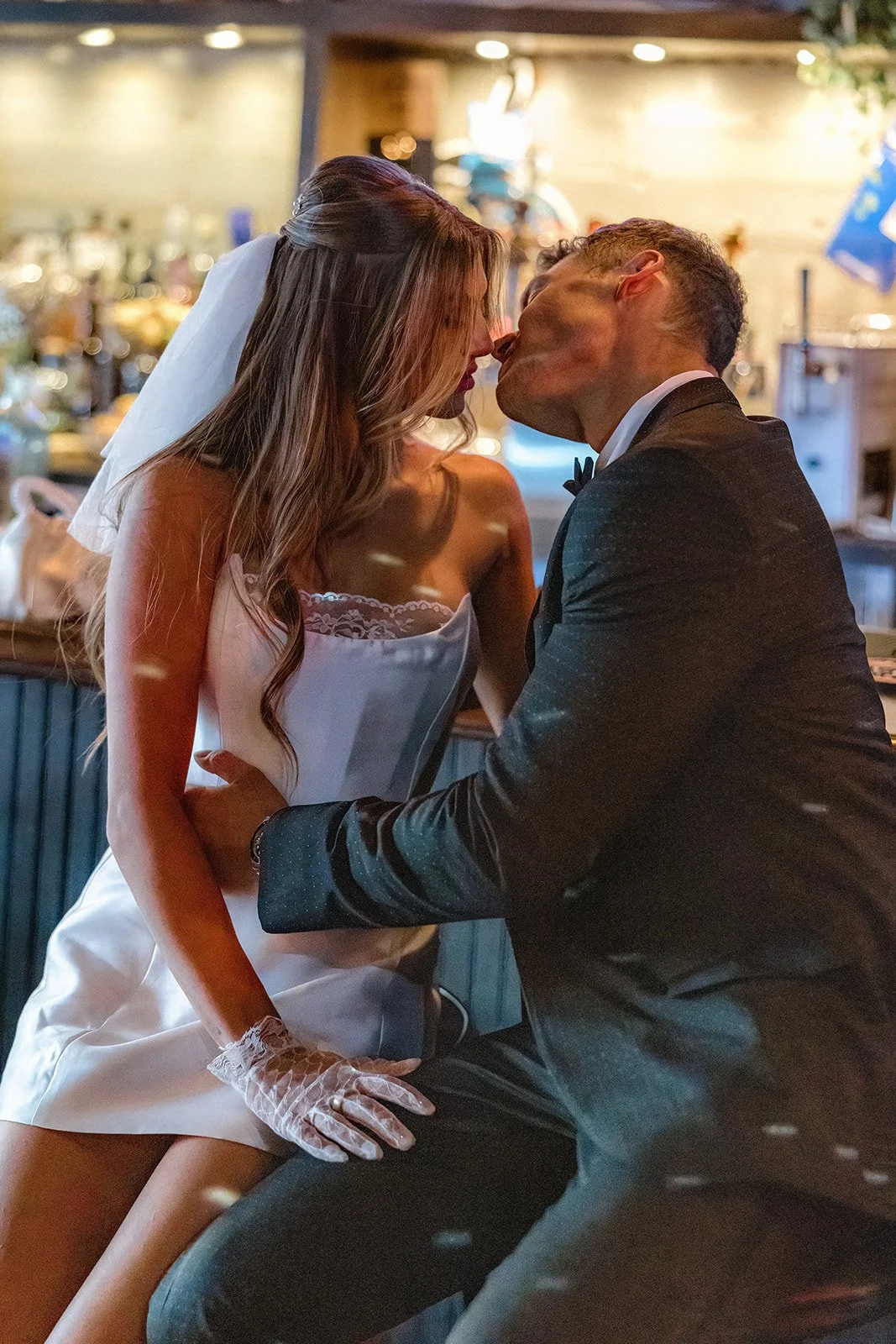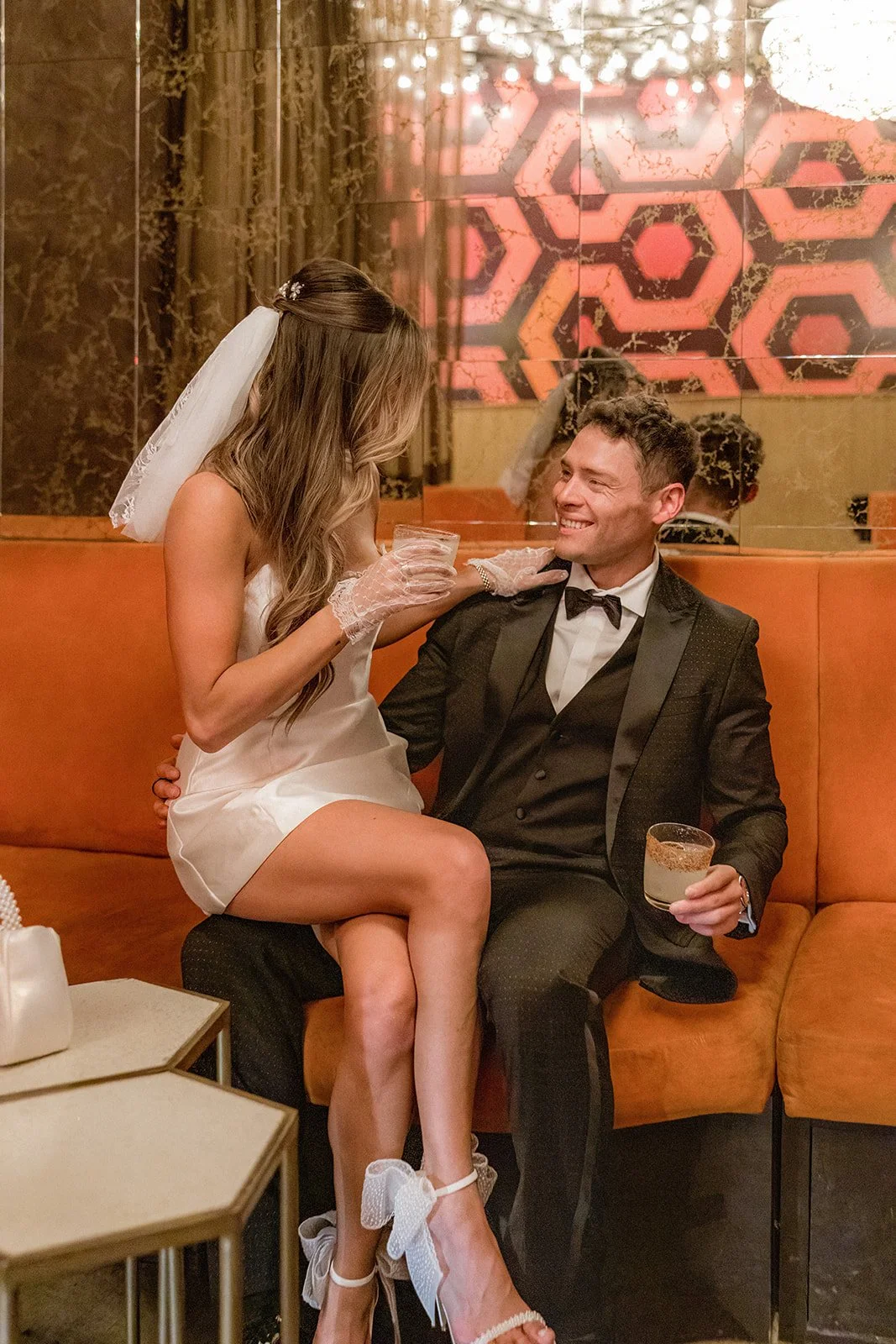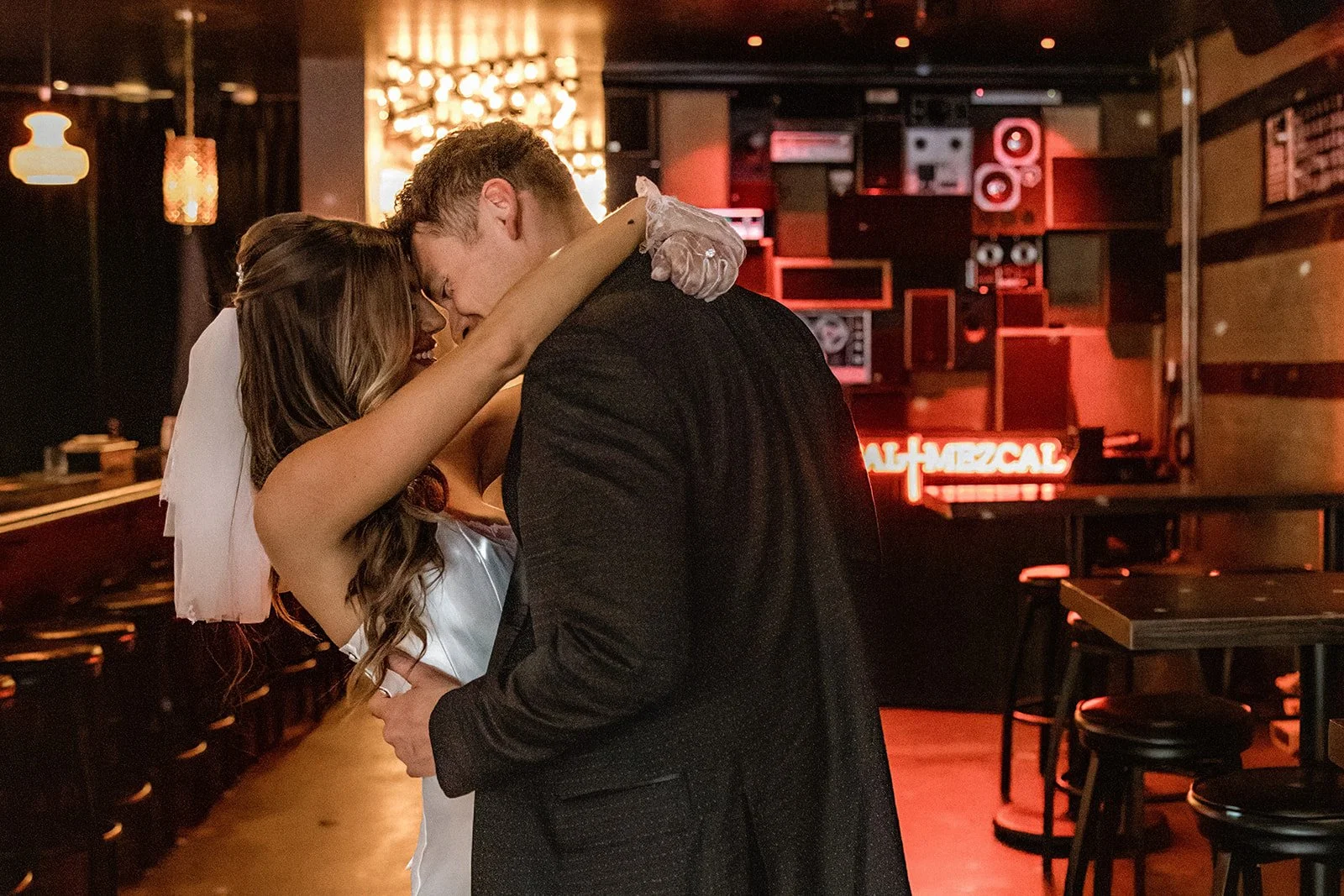 To wrap up their portrait adventure, Bailey and Glen slipped into Corduroy Bar for a cocktail and a cozy little dance under a sparkling disco ball. The vibe? Pure vintage cool. Dark wood, glowing neon, moody corners, it was the perfect mix of gritty and glamorous. They laughed on barstools, whispered across booths, and shared those soft, forehead-to-forehead moments that feel like home. And the telephone booth shots? Just wait until you see them. Flirty, fun, and a little bit mischievous, like their whole day in one perfect frame!