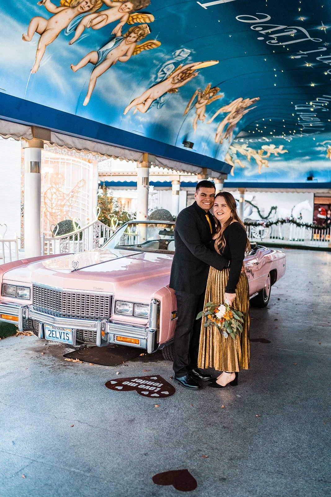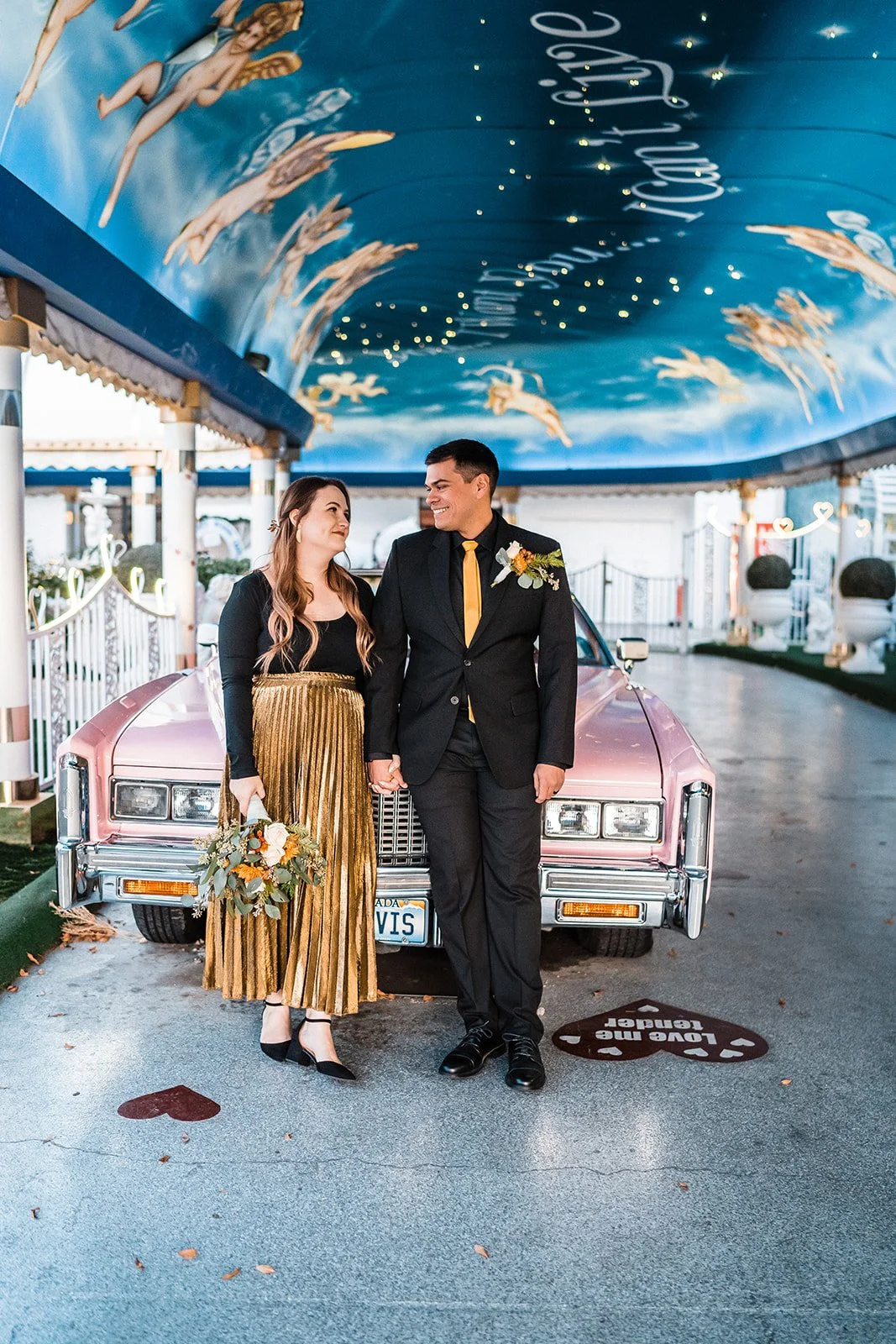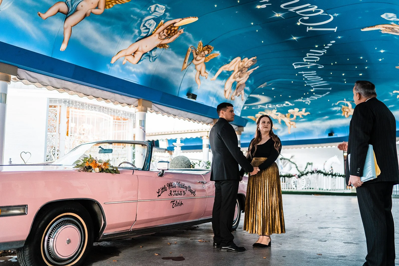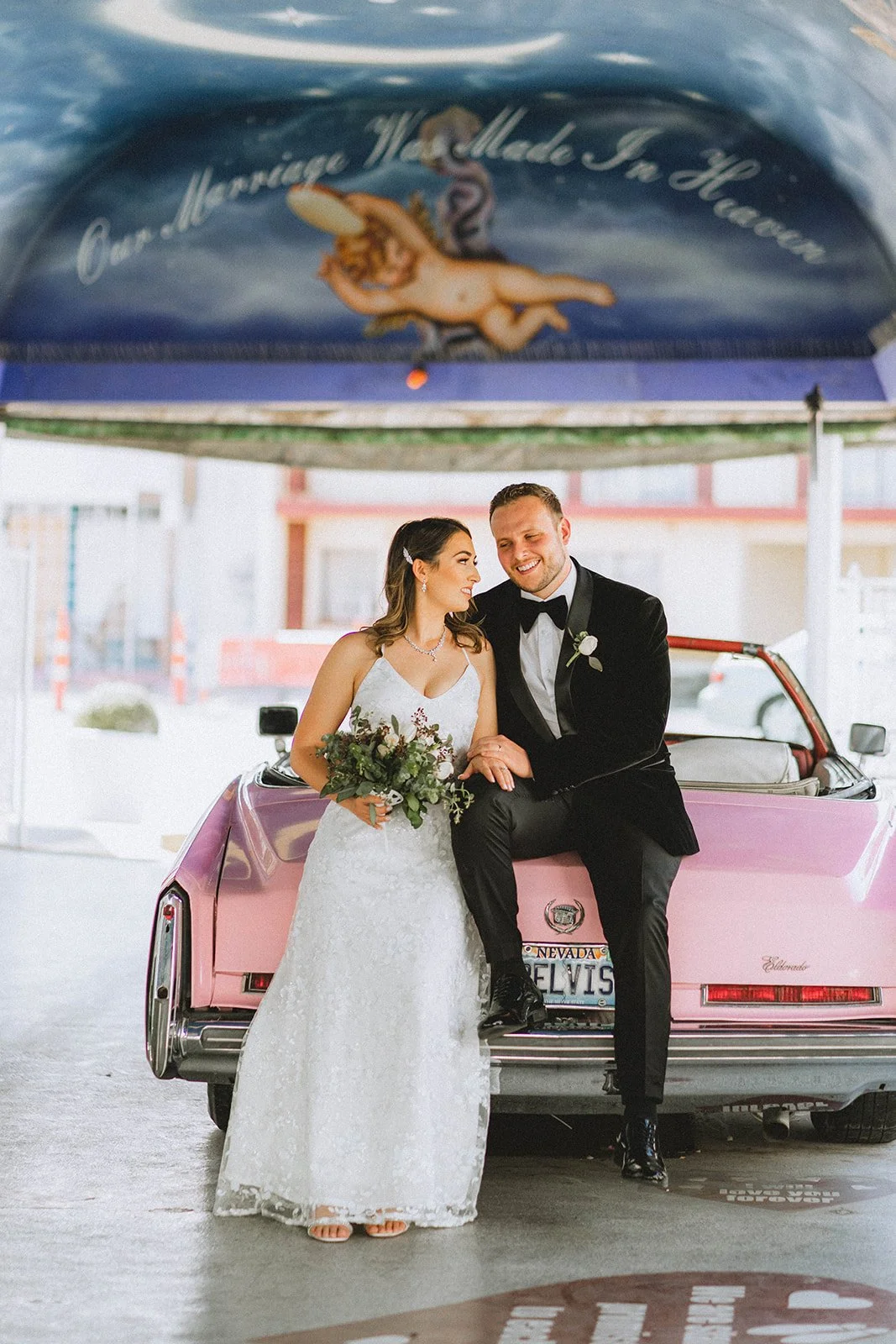 Yes, the ceremony might be short. But that doesn’t mean it should be forgotten. We’ve captured so many couples here and every single gallery feels like a tiny time capsule, filled with real emotion, gritty Vegas energy, and dreamy, vintage-tinged portraits. The chapel itself gives you so many fun backdrops, and we always find extra spots nearby for those just-married golden hour photos too. The pink Cadillac? Looks even better in film. The painted angel ceiling? Pure nostalgia. The way your partner looks at you mid-vows? That deserves to be documented.