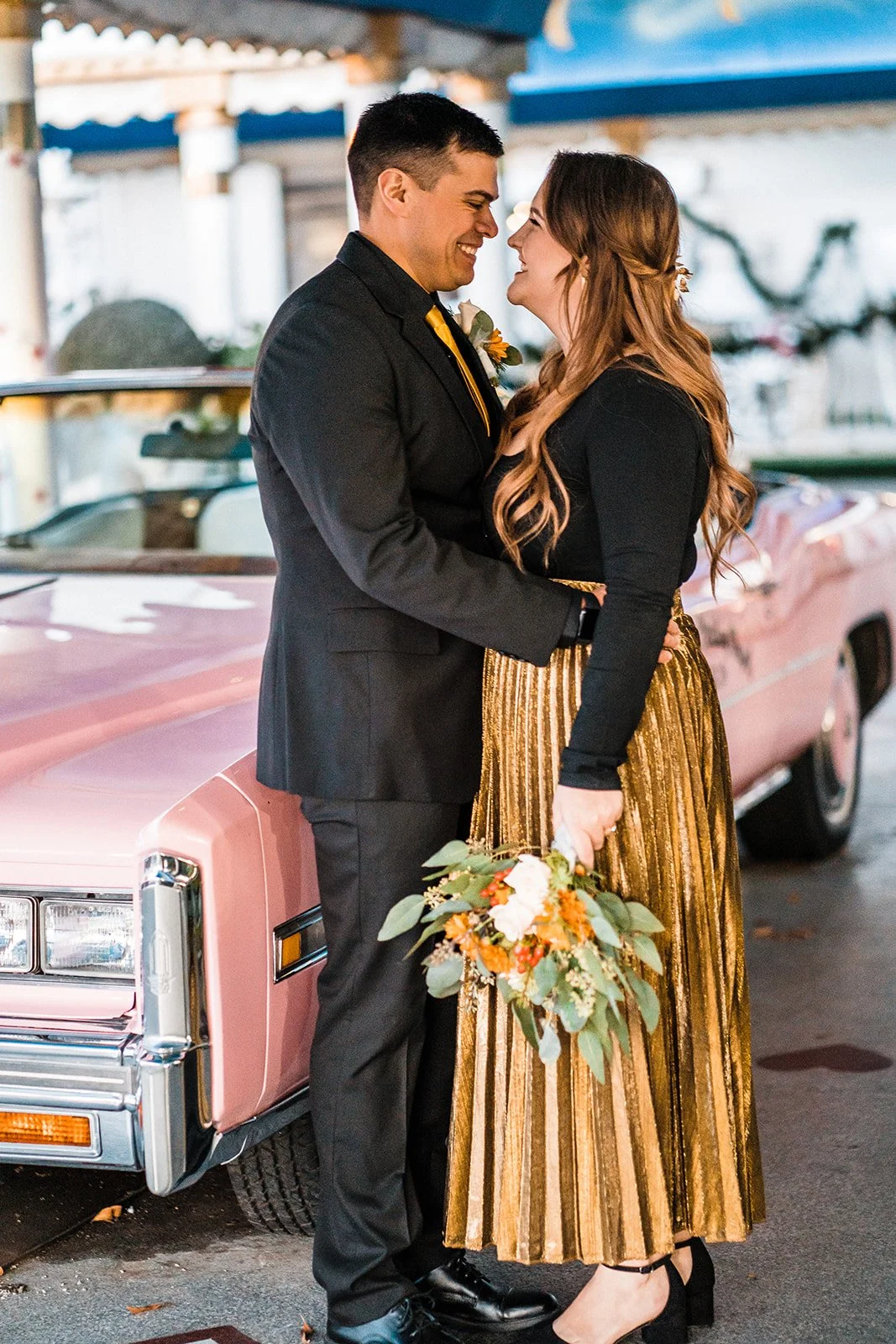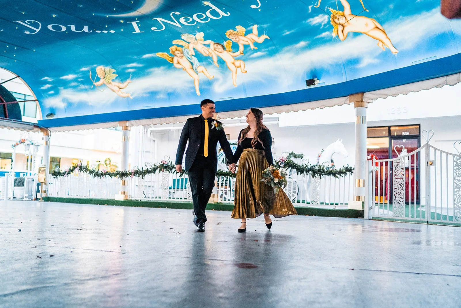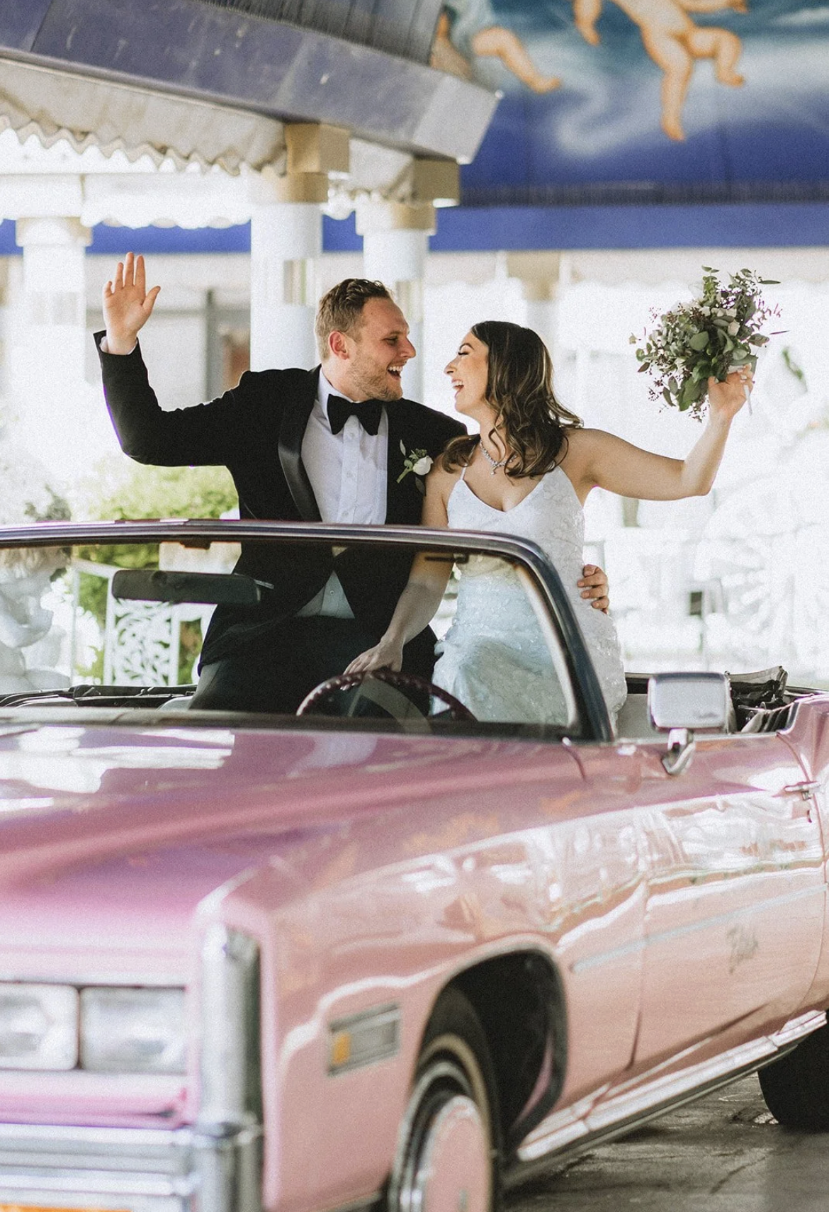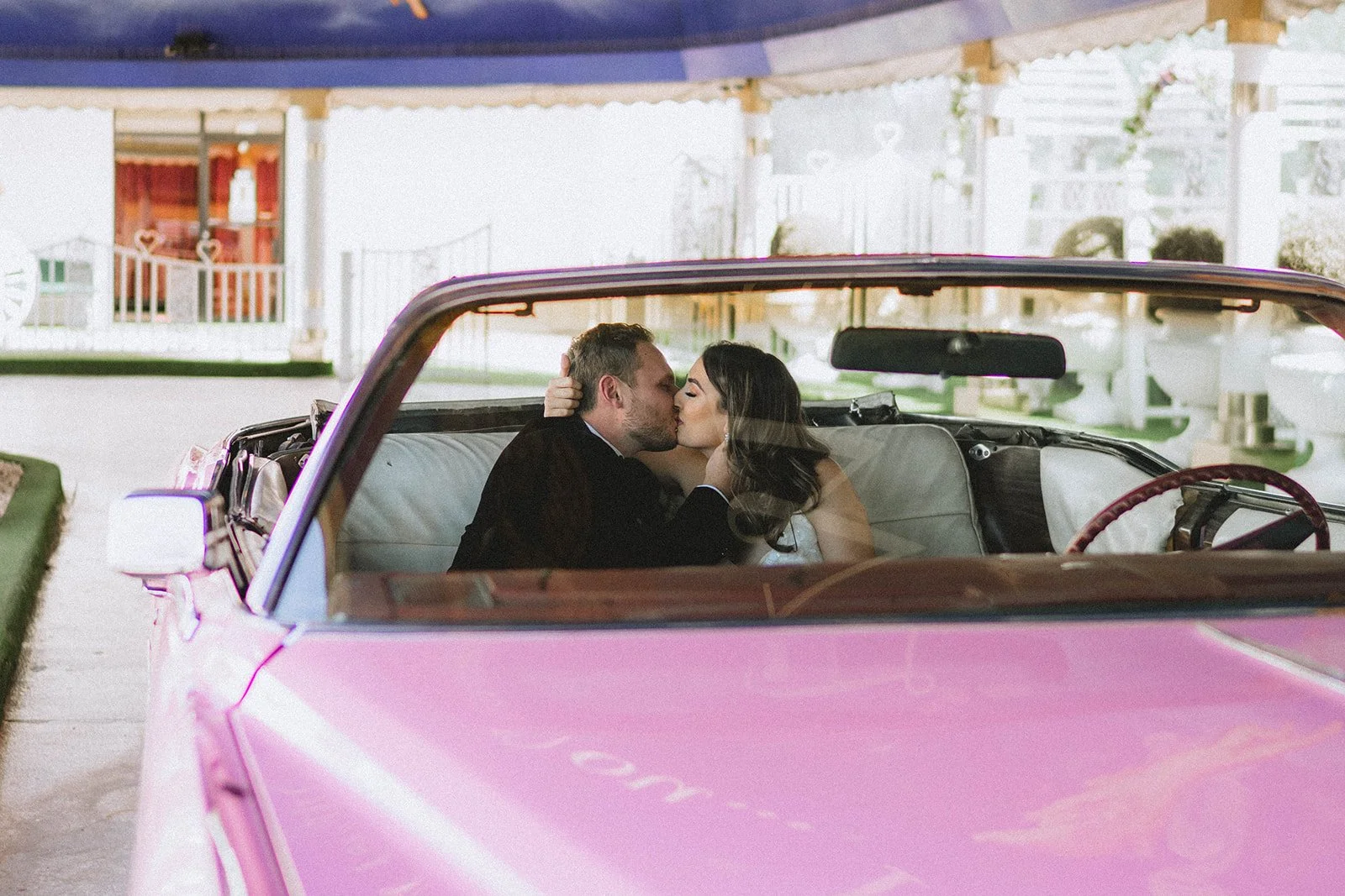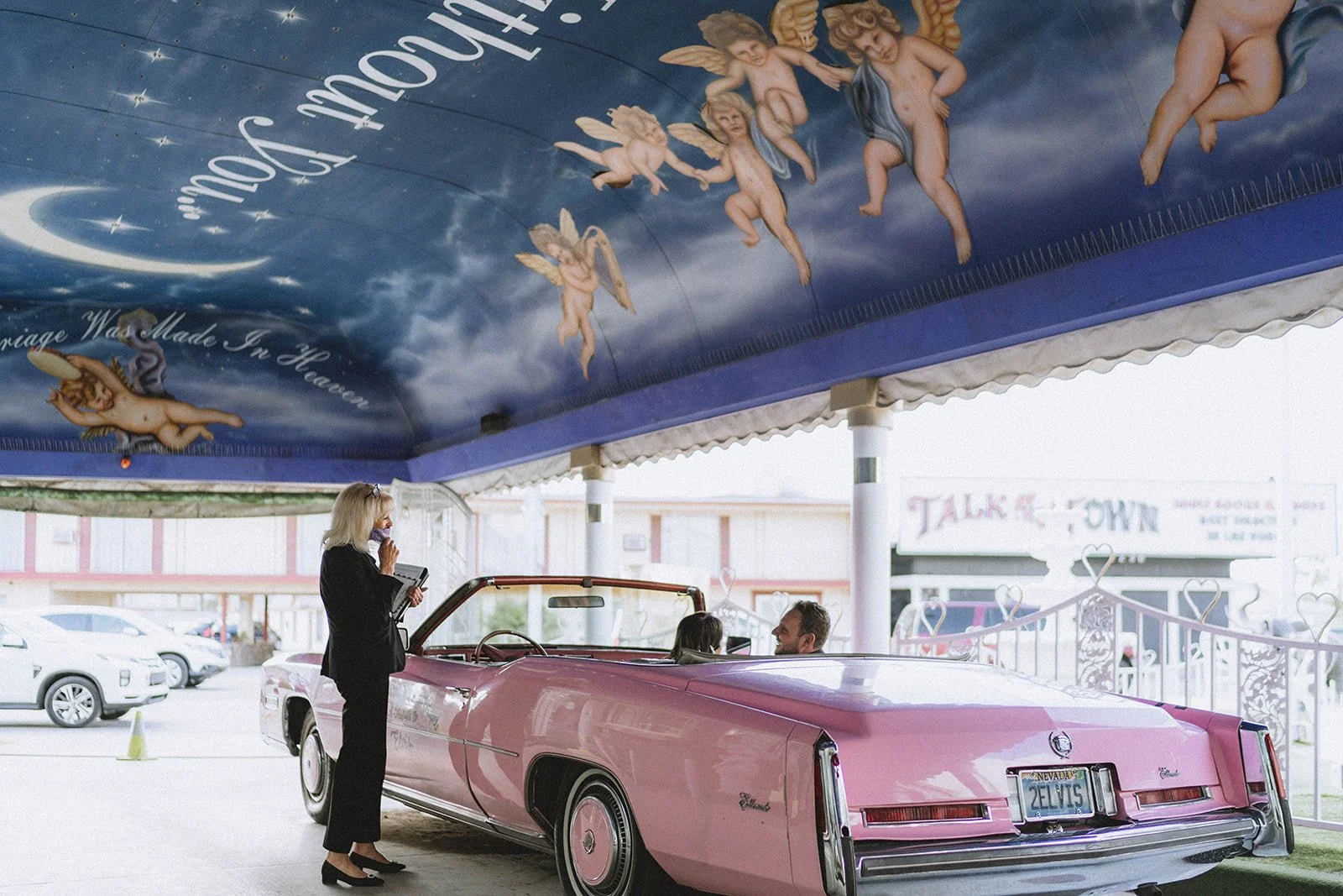 Yes, the ceremony might be short. But that doesn’t mean it should be forgotten. We’ve captured so many couples here and every single gallery feels like a tiny time capsule, filled with real emotion, gritty Vegas energy, and dreamy, vintage-tinged portraits. The chapel itself gives you so many fun backdrops, and we always find extra spots nearby for those just-married golden hour photos too. The pink Cadillac? Looks even better in film. The painted angel ceiling? Pure nostalgia. The way your partner looks at you mid-vows? That deserves to be documented.