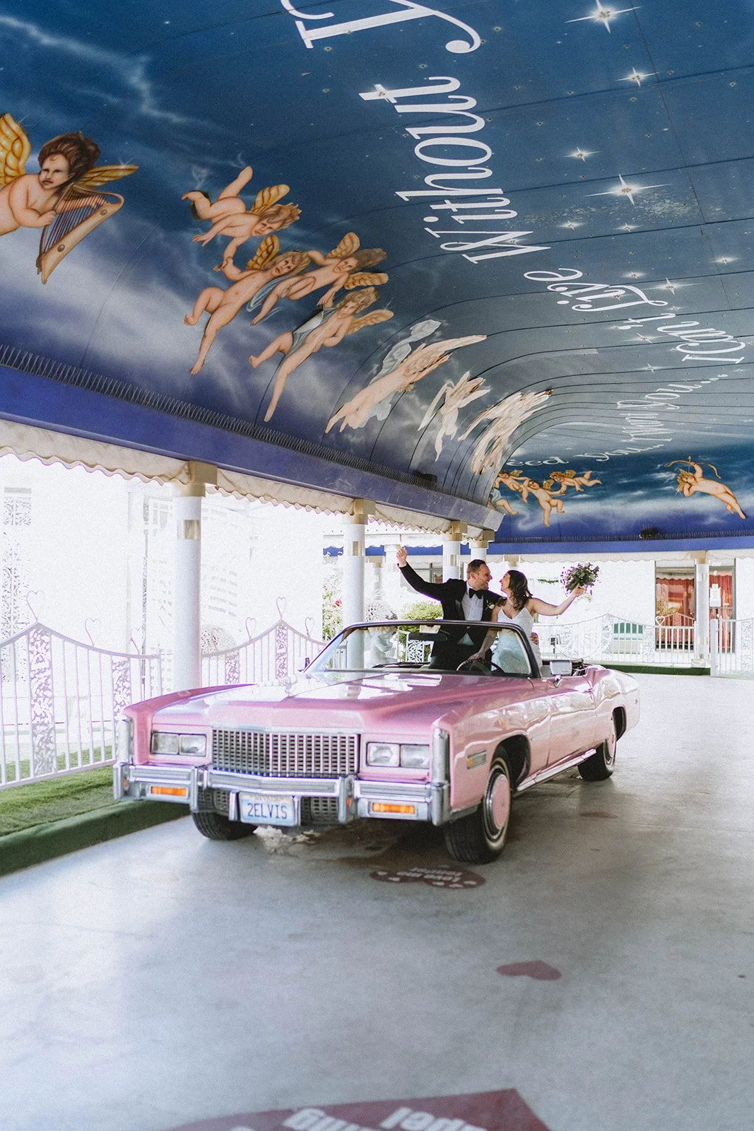 Couple after their Pink Cadillac Elopement at The Little White Wedding Chapel in Las Vegas, Nevada.
