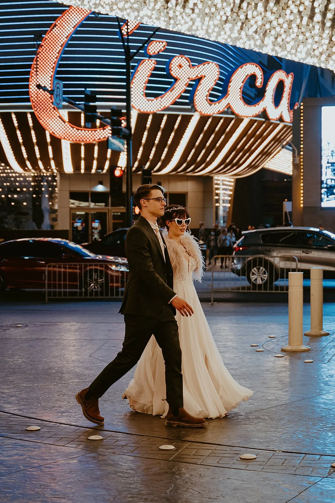 Couple standing hand in hand after eloping in front of the Lady Luck Sign at The Neon Museum.