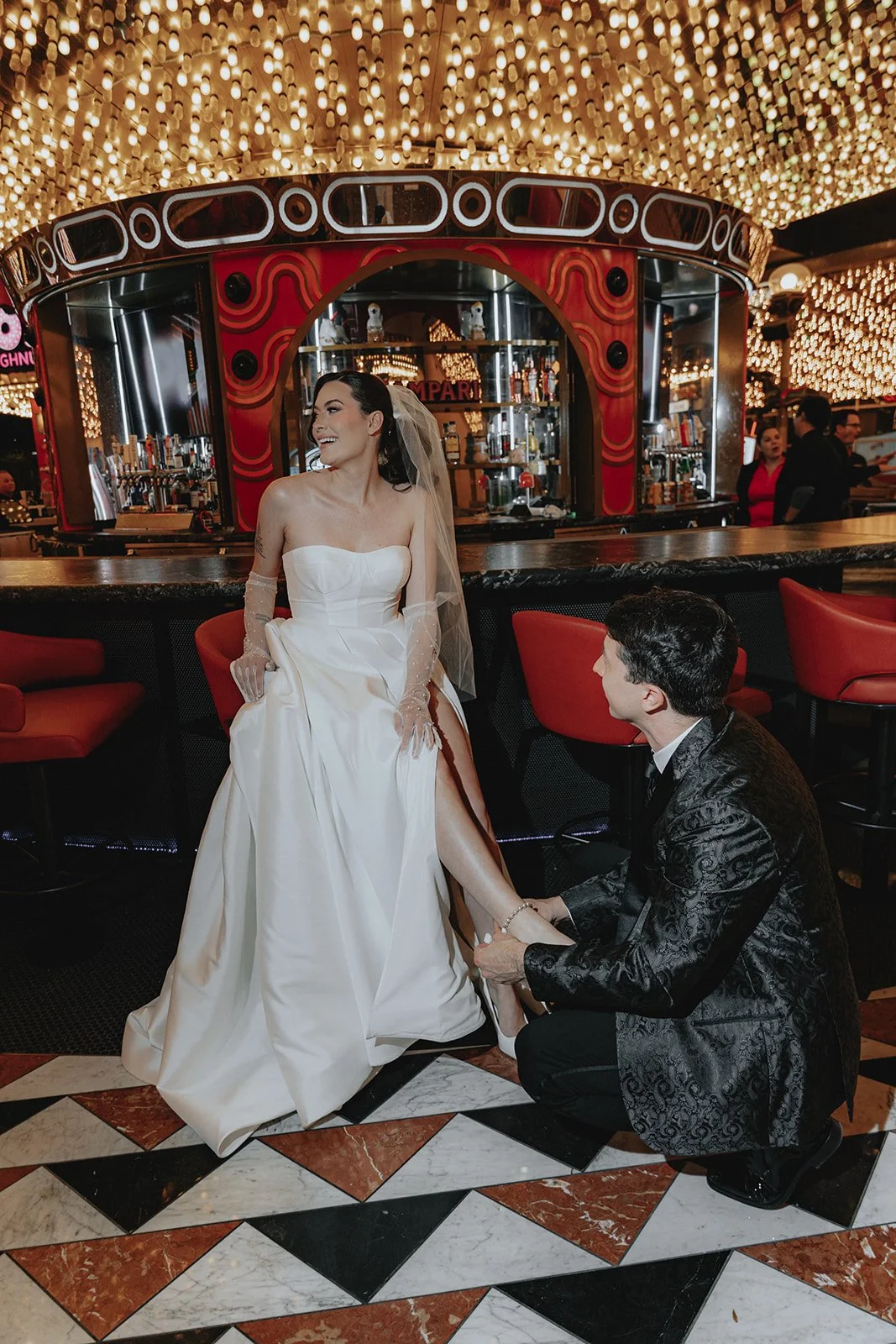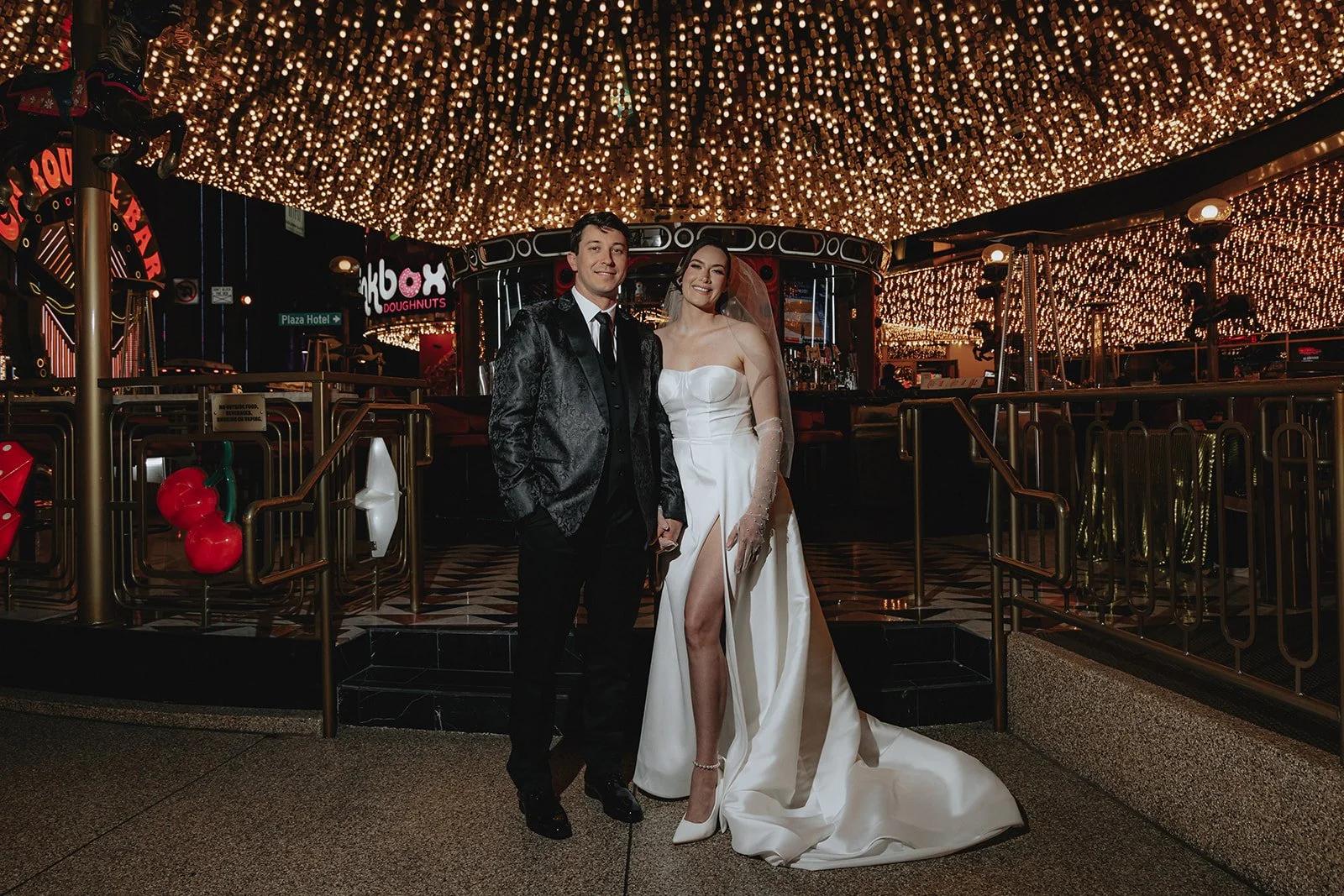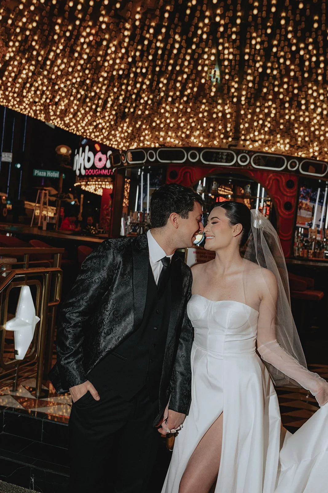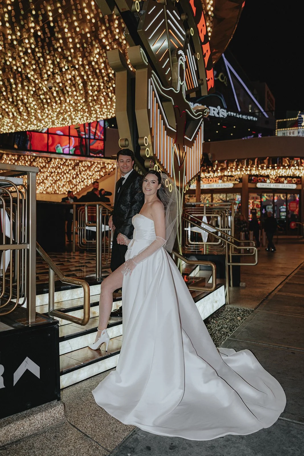 We started the night at the Plaza Hotel & Casino, a true Vegas icon. Picture a glittering ceiling of marquee bulbs, red velvet booths, and the kind of old-world beauty that makes you want to sip a dirty martini in a satin gown. Our bride looked like she’d stepped off the set of a retro Vegas rom-com, strapless satin dress, pearl anklet, sheer gloves, and a veil that caught the lights like a dream. Her groom, in a textured black jacket, helped her with her heels like a modern-day Prince Charming, and from that moment on, it was game on for the most effortlessly chic night ever!