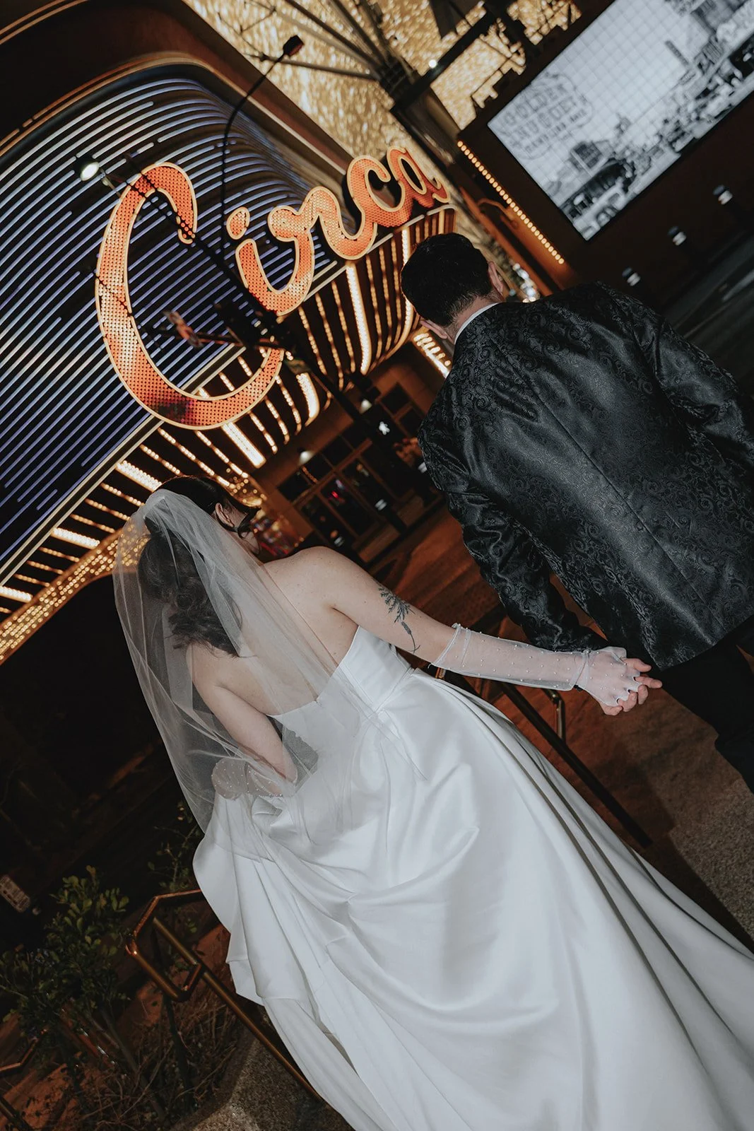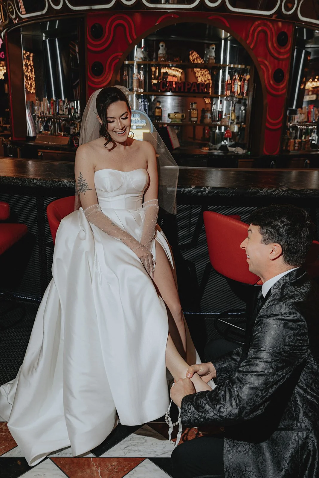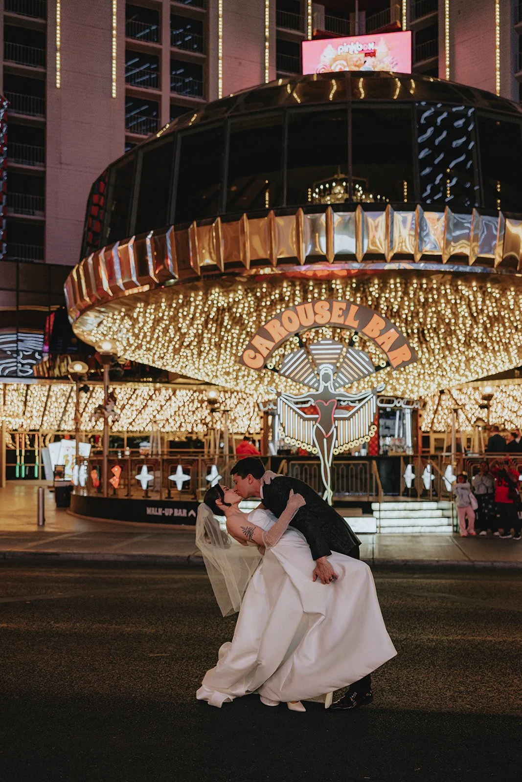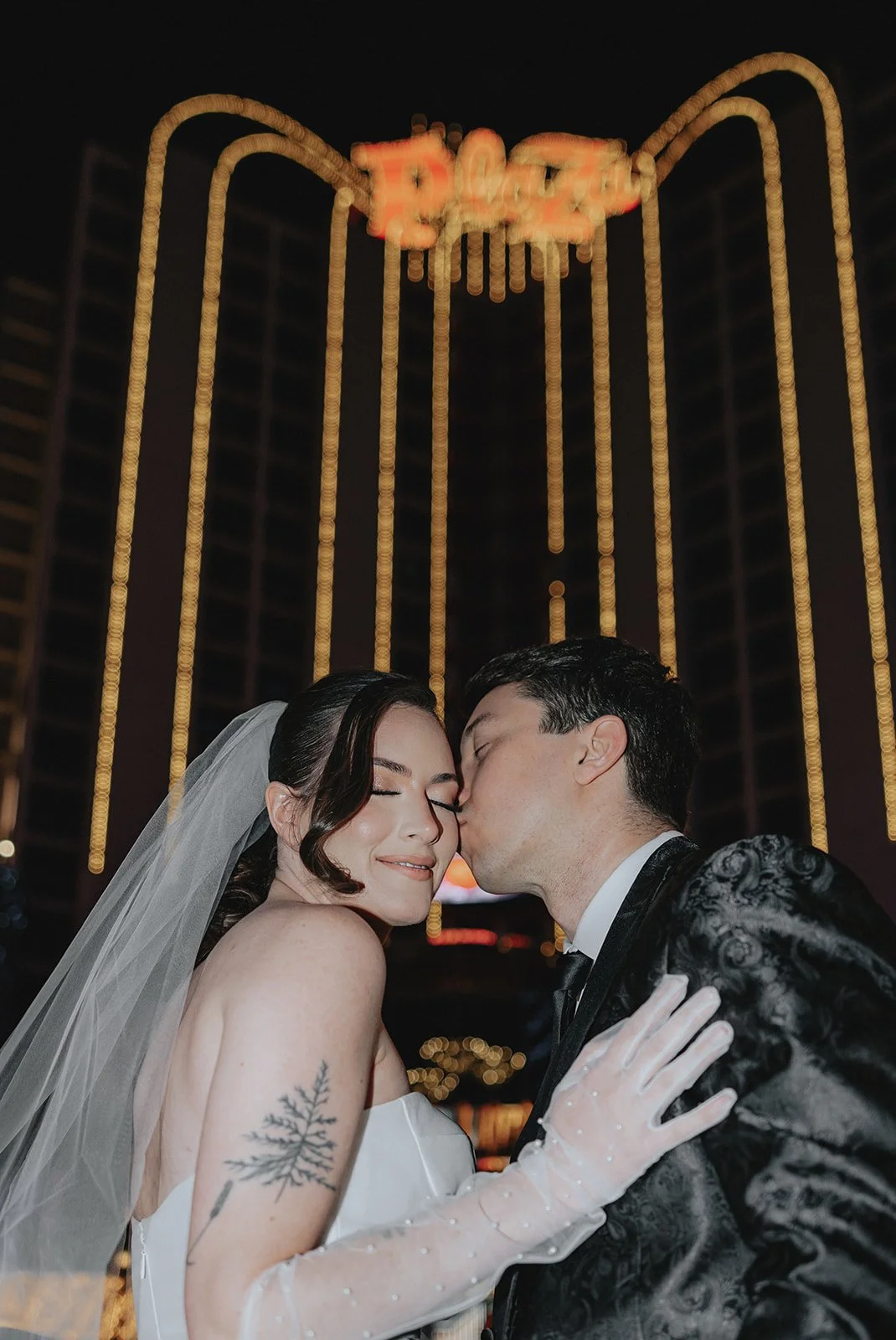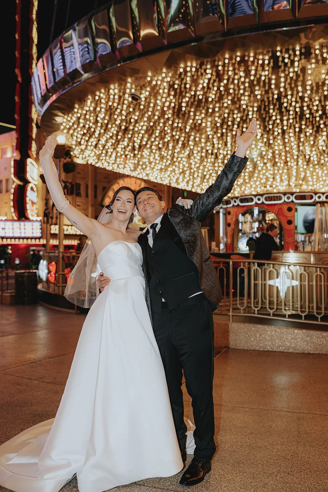 We started the night at the Plaza Hotel & Casino, a true Vegas icon. Picture a glittering ceiling of marquee bulbs, red velvet booths, and the kind of old-world beauty that makes you want to sip a dirty martini in a satin gown. Our bride looked like she’d stepped off the set of a retro Vegas rom-com, strapless satin dress, pearl anklet, sheer gloves, and a veil that caught the lights like a dream. Her groom, in a textured black jacket, helped her with her heels like a modern-day Prince Charming, and from that moment on, it was game on for the most effortlessly chic night ever!