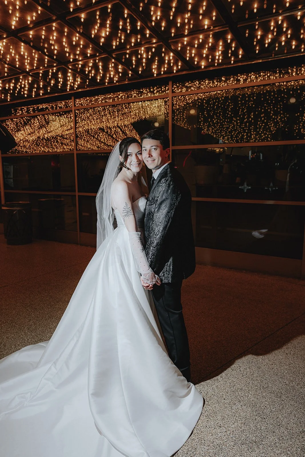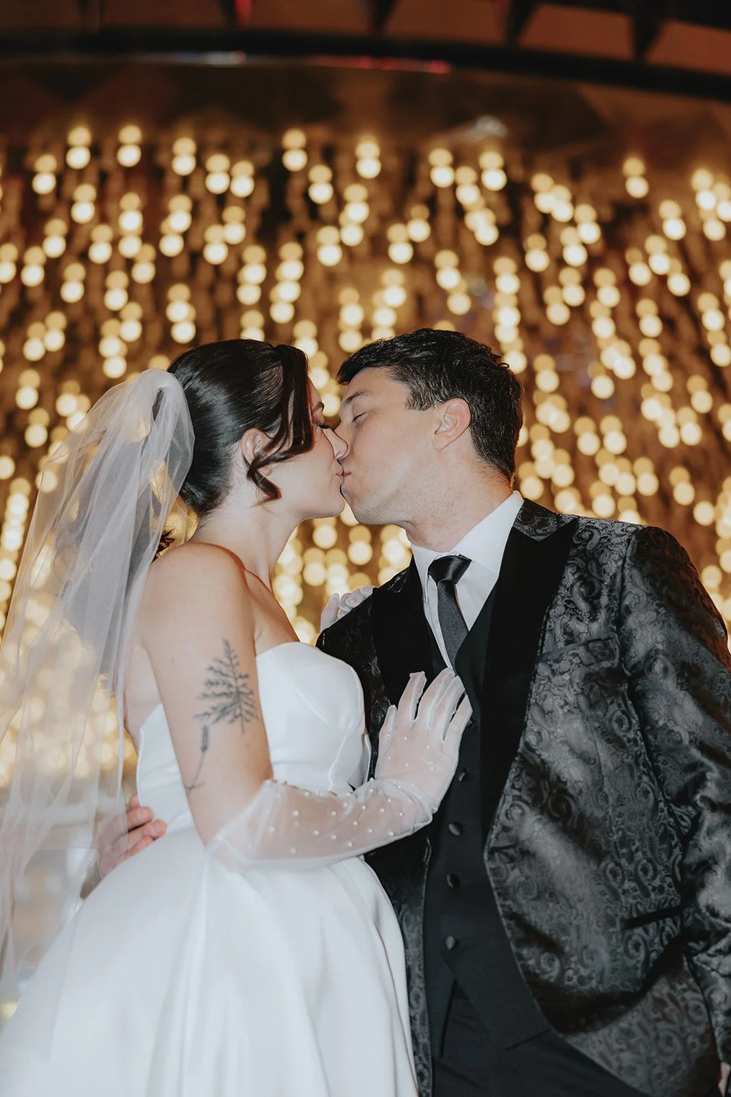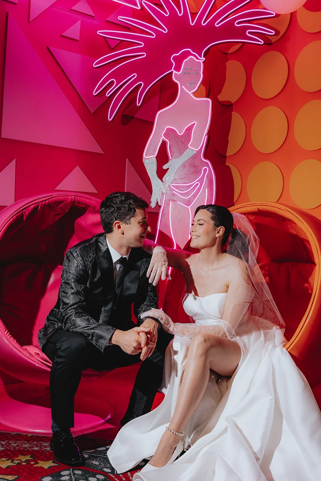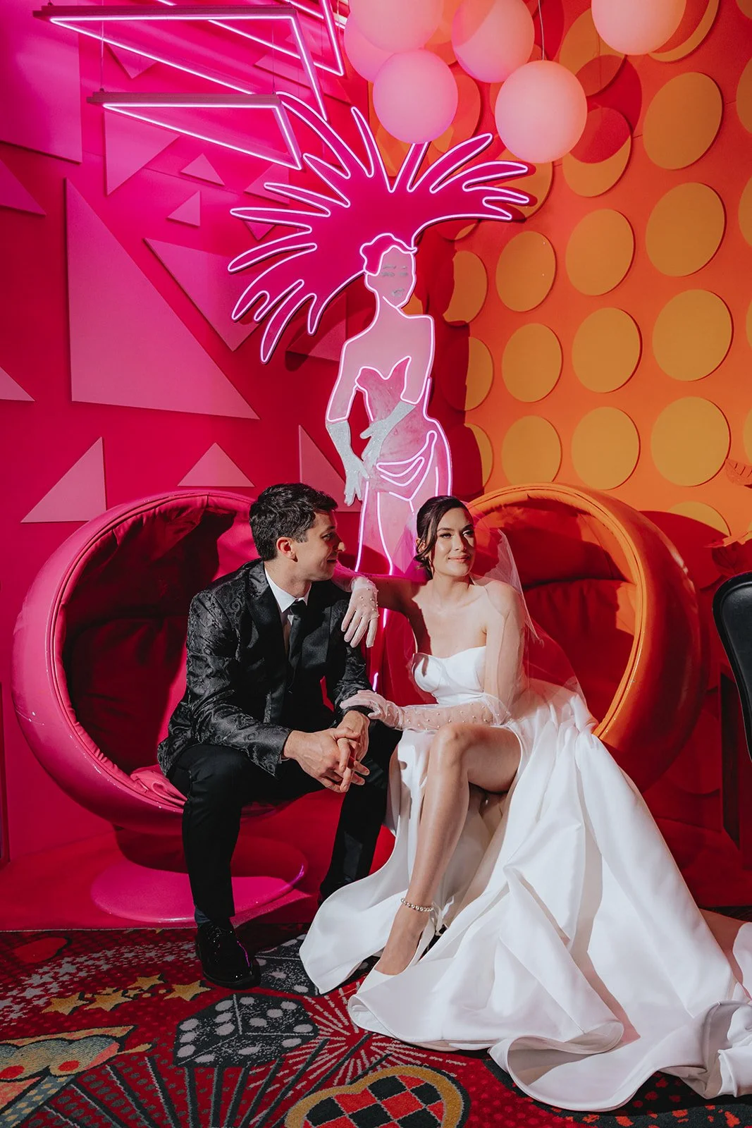 We started the night at the Plaza Hotel & Casino, a true Vegas icon. Picture a glittering ceiling of marquee bulbs, red velvet booths, and the kind of old-world beauty that makes you want to sip a dirty martini in a satin gown. Our bride looked like she’d stepped off the set of a retro Vegas rom-com, strapless satin dress, pearl anklet, sheer gloves, and a veil that caught the lights like a dream. Her groom, in a textured black jacket, helped her with her heels like a modern-day Prince Charming, and from that moment on, it was game on for the most effortlessly chic night ever!