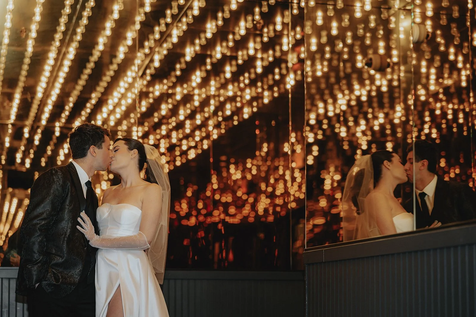 Then we hit Fremont. The city felt alive, and so did they. Under the electric sky near Circa and the Slotzilla zipline, they danced, kissed, twirled, completely in their own world while the rest of Vegas buzzed around them. We leaned into the blur, letting motion and movement create that cinematic energy. Cars rushed by, people cheered from across the street, and they just smiled at each other like nothing else mattered. We ended the night in front of some seriously dazzling mirror walls, golden lights above, reflections all around. It was giving hall of glam, giving old Hollywood meets Vegas nightlife.