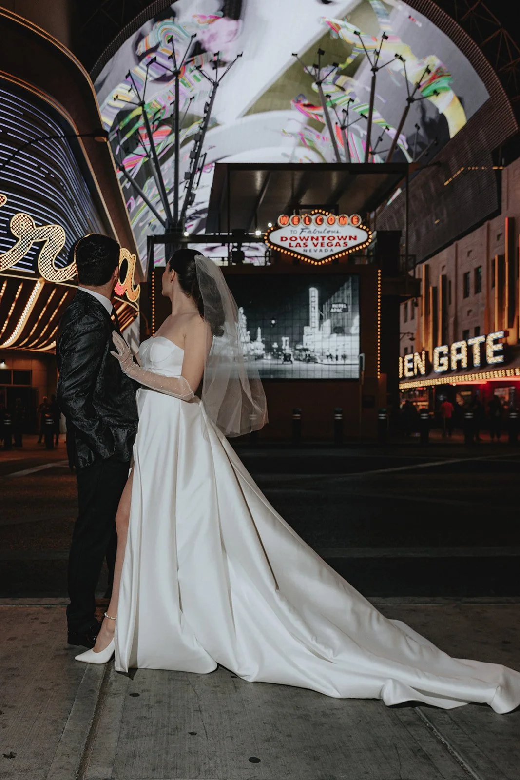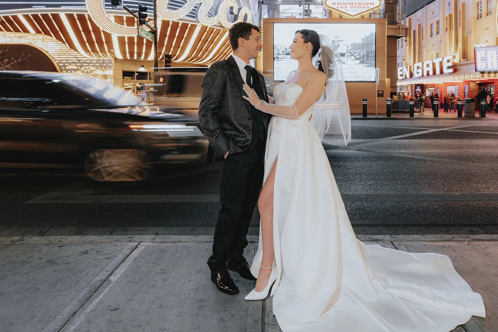 There’s just something about Downtown Las Vegas at night, the way the lights drip like golden chandeliers, the scent of old-school glamour and new-age thrill in the air, the pulse of Fremont Street turning every moment into a scene from a film. That’s exactly what this bridal portrait session was: a little bit vintage, a little bit rock ‘n’ roll, and a whole lotta love under the neon sky.