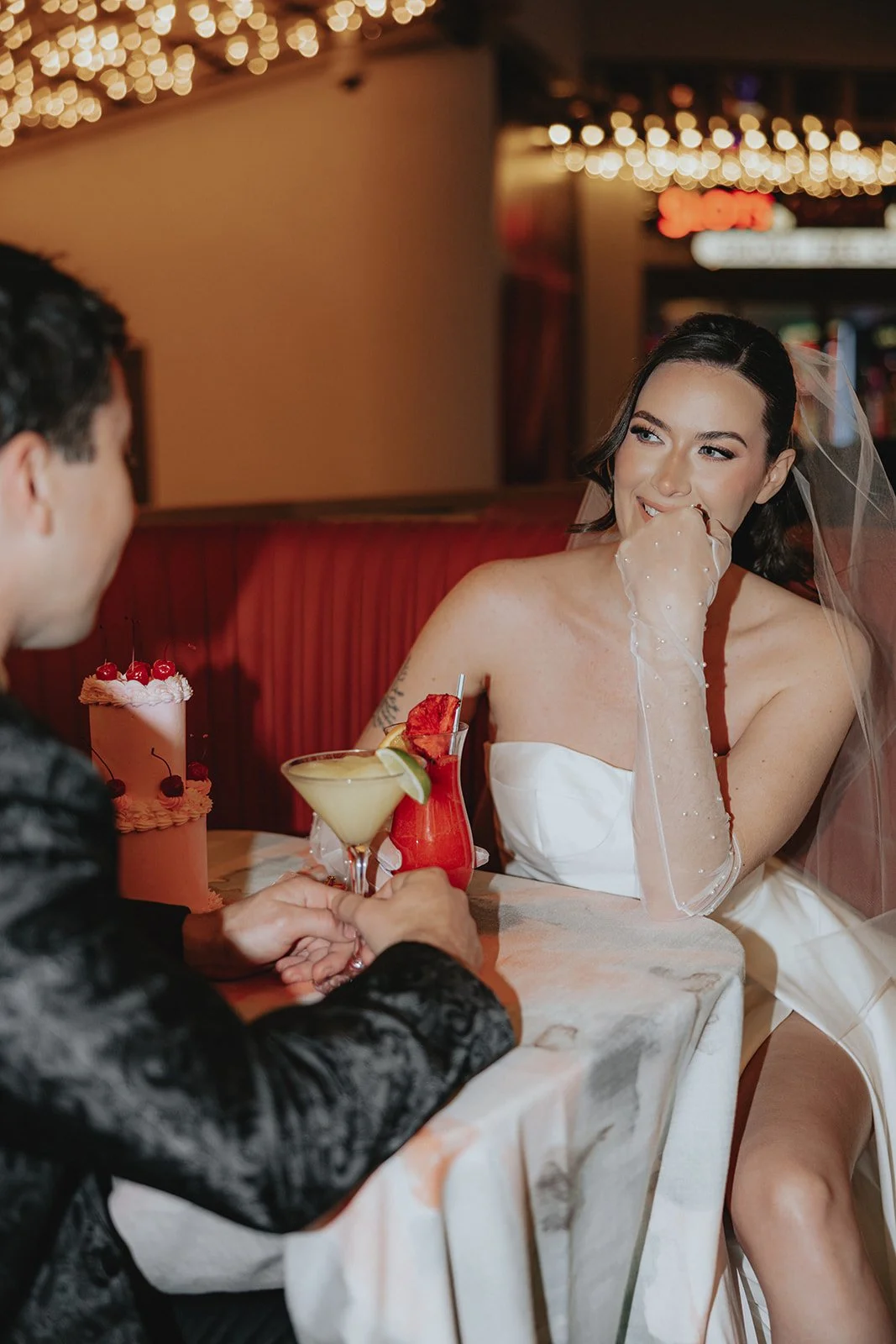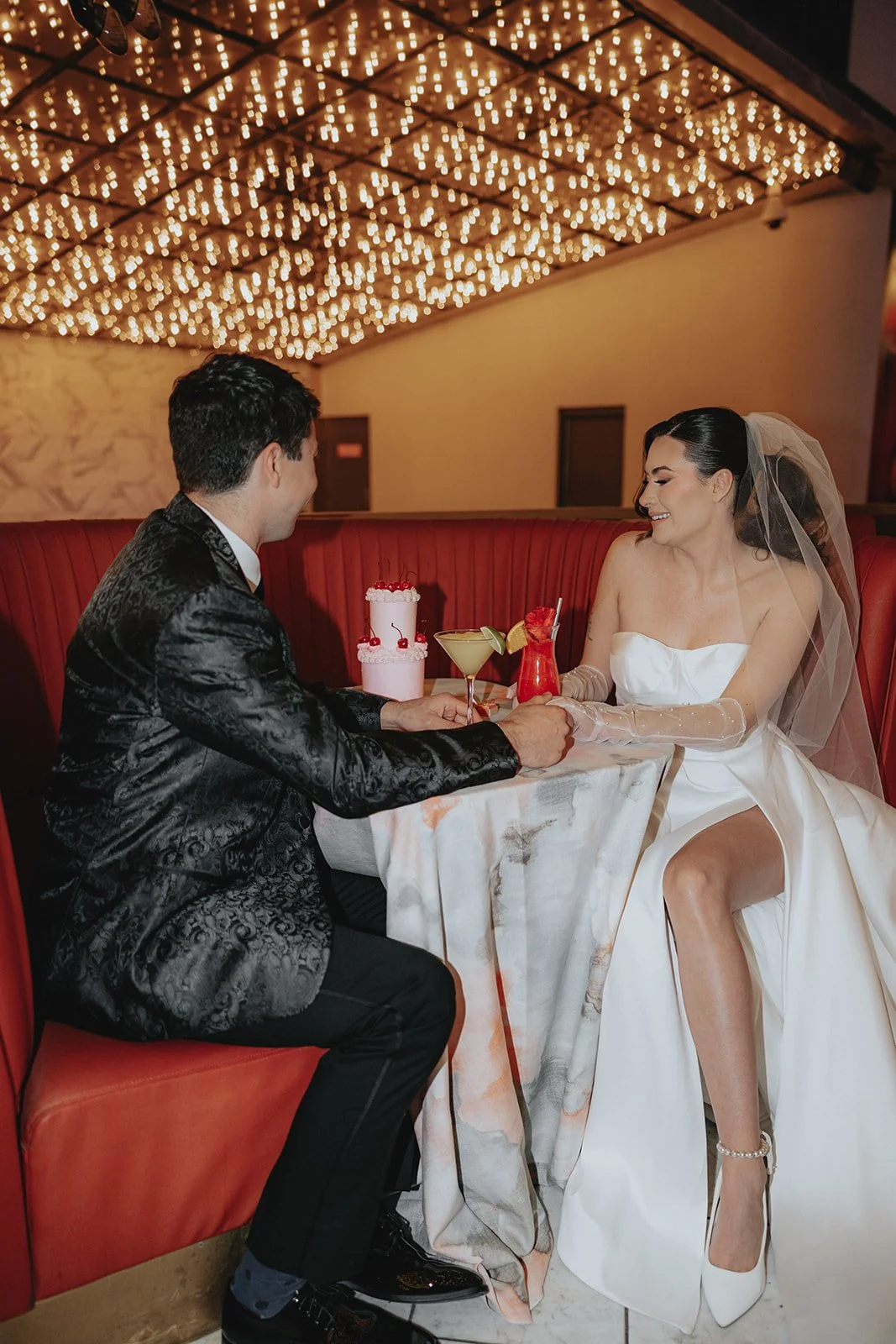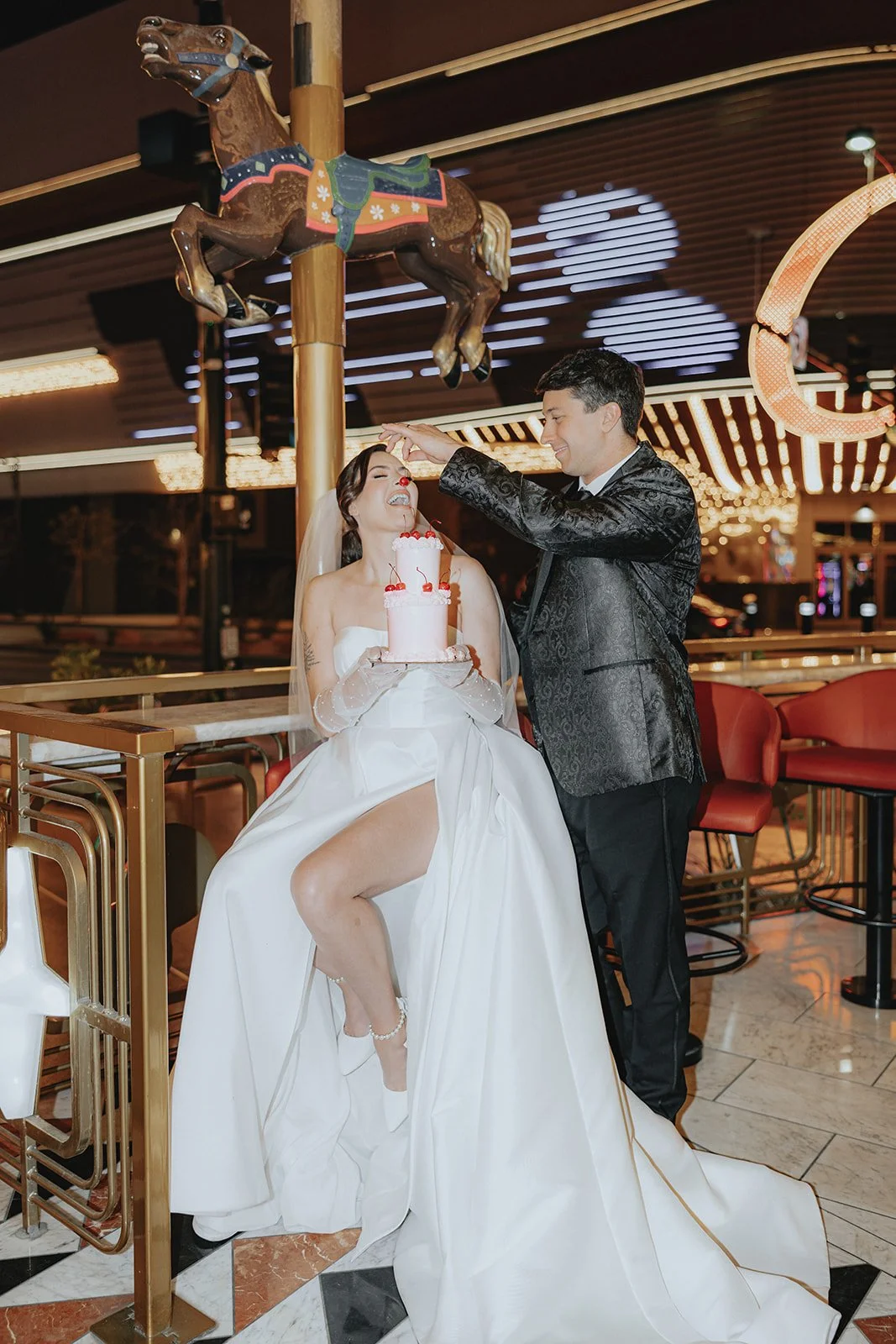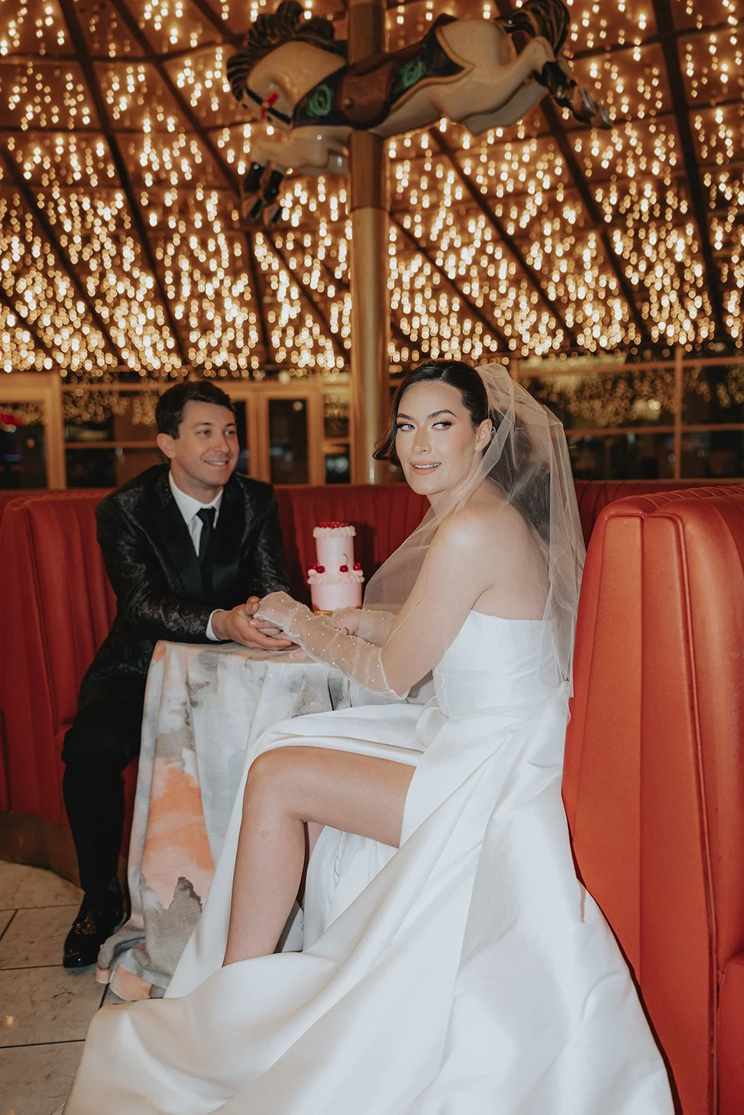 The Plaza’s Carousel Bar felt like it was made for bridal portraits. The lights, the reflections, the drama, we were obsessed! It’s like the room knew it was about to be the backdrop for something iconic. These two cozied up in red booths with cherry-topped cocktails and their little retro cake that felt more like an art piece than dessert. They laughed, snacked, toasted, and danced in between sips, it felt like a mini reception for two in the middle of the madness. And let’s talk Carousel Bar for a second. This is your sign to not skip it. It’s bold, playful, and undeniably photogenic. Want your bridal portraits to feel like a scene from a romantic Vegas movie? This is the spot! Even just stepping outside the bar into the Plaza’s entrance lights gives you that iconic downtown vibe without even needing to walk far.