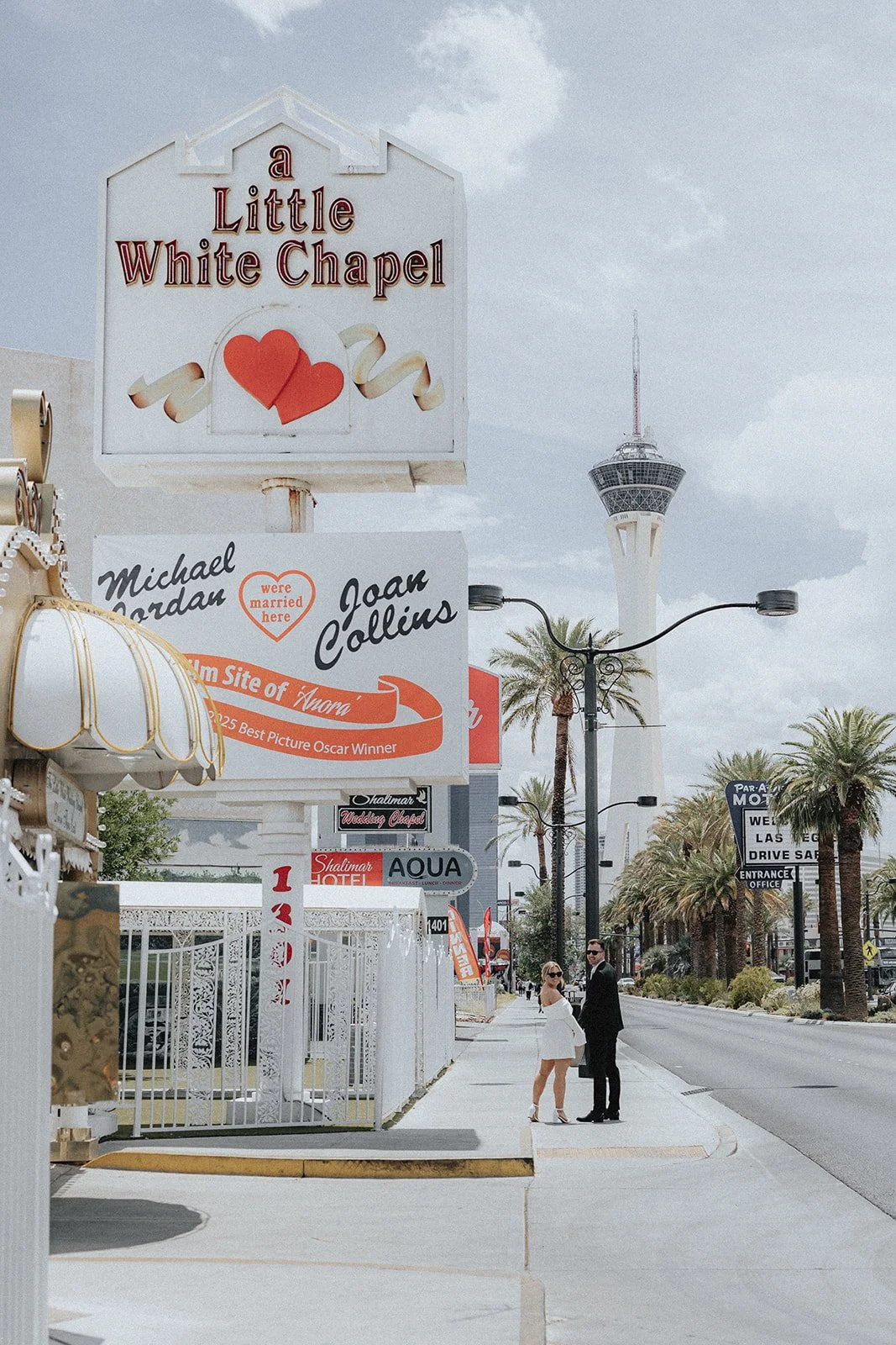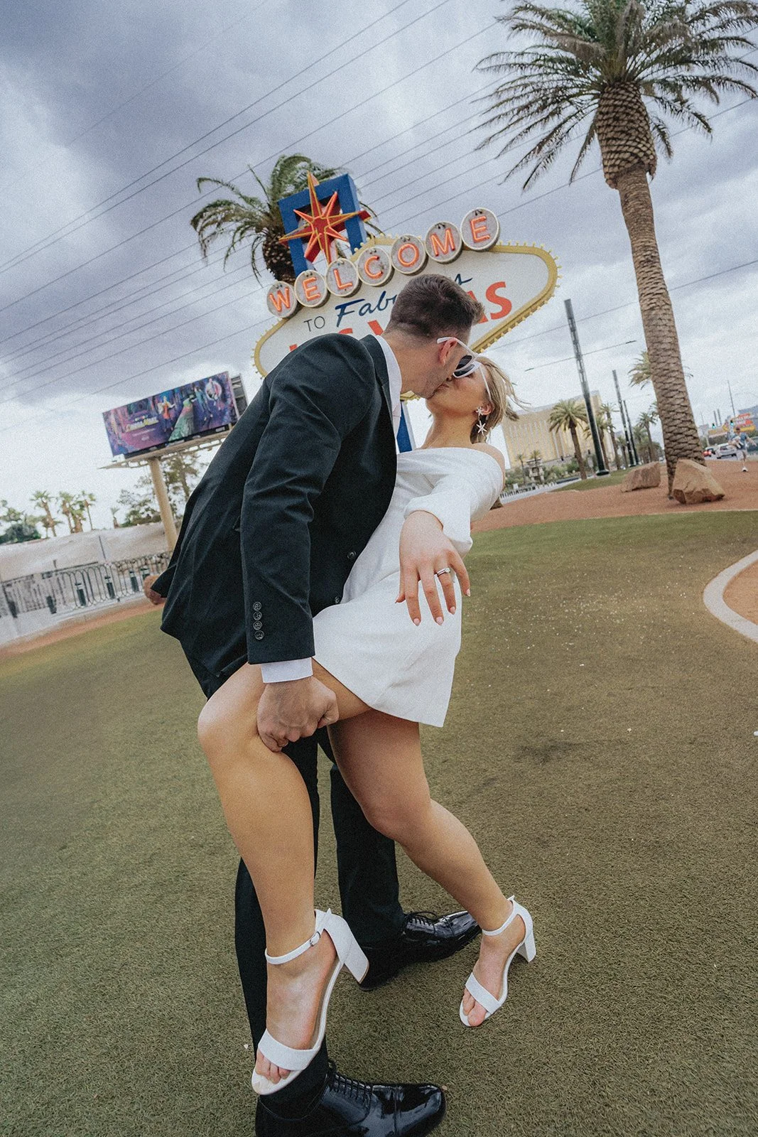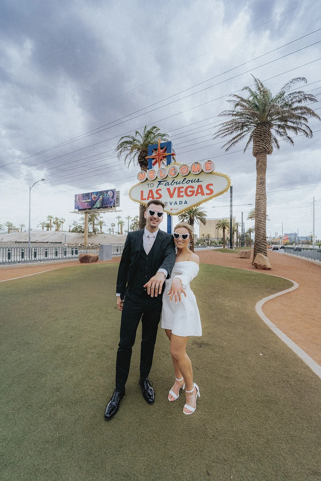 They strolled hand in hand beneath the chapel’s famous signs, exchanged vows inside the all-white, softly lit chapel, and sealed their marriage beneath the mural that read: “Our Marriage Was Made in Heaven.” Honestly? Couldn’t have said it better ourselves. After their ceremony, we hit a few nearby Vegas landmarks, including a pit stop at the Welcome to Fabulous Las Vegas sign. You could just feel the joy radiating off them. They were officially married, soaking up the desert sunshine, and fully leaning into the spontaneity of it all. It was romantic, fun, and just a little cheeky, which is exactly what we love about elopements like this!