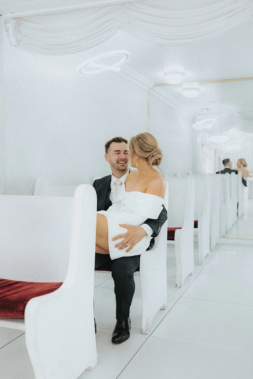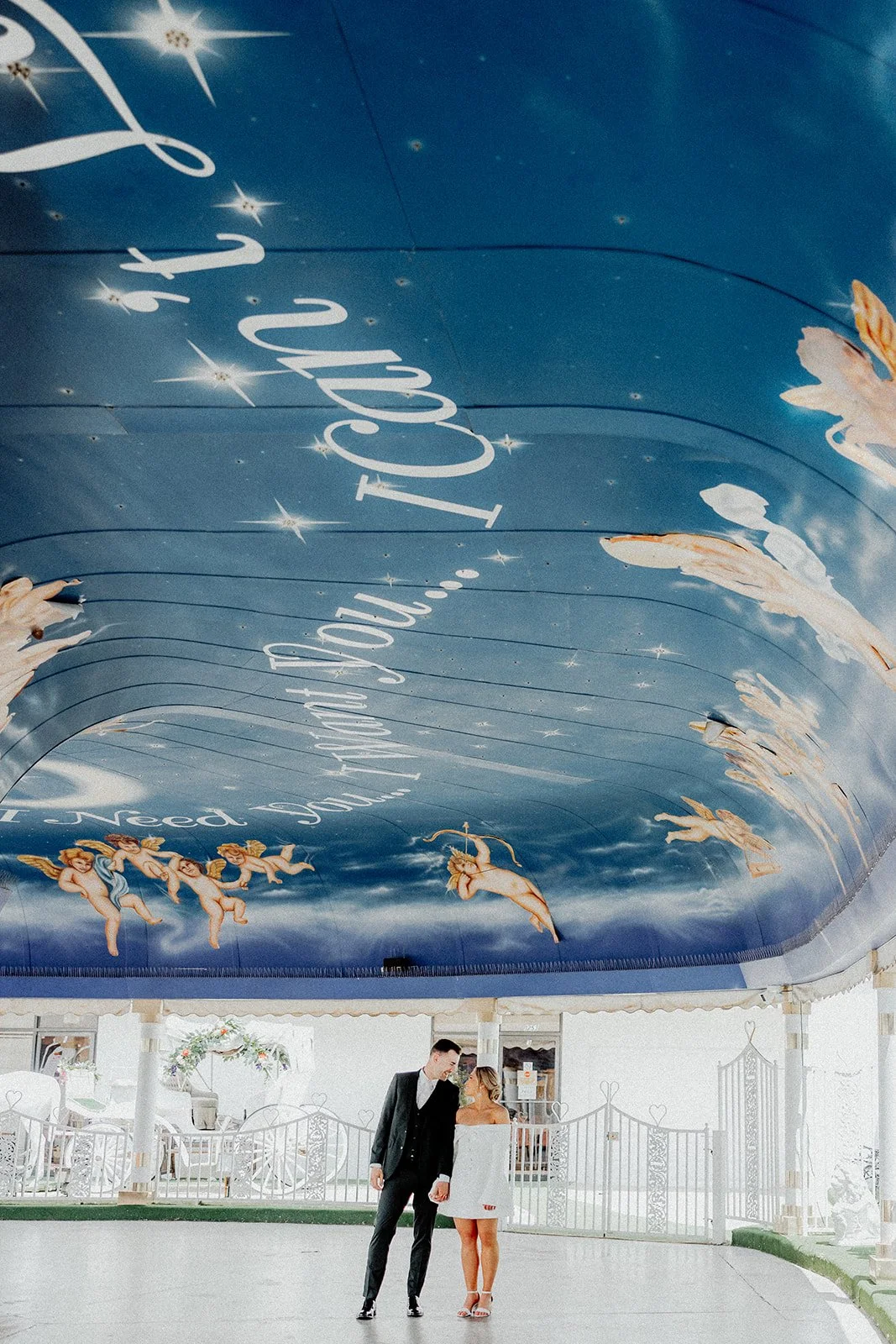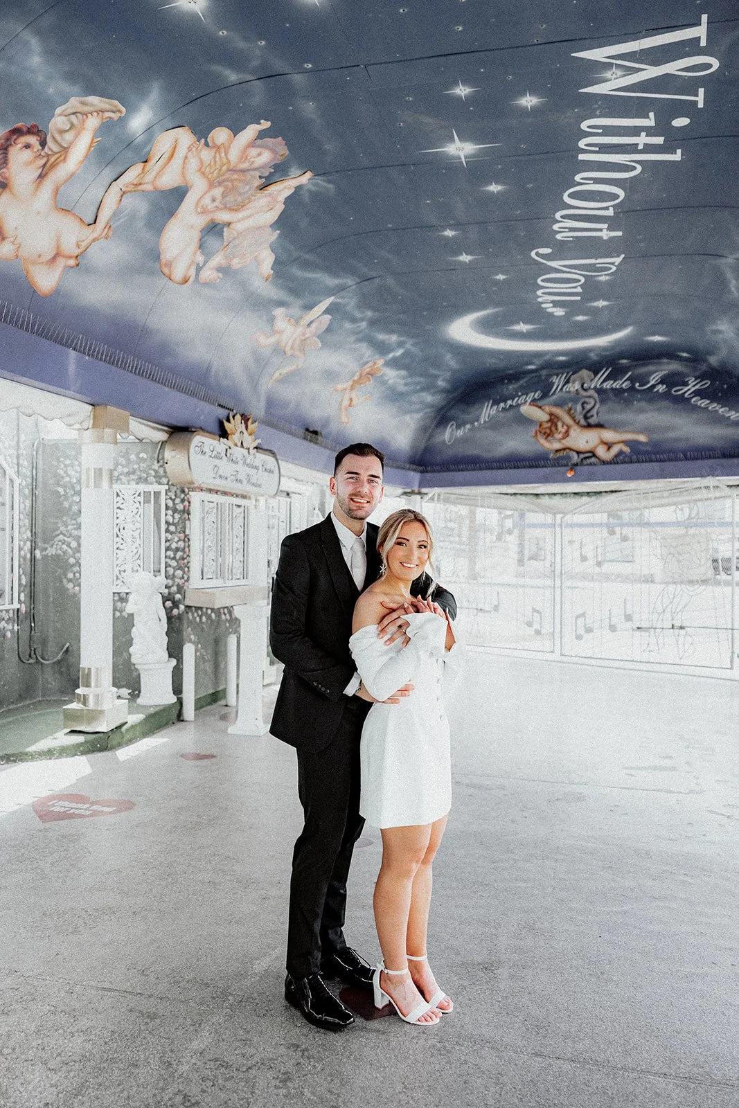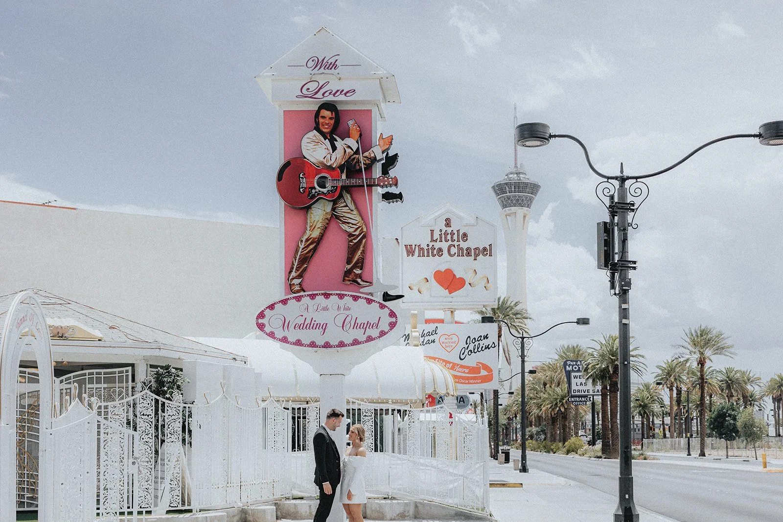 They strolled hand in hand beneath the chapel’s famous signs, exchanged vows inside the all-white, softly lit chapel, and sealed their marriage beneath the mural that read: “Our Marriage Was Made in Heaven.” Honestly? Couldn’t have said it better ourselves. After their ceremony, we hit a few nearby Vegas landmarks, including a pit stop at the Welcome to Fabulous Las Vegas sign. You could just feel the joy radiating off them. They were officially married, soaking up the desert sunshine, and fully leaning into the spontaneity of it all. It was romantic, fun, and just a little cheeky, which is exactly what we love about elopements like this!