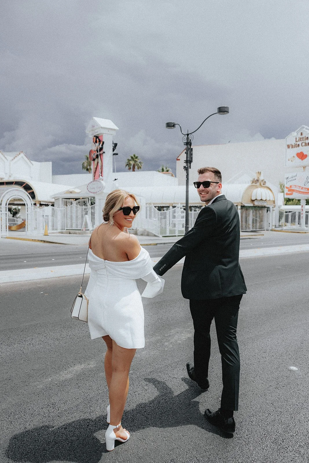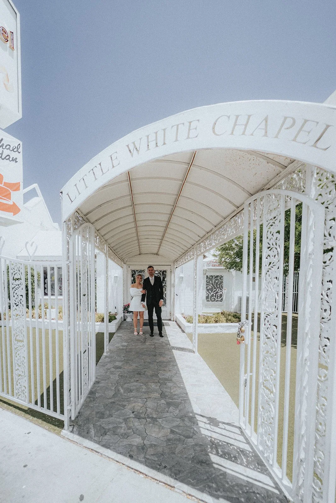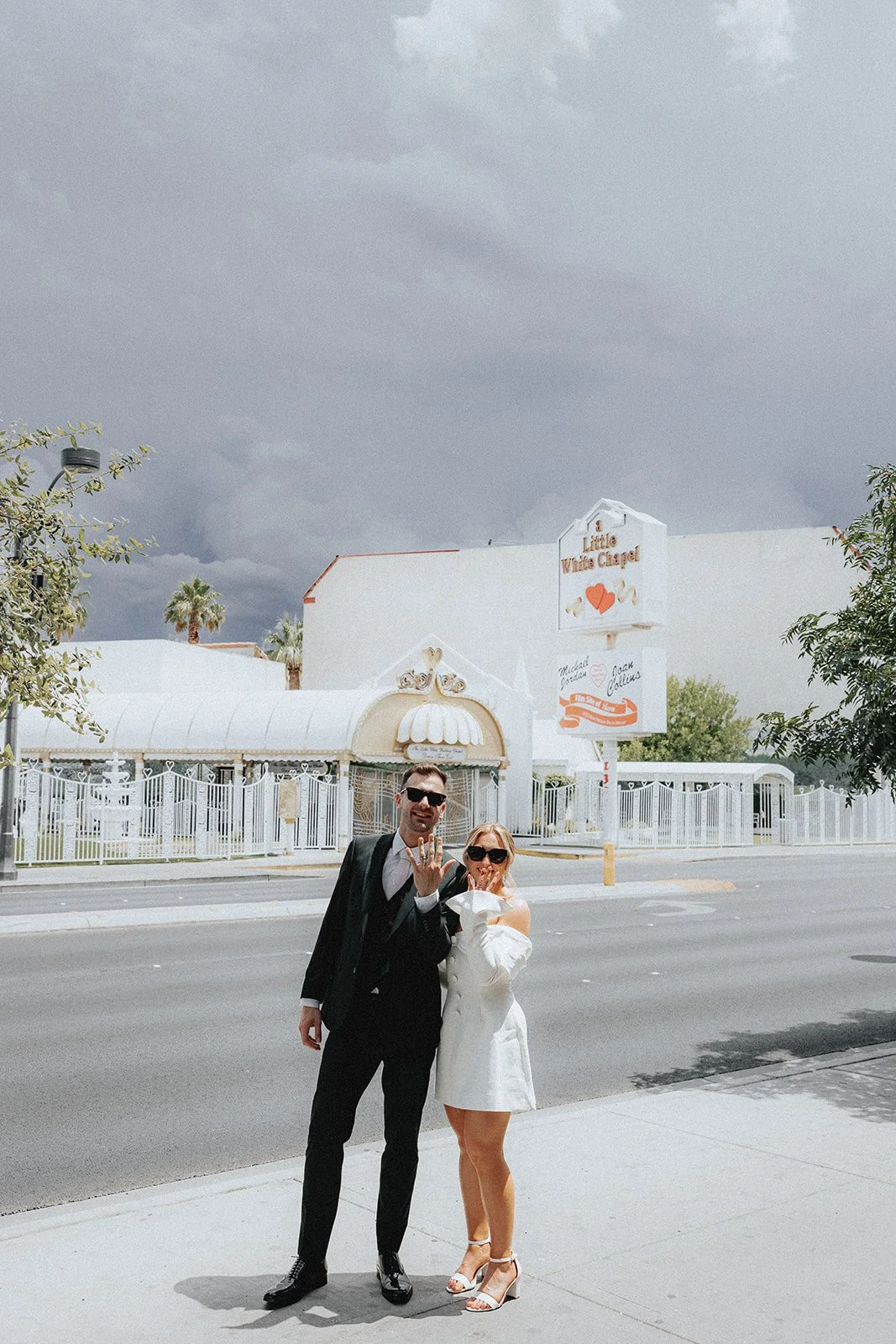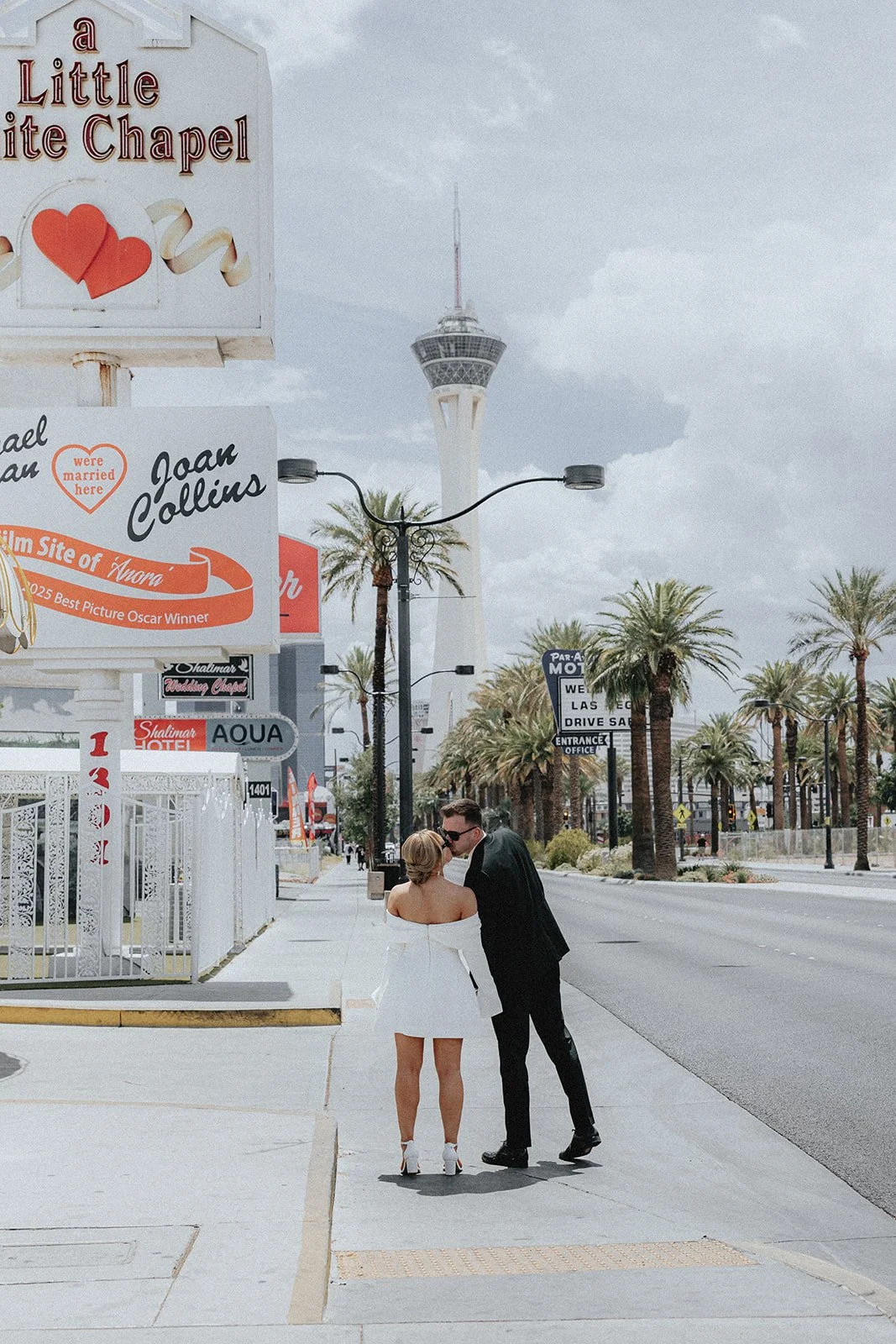 The first chapter of Claire and Chris’s elopement began at the one and only A Little White Chapel, a Vegas icon that’s seen more love stories than we can count (and still makes every single one feel like a movie moment). Claire wore a short off-the-shoulder dress with the chicest oversized bow in the back, and Chris kept it classic in a black suit and crisp white shirt. Together, they looked straight out of a European fashion editorial, but with that laid-back love energy that made everything feel real and relaxed!