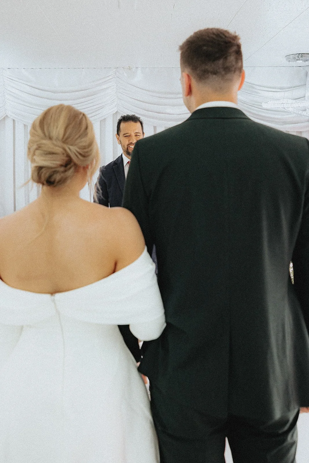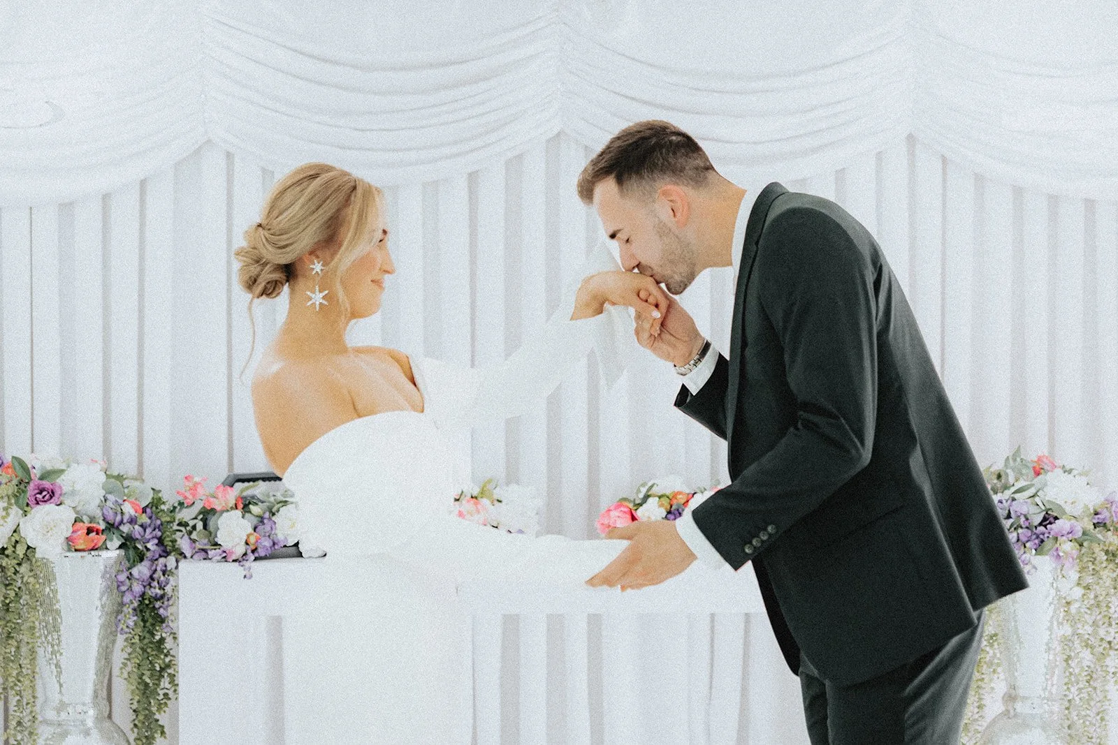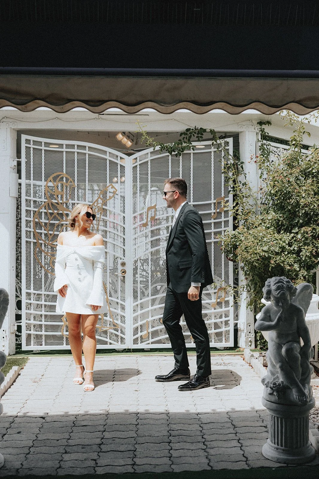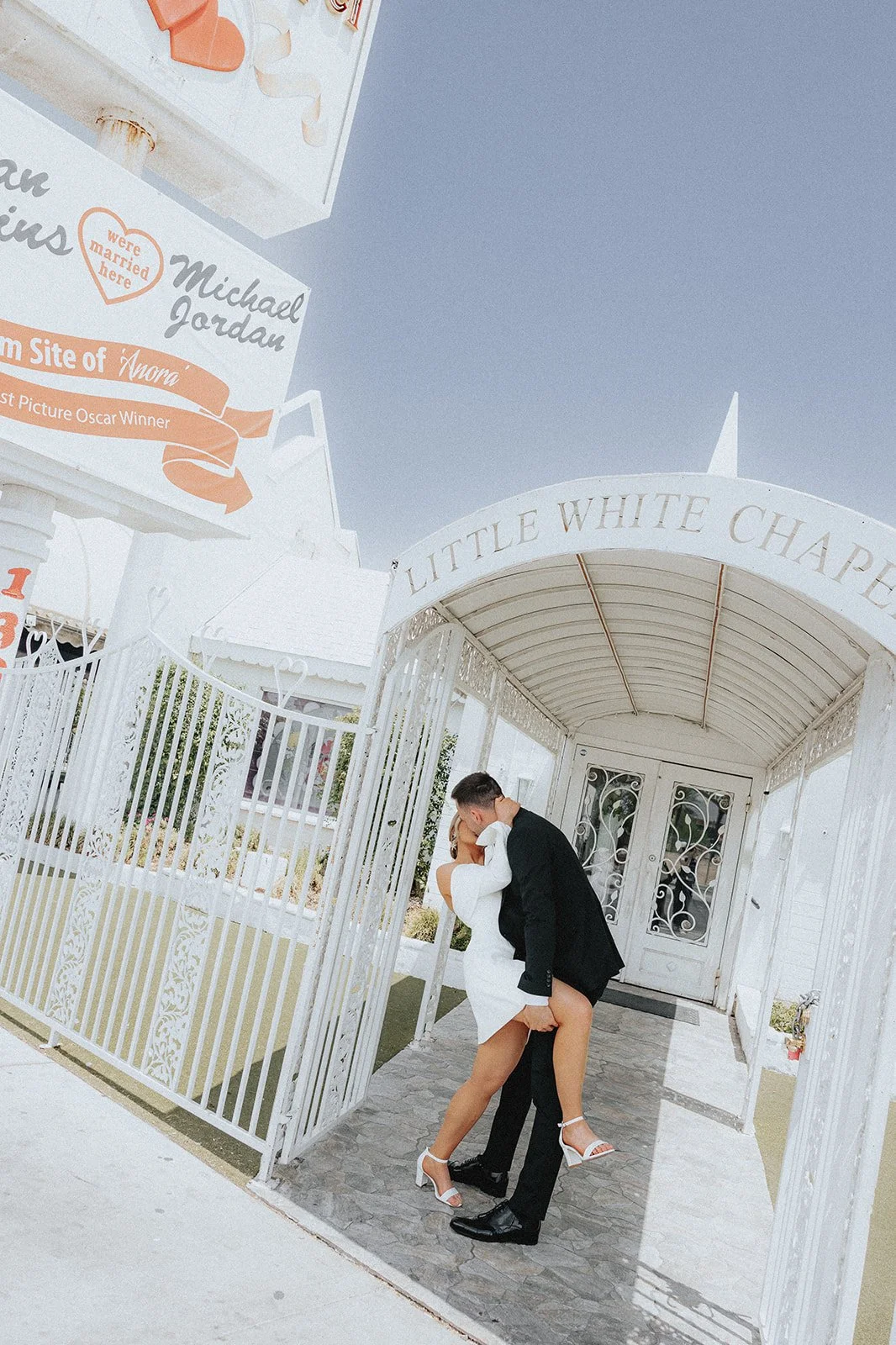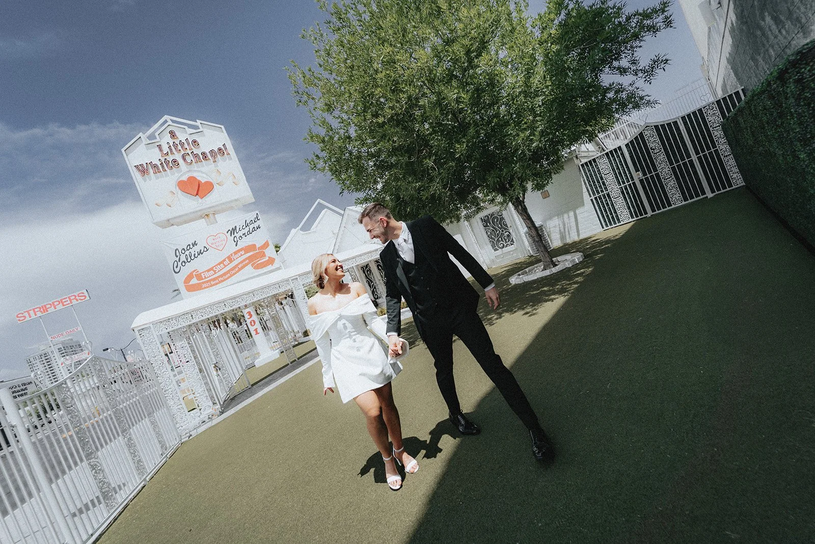 The first chapter of Claire and Chris’s elopement began at the one and only A Little White Chapel, a Vegas icon that’s seen more love stories than we can count (and still makes every single one feel like a movie moment). Claire wore a short off-the-shoulder dress with the chicest oversized bow in the back, and Chris kept it classic in a black suit and crisp white shirt. Together, they looked straight out of a European fashion editorial, but with that laid-back love energy that made everything feel real and relaxed!