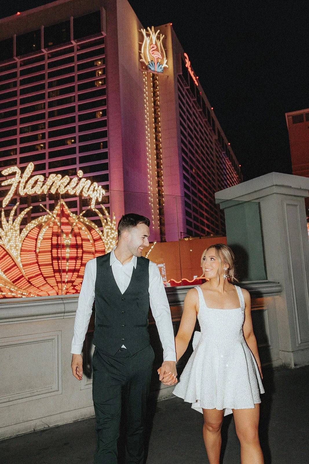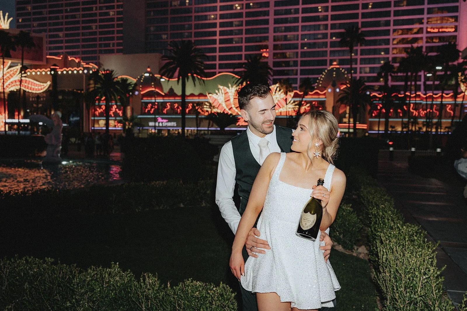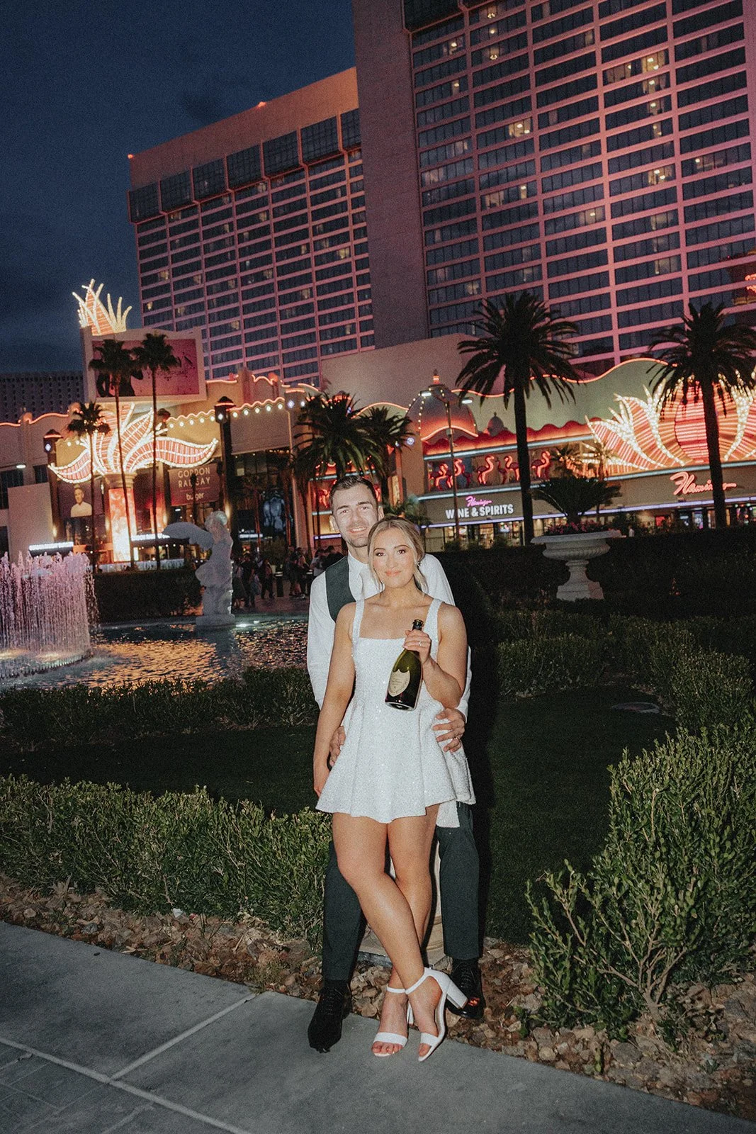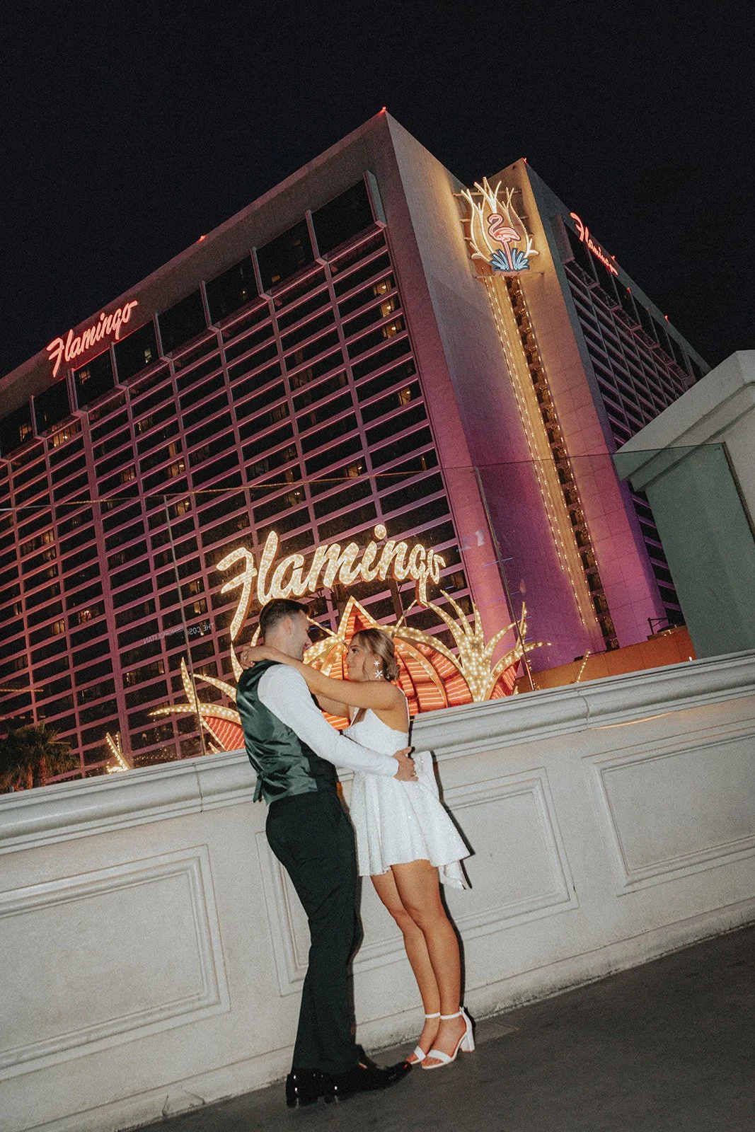 The next evening, we picked things back up in the heart of the Strip, and this part of the day was all about golden light, champagne bottles, and Vegas glitz. Claire slipped into a sparkly white mini dress that shimmered against the lights of the casinos, while Chris ditched the blazer and went full cool-guy-in-Vegas mode. The energy was different from the day before, looser, flirtier, and full of playful “we freaking did it!” energy. We wandered around Paris Las Vegas, with views of the Eiffel Tower and Bellagio fountains in the distance, soaking in those classic Vegas visuals. They cuddled up near fountains, danced under street lights, and looked completely smitten the whole way through. The night ended at The Flamingo, where the neon pink glow lit them up like the stars they are. You could feel how intentional this whole elopement was, not just in the way it was styled, but in how it gave them the freedom to stretch out the celebration. No rushing, no fuss. Just time to be present together, to celebrate in stages, and to savor it all.