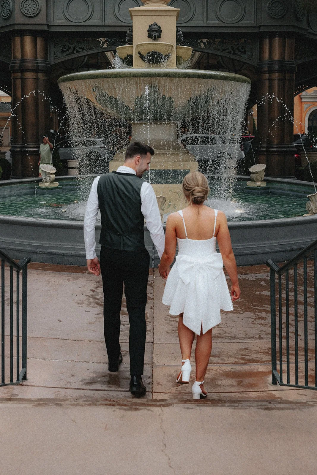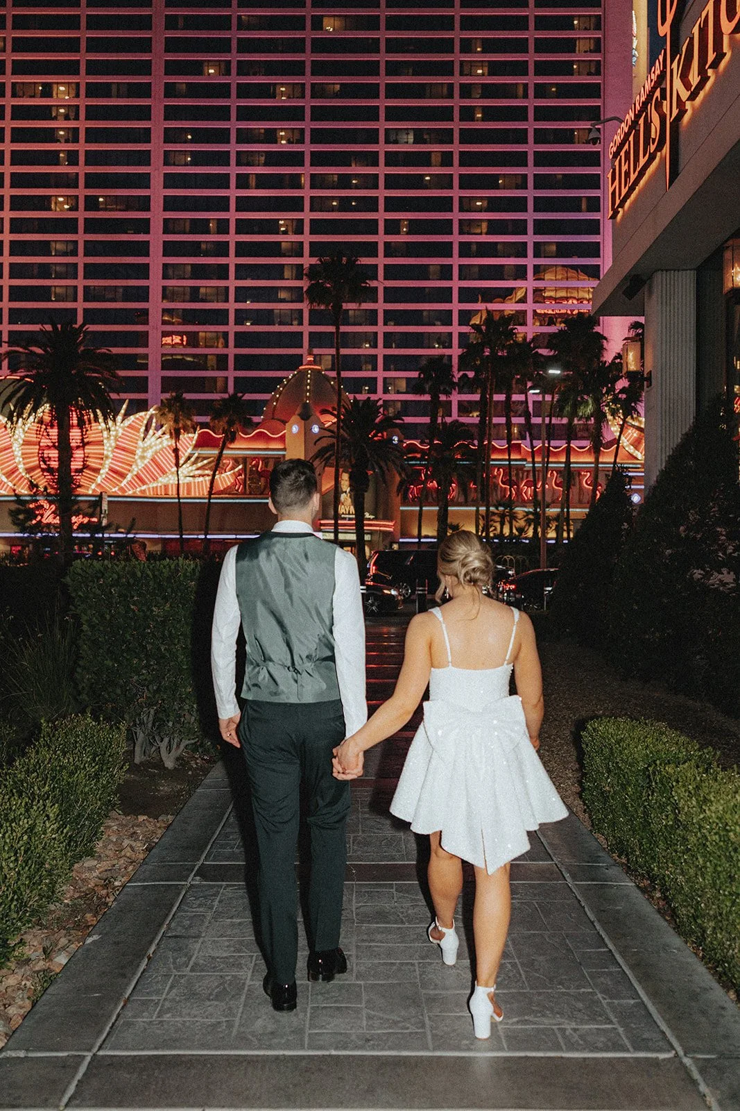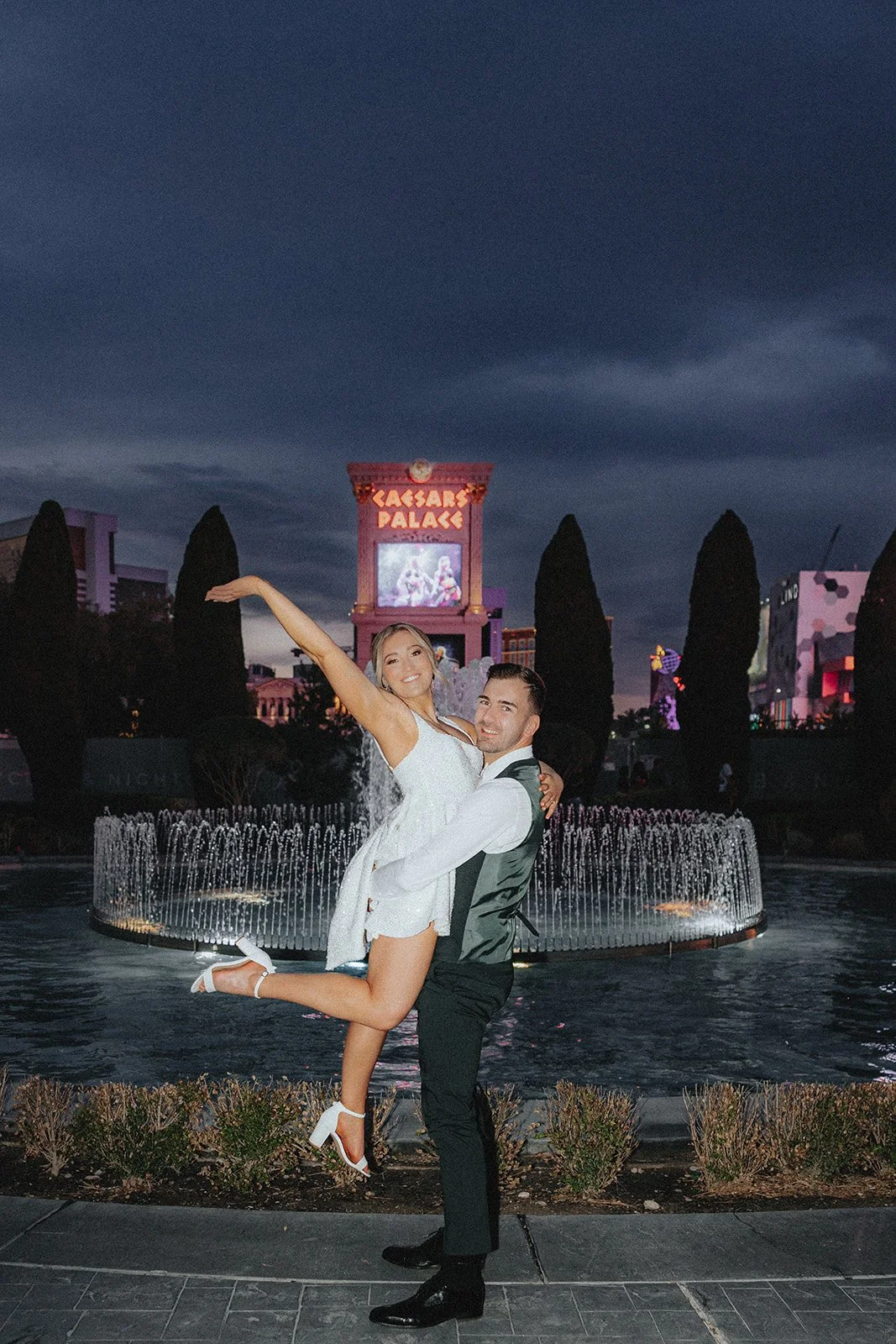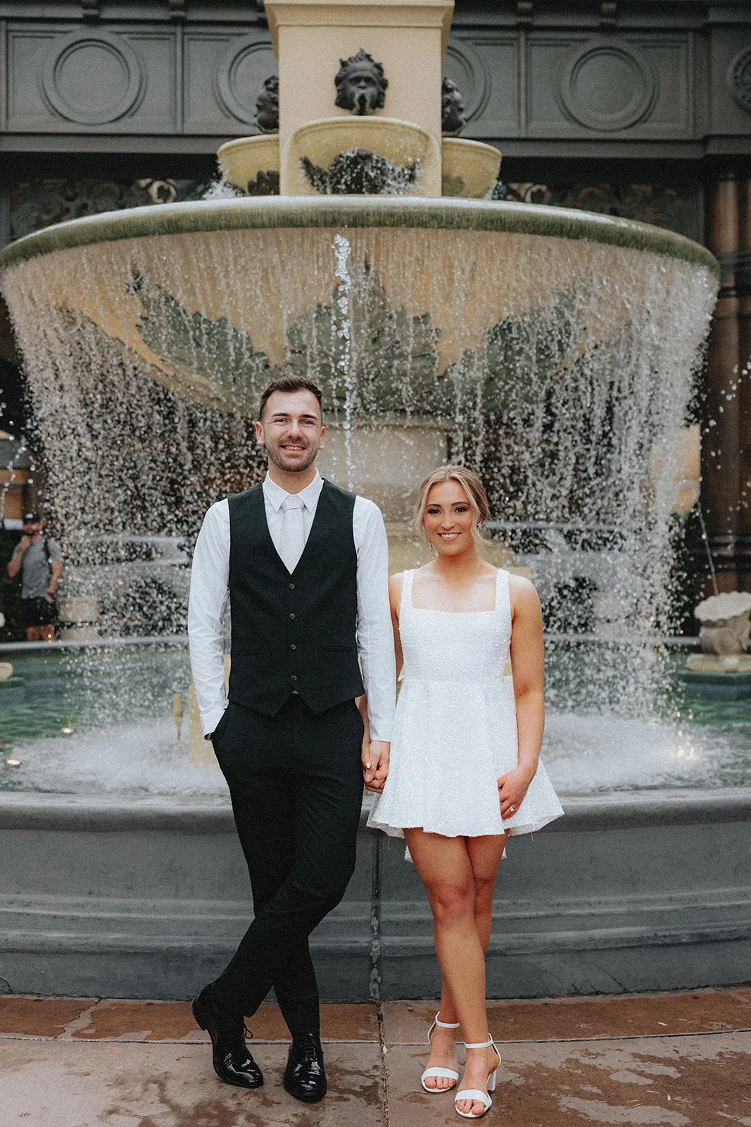 The next evening, we picked things back up in the heart of the Strip, and this part of the day was all about golden light, champagne bottles, and Vegas glitz. Claire slipped into a sparkly white mini dress that shimmered against the lights of the casinos, while Chris ditched the blazer and went full cool-guy-in-Vegas mode. The energy was different from the day before, looser, flirtier, and full of playful “we freaking did it!” energy. We wandered around Paris Las Vegas, with views of the Eiffel Tower and Bellagio fountains in the distance, soaking in those classic Vegas visuals. They cuddled up near fountains, danced under street lights, and looked completely smitten the whole way through. The night ended at The Flamingo, where the neon pink glow lit them up like the stars they are. You could feel how intentional this whole elopement was, not just in the way it was styled, but in how it gave them the freedom to stretch out the celebration. No rushing, no fuss. Just time to be present together, to celebrate in stages, and to savor it all.