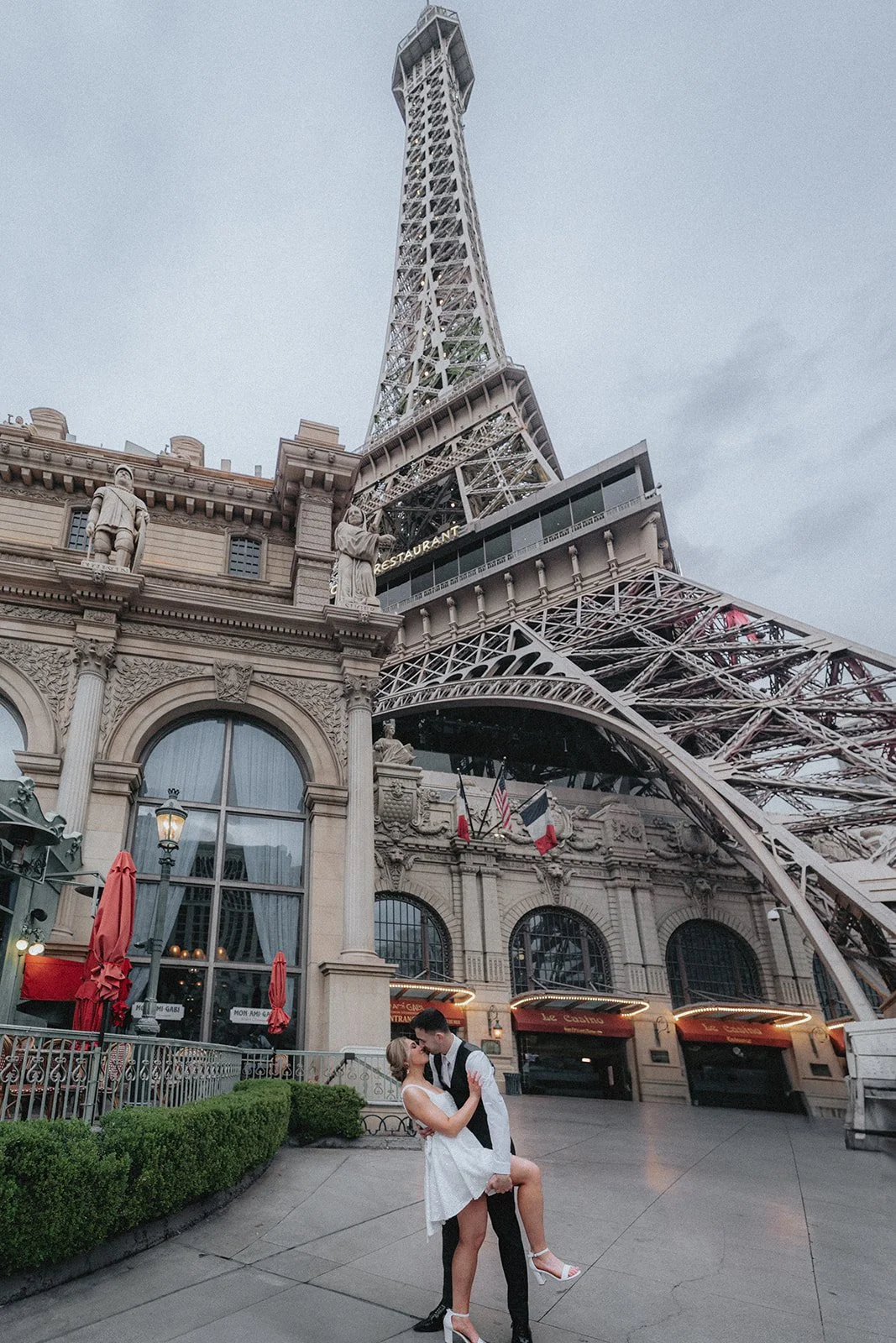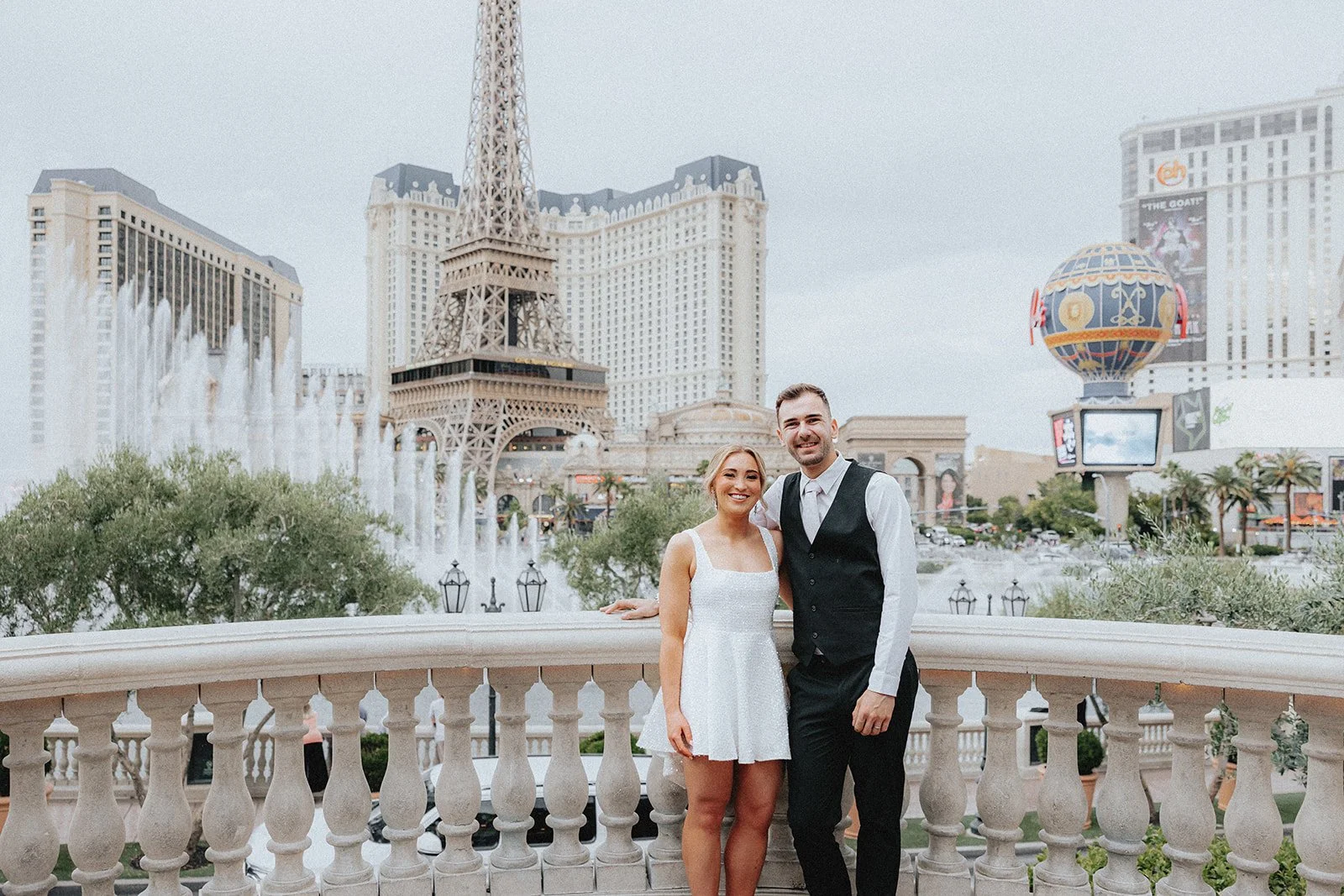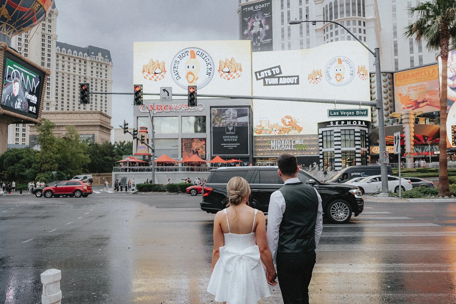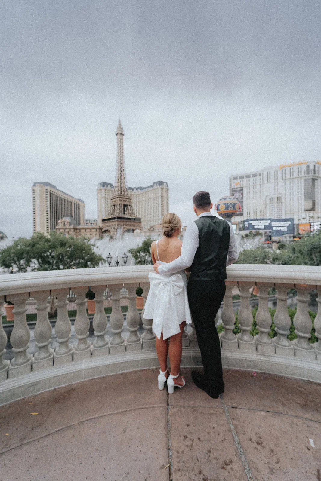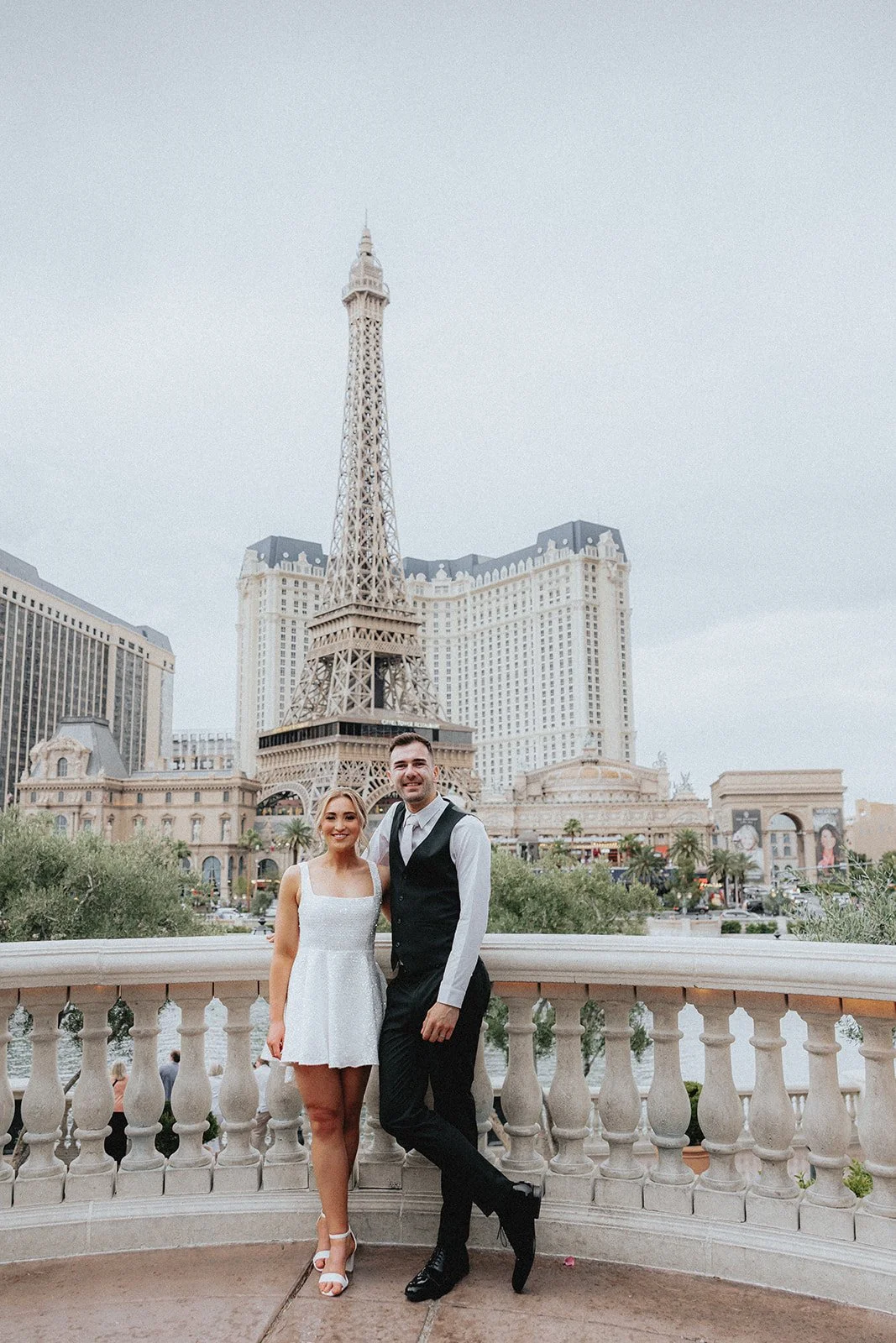 The next evening, we picked things back up in the heart of the Strip, and this part of the day was all about golden light, champagne bottles, and Vegas glitz. Claire slipped into a sparkly white mini dress that shimmered against the lights of the casinos, while Chris ditched the blazer and went full cool-guy-in-Vegas mode. The energy was different from the day before, looser, flirtier, and full of playful “we freaking did it!” energy. We wandered around Paris Las Vegas, with views of the Eiffel Tower and Bellagio fountains in the distance, soaking in those classic Vegas visuals. They cuddled up near fountains, danced under street lights, and looked completely smitten the whole way through. The night ended at The Flamingo, where the neon pink glow lit them up like the stars they are. You could feel how intentional this whole elopement was, not just in the way it was styled, but in how it gave them the freedom to stretch out the celebration. No rushing, no fuss. Just time to be present together, to celebrate in stages, and to savor it all.