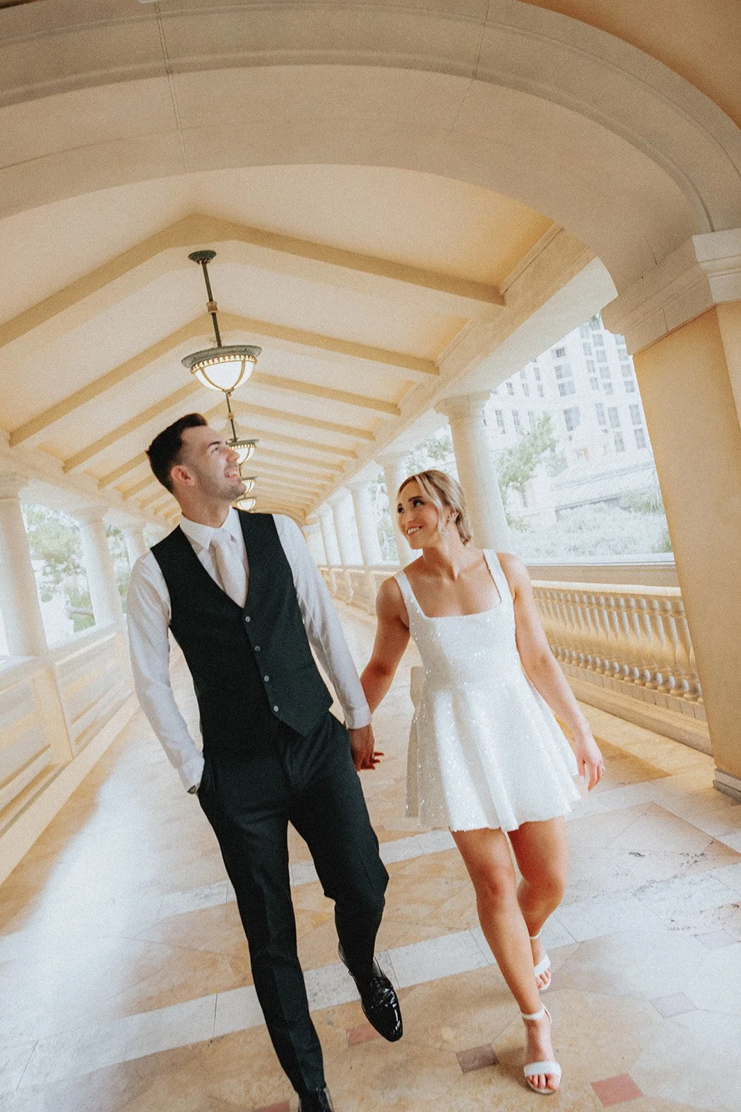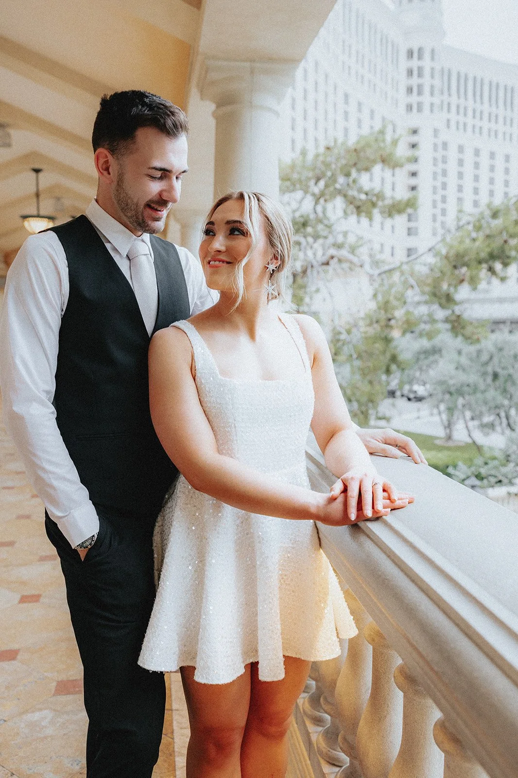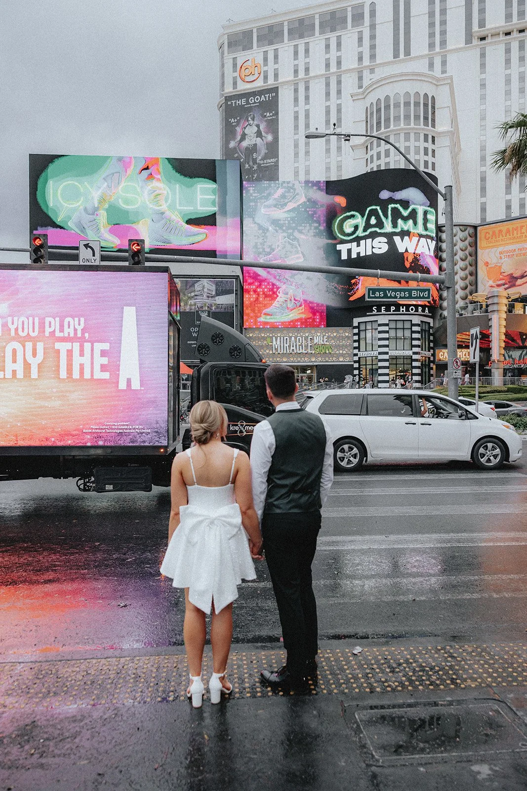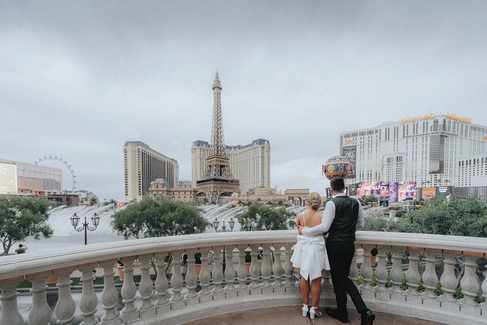 The next evening, we picked things back up in the heart of the Strip, and this part of the day was all about golden light, champagne bottles, and Vegas glitz. Claire slipped into a sparkly white mini dress that shimmered against the lights of the casinos, while Chris ditched the blazer and went full cool-guy-in-Vegas mode. The energy was different from the day before, looser, flirtier, and full of playful “we freaking did it!” energy. We wandered around Paris Las Vegas, with views of the Eiffel Tower and Bellagio fountains in the distance, soaking in those classic Vegas visuals. They cuddled up near fountains, danced under street lights, and looked completely smitten the whole way through. The night ended at The Flamingo, where the neon pink glow lit them up like the stars they are. You could feel how intentional this whole elopement was, not just in the way it was styled, but in how it gave them the freedom to stretch out the celebration. No rushing, no fuss. Just time to be present together, to celebrate in stages, and to savor it all.