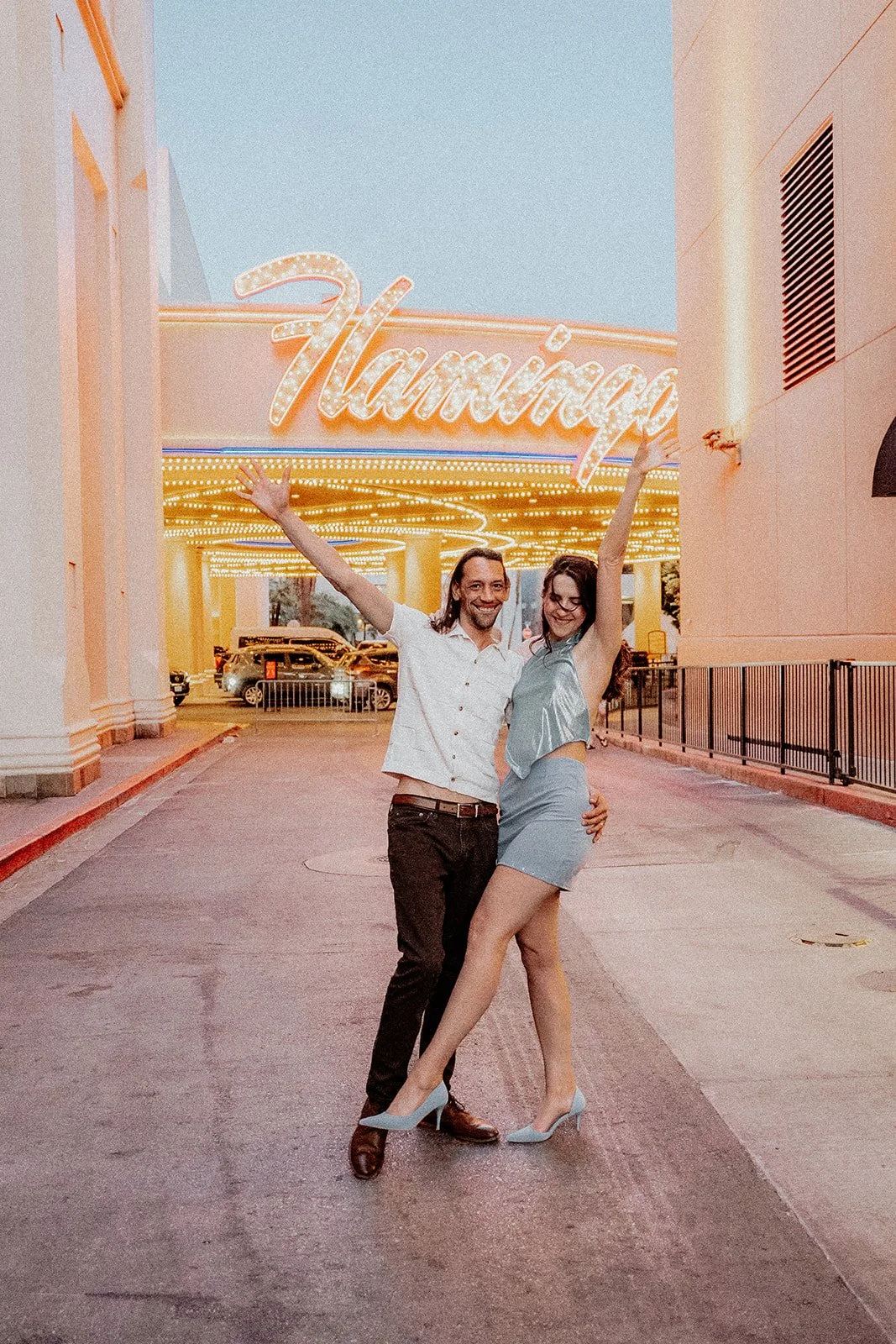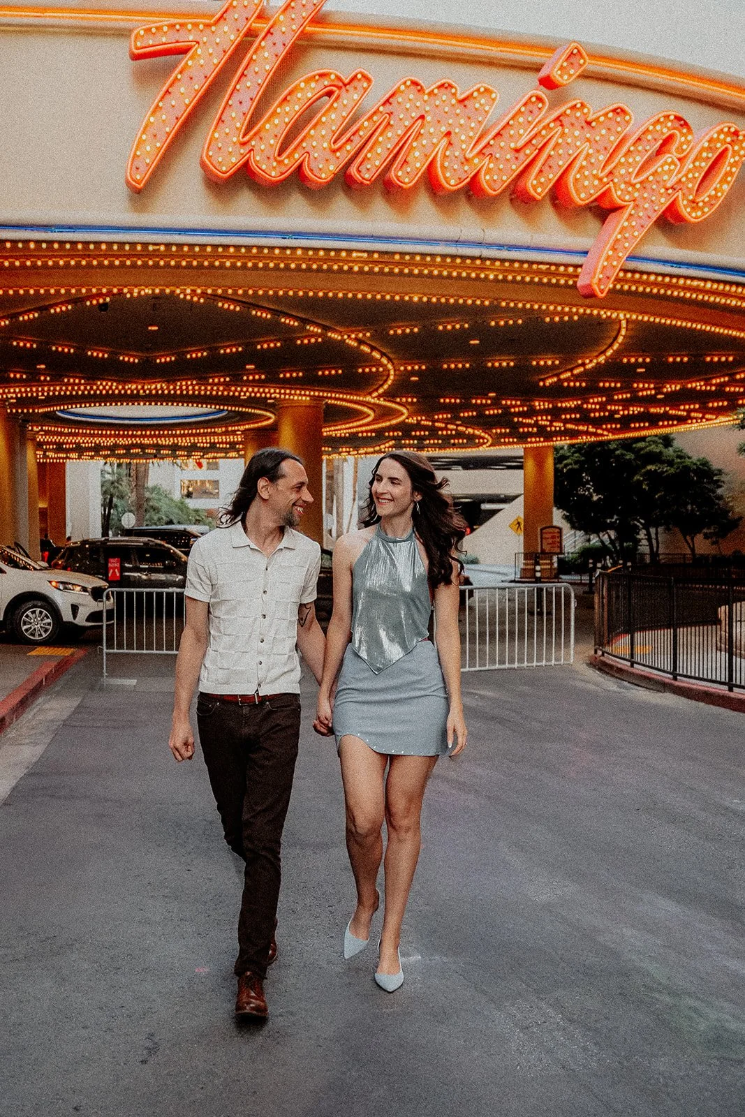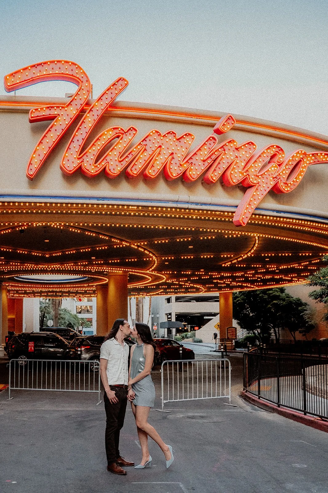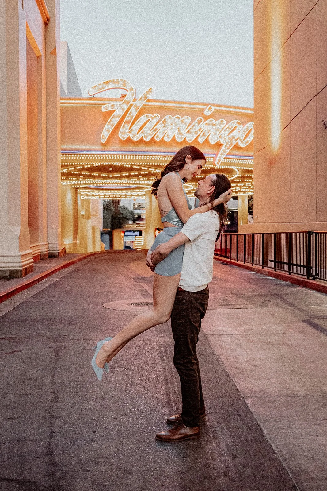 This was a short-and-sweet anniversary shoot on the Las Vegas Strip, but the photos? Major main character energy. The couple met up with Gina for a 30-minute session, and in that time they hit iconic spots like The Flamingo, Caesars Palace, and some dreamy golden-lit corners that felt cinematic and effortlessly cool. No outfit changes. No stress. Just love, connection, and that fluttery feeling of “wow, we’re really here together.”