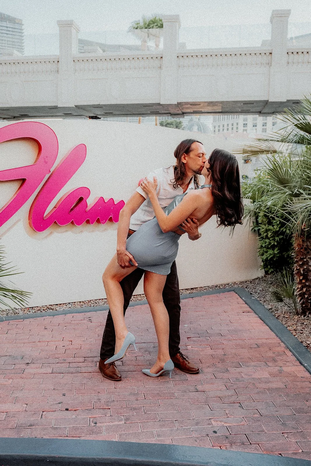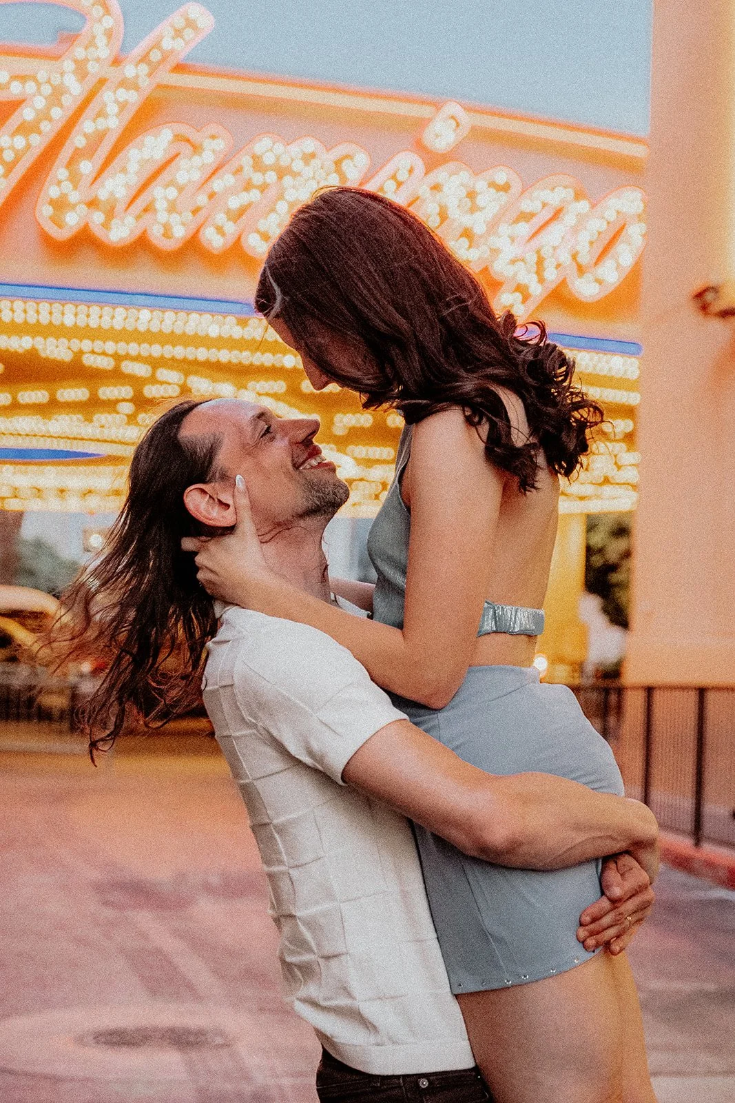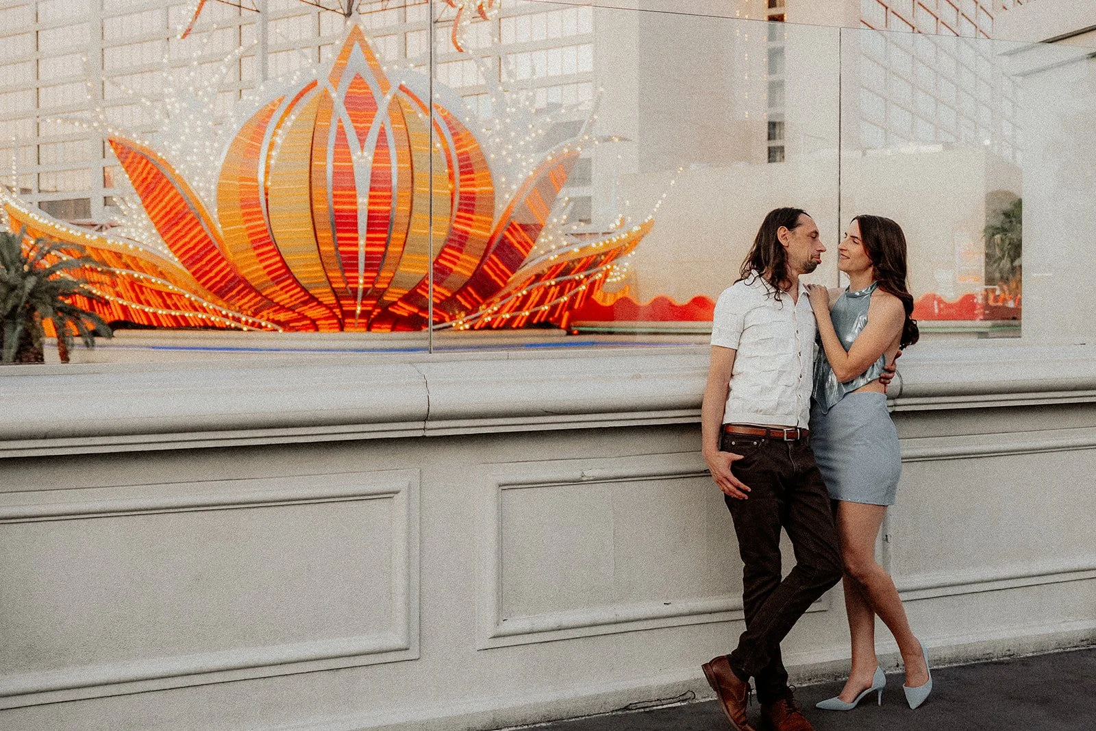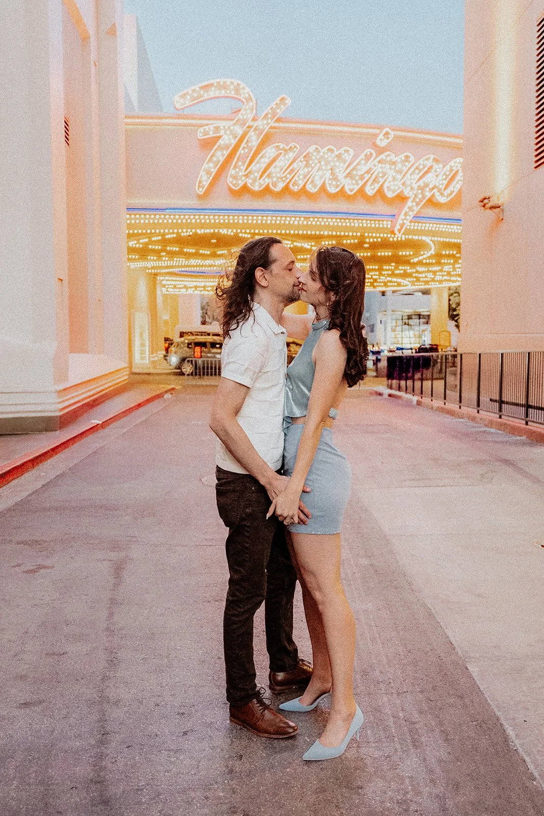 This was a short-and-sweet anniversary shoot on the Las Vegas Strip, but the photos? Major main character energy. The couple met up with Gina for a 30-minute session, and in that time they hit iconic spots like The Flamingo, Caesars Palace, and some dreamy golden-lit corners that felt cinematic and effortlessly cool. No outfit changes. No stress. Just love, connection, and that fluttery feeling of “wow, we’re really here together.”