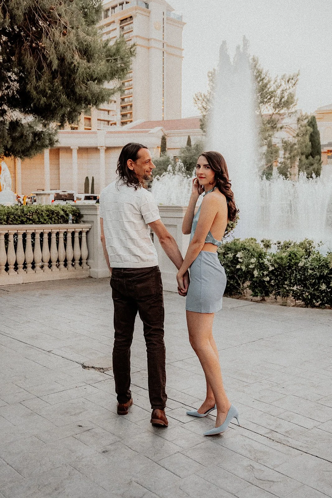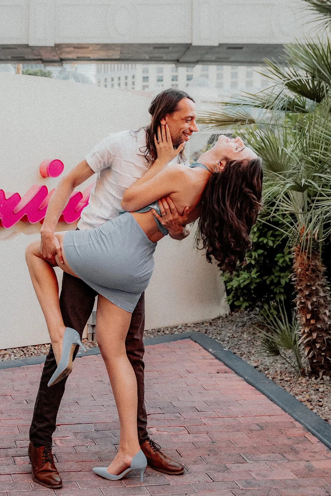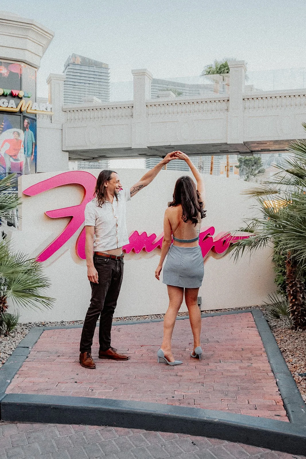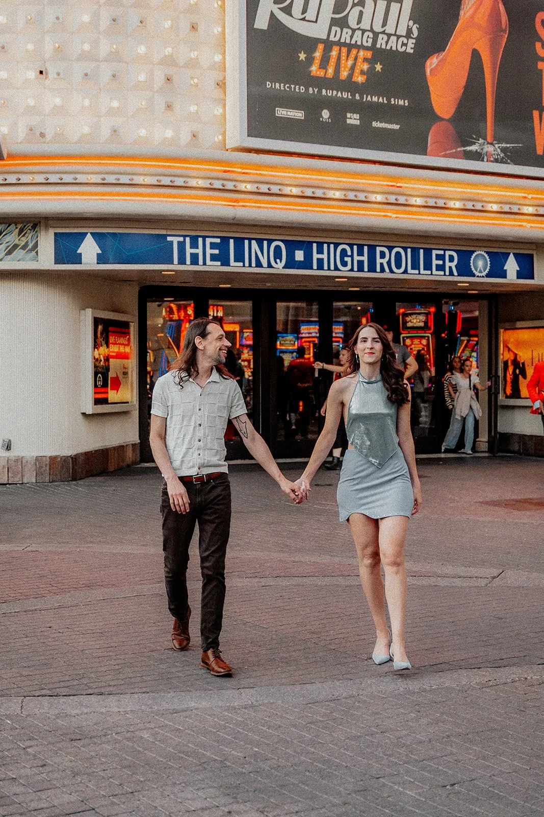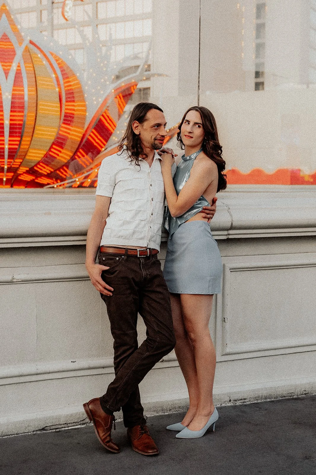 These two were celebrating their anniversary, but honestly, you don’t need a milestone to justify booking a couple session. Vegas is already a celebration why not turn that energy into something tangible you can look back on? These sessions are a little love letter to the right-now moments. The way you make each other laugh. The way your hands find each other without even thinking. The way it feels to be wildly, unapologetically you two.