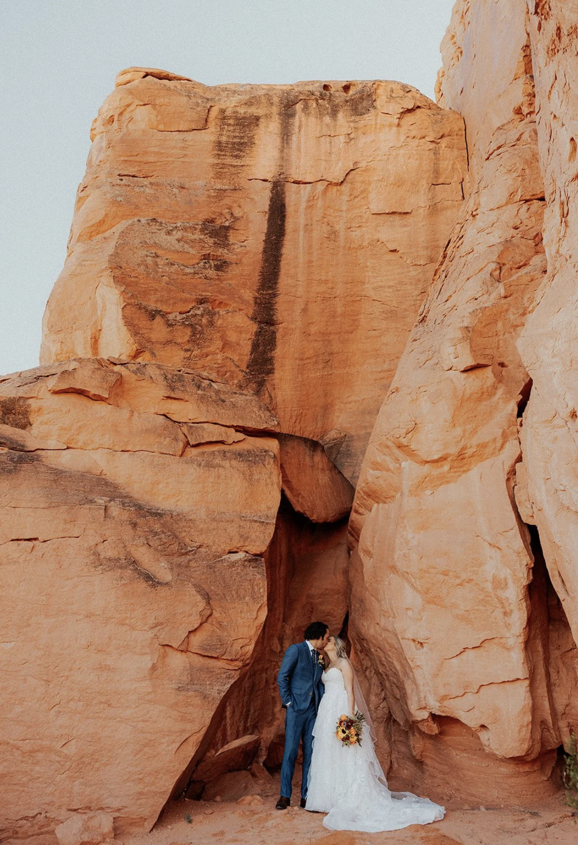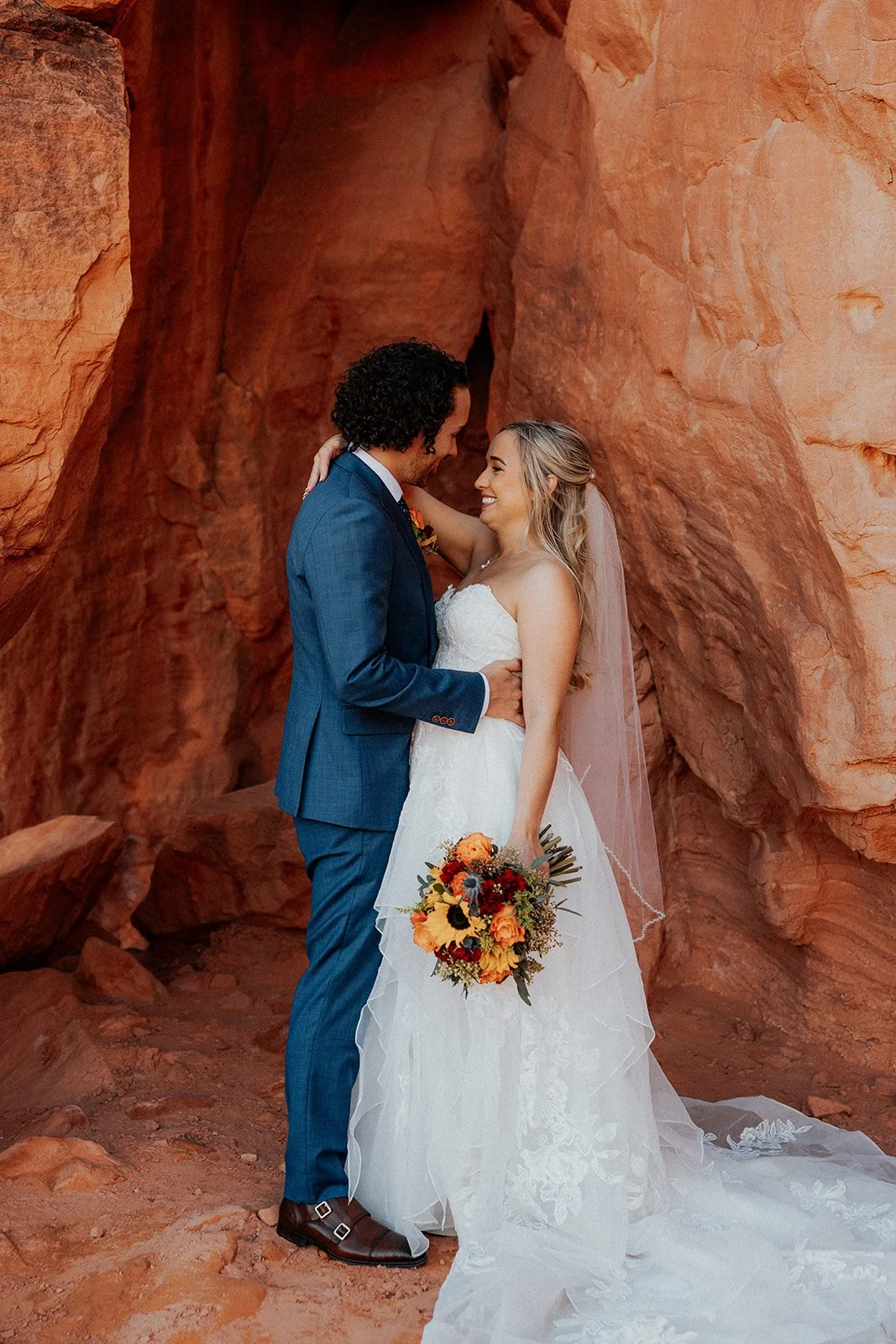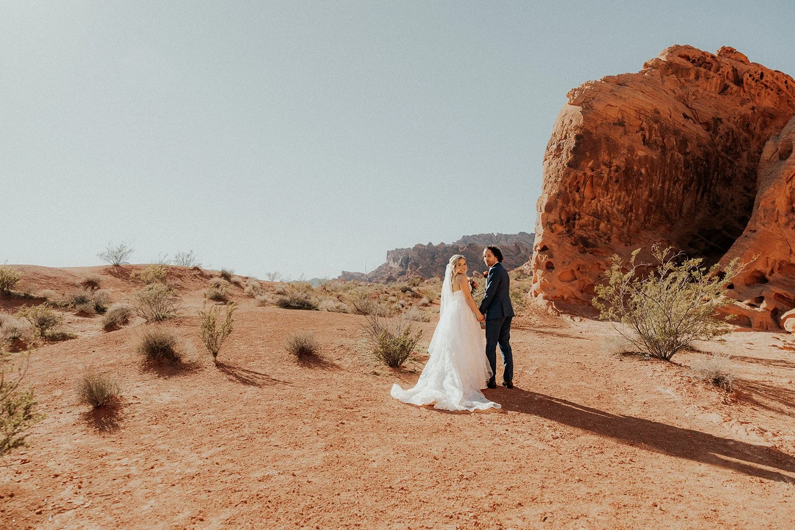 The best time to elope at Valley of Fire is during the spring (March to May) and fall (September to November) months. During these times, the weather is mild, and you’ll avoid the extreme summer heat or chilly winter months. Plus, the park’s natural beauty is at its peak with blooming wildflowers and clear skies! Make sure to check the weather for your desired elopement day so you can plan accordingly!