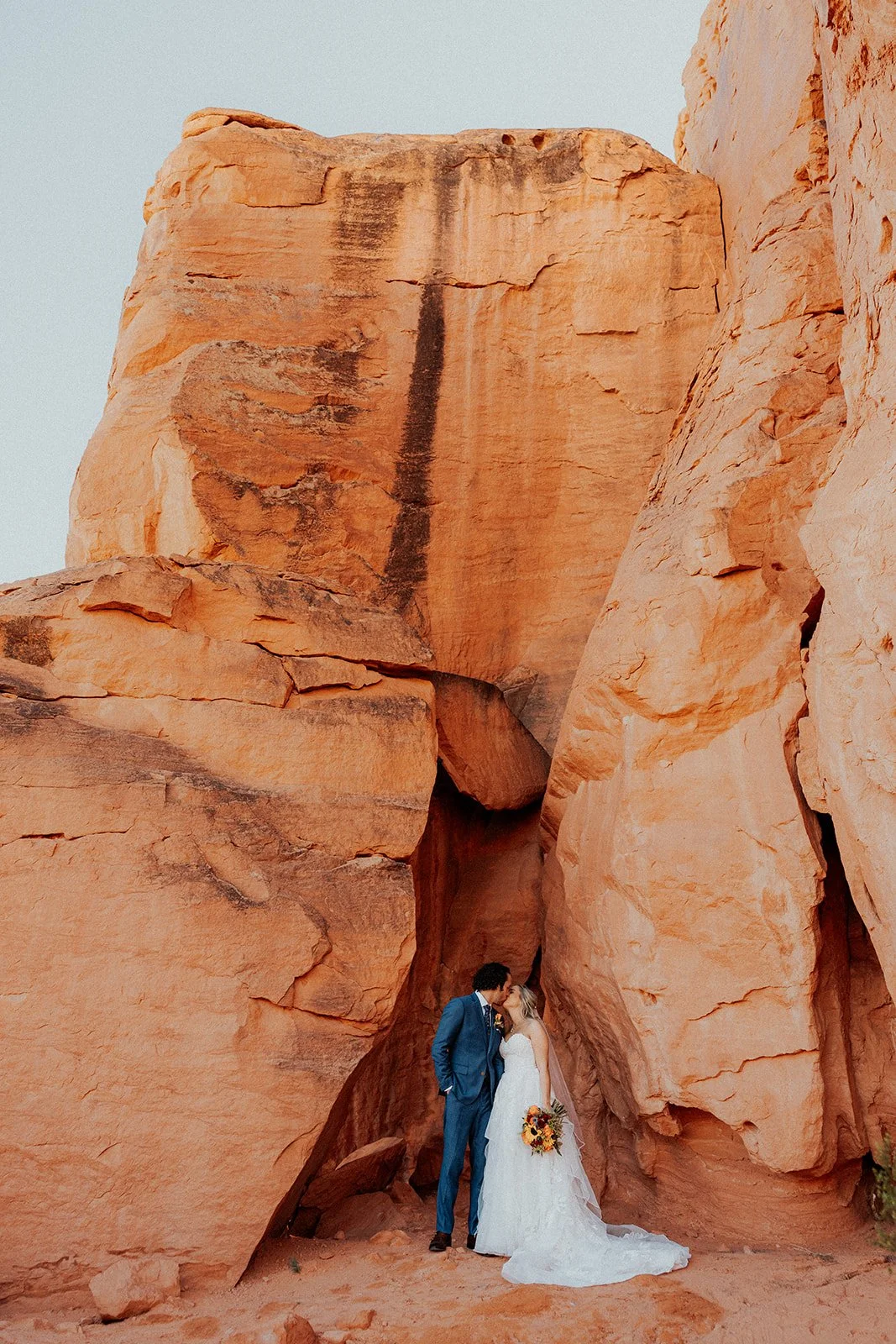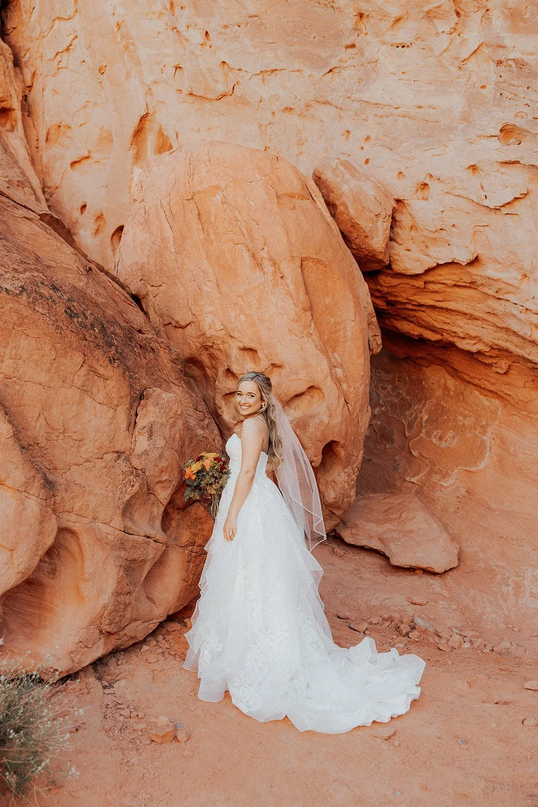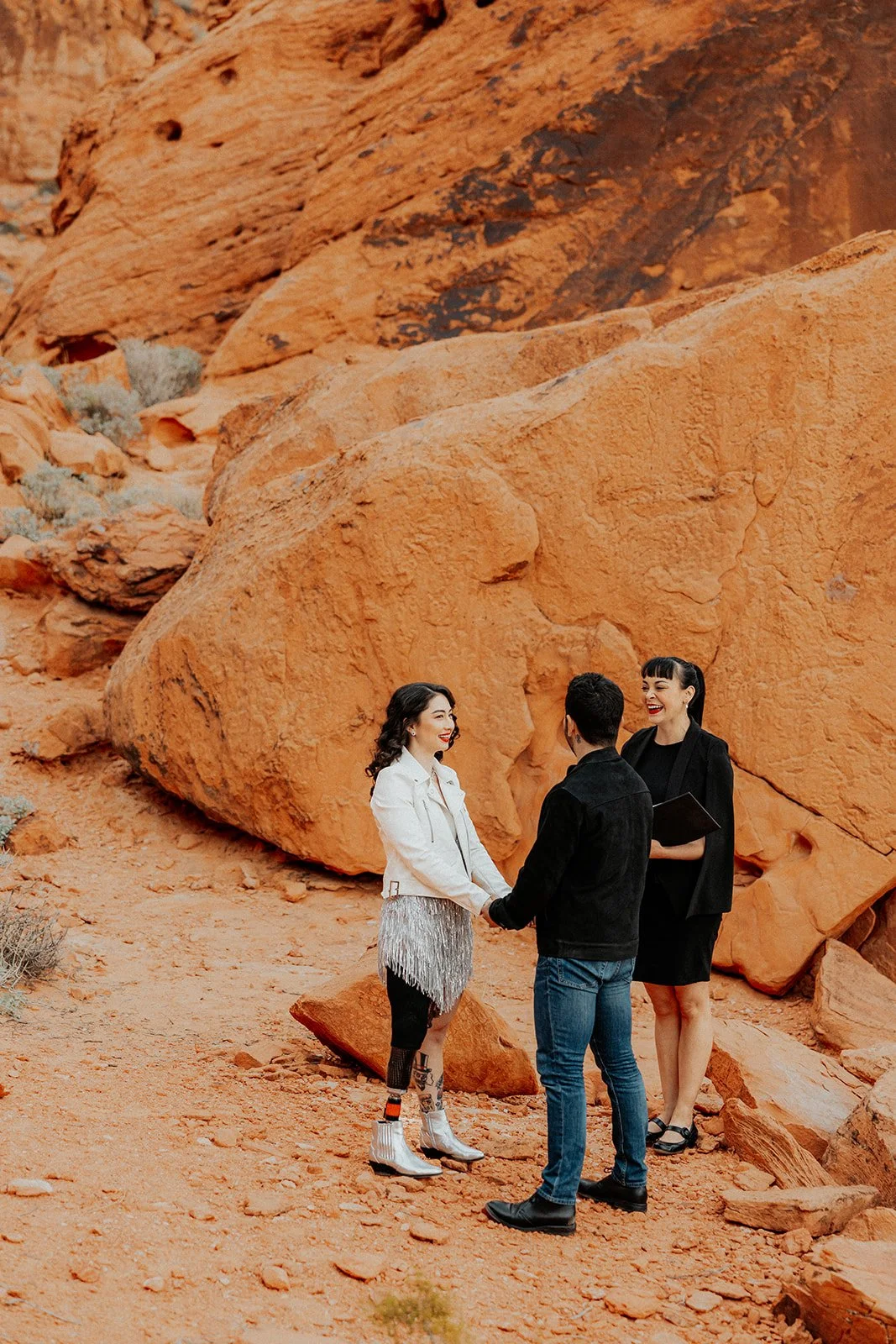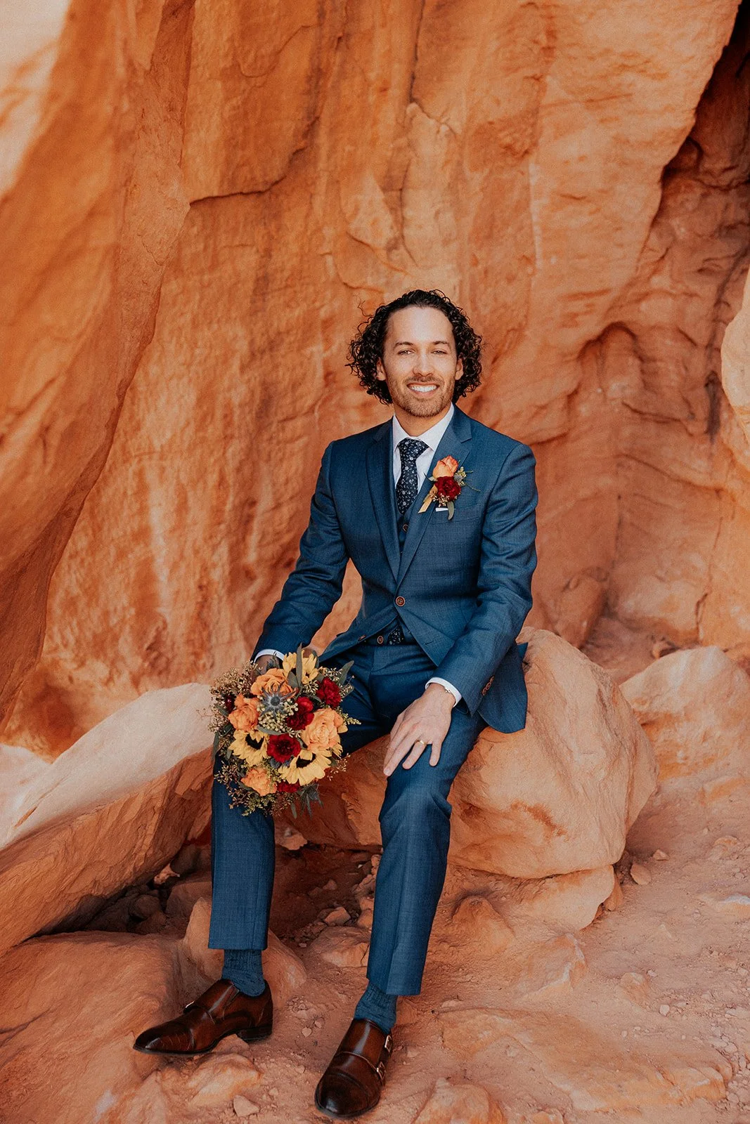 The best time to elope at Valley of Fire is during the spring (March to May) and fall (September to November) months. During these times, the weather is mild, and you’ll avoid the extreme summer heat or chilly winter months. Plus, the park’s natural beauty is at its peak with blooming wildflowers and clear skies! Make sure to check the weather for your desired elopement day so you can plan accordingly!